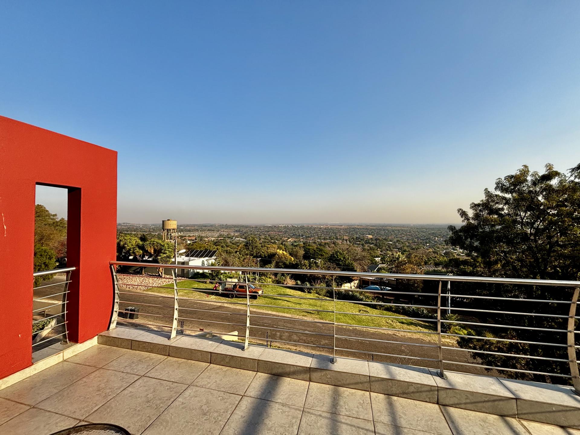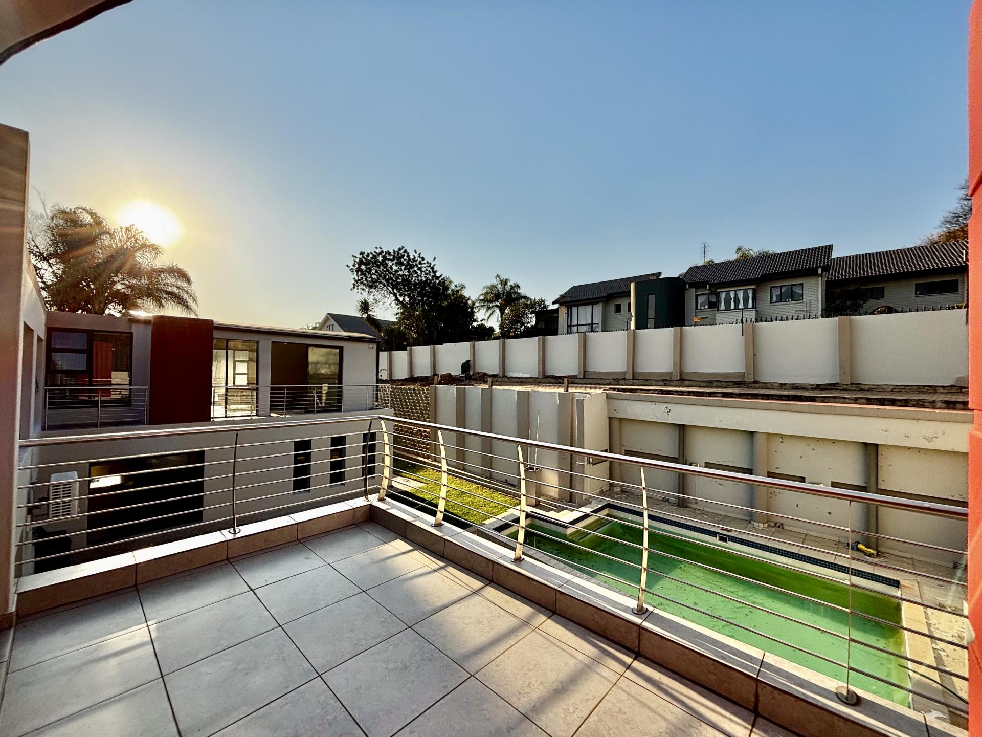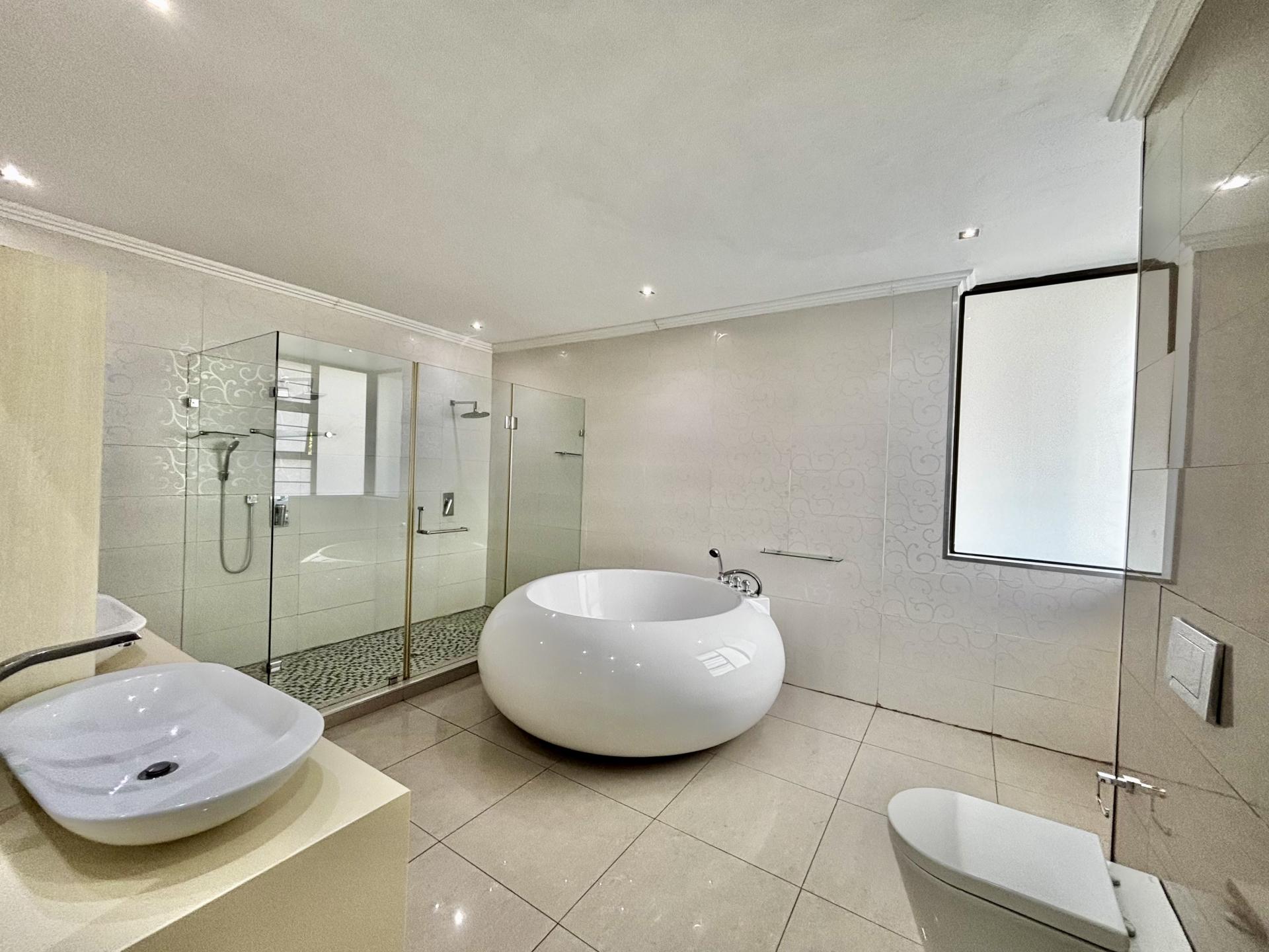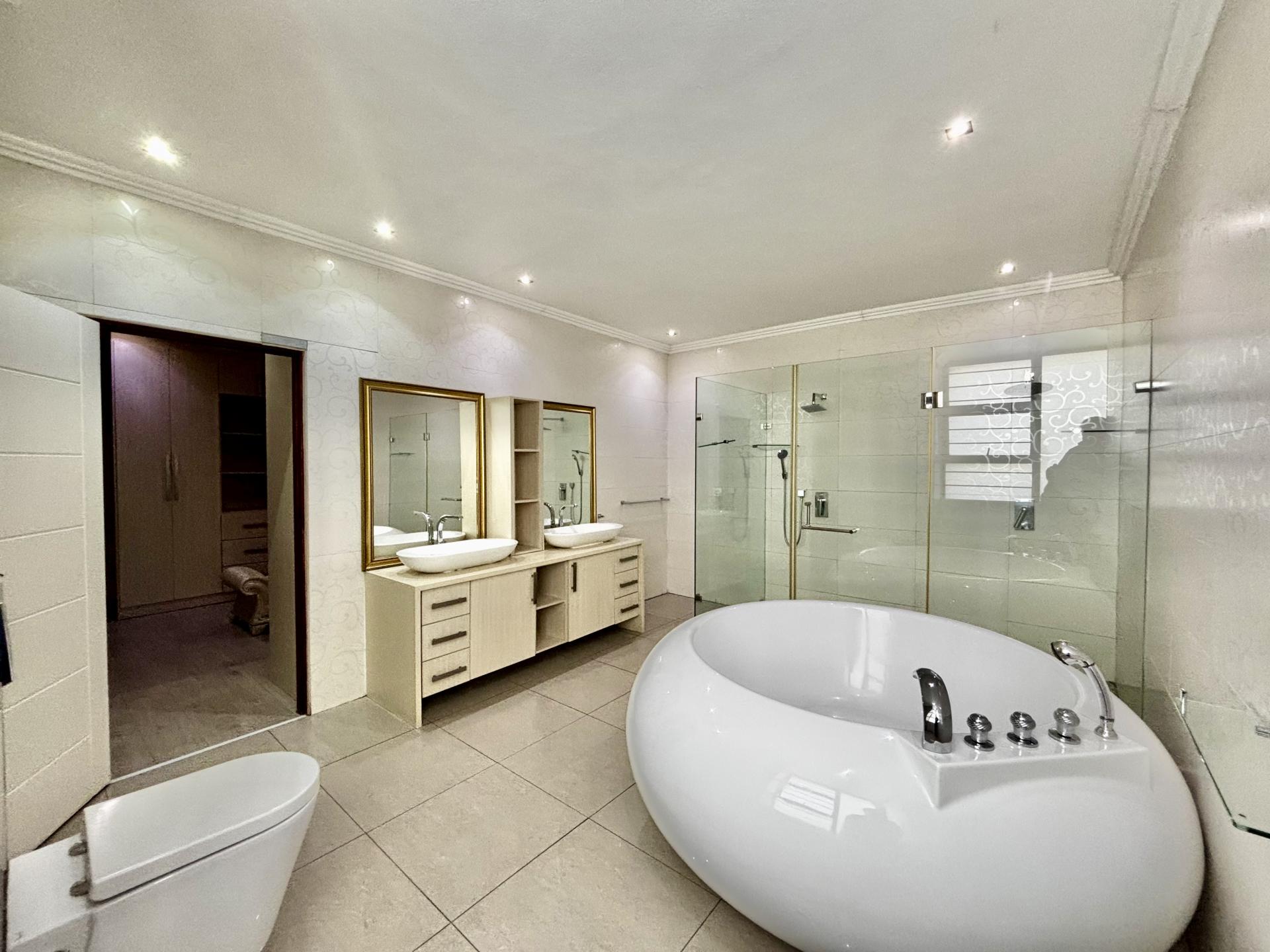 The sleek, ultra-modern kitchen is a chef’s dream, featuring premium appliances and seamless flow into a dining room built for grand gatherings. Upstairs, eight spacious bedrooms, each with its own luxurious en-suite bathroom, offer serene retreats. The upper-level rooms open onto a wide balcony, unveiling panoramic views of Waterkloof Ridge’s scenic beauty.