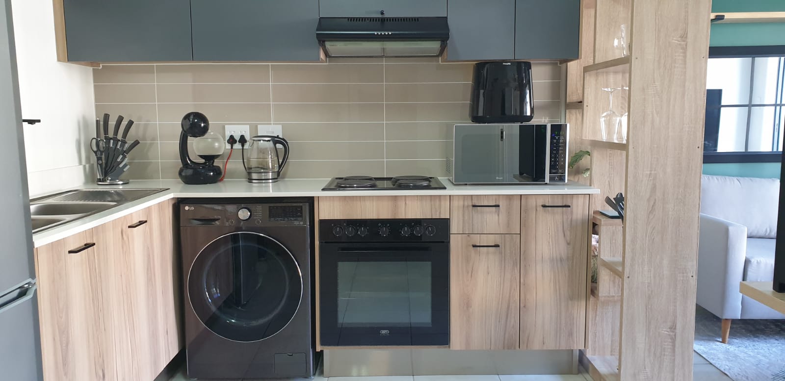 This property has extra special finishes. The kitchen has double sink, caesar-stone counter tops, under counter oven, electric hob and extractor fan.