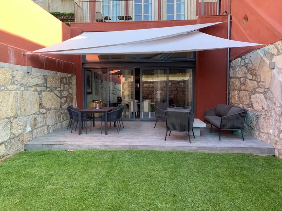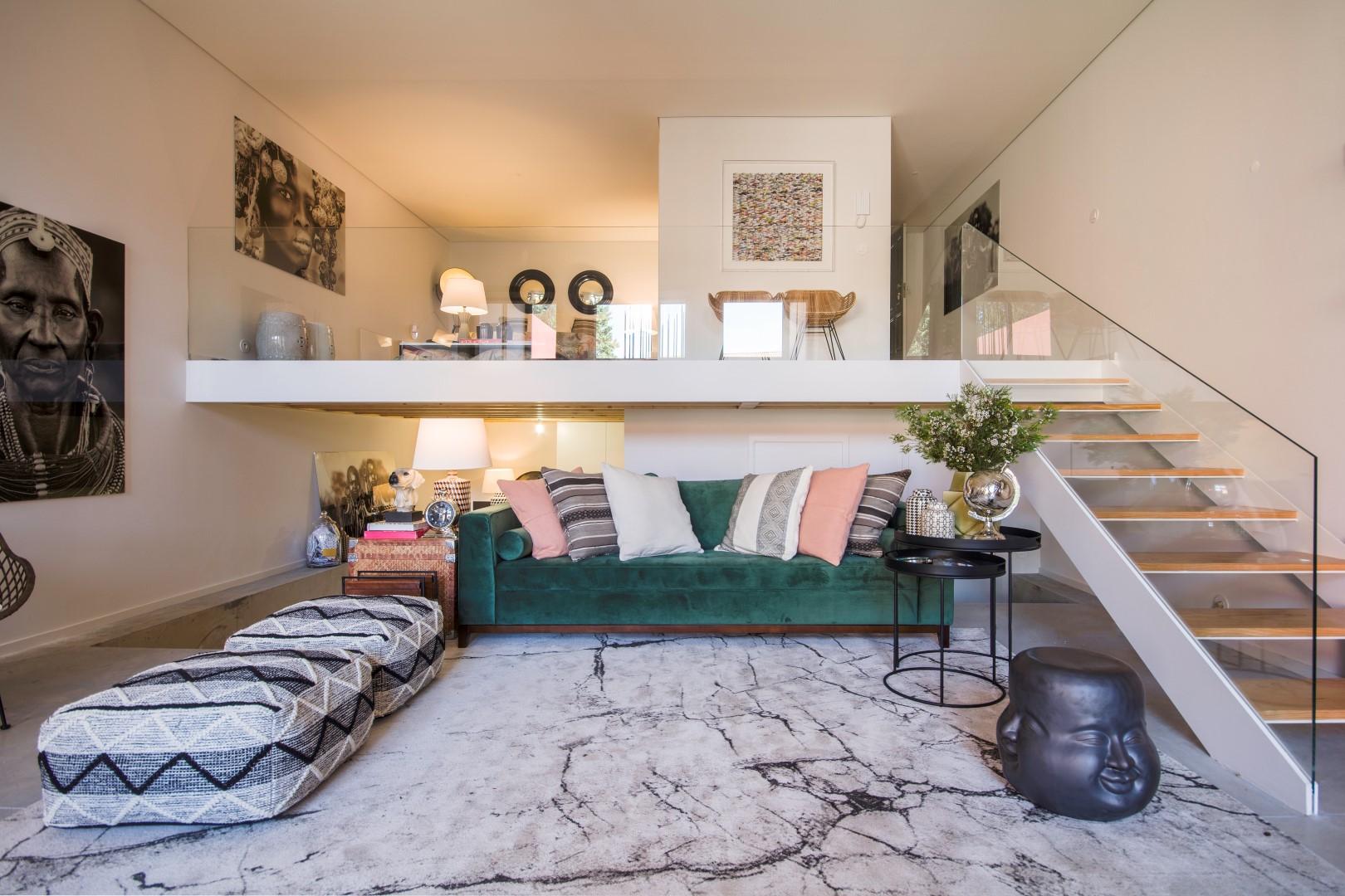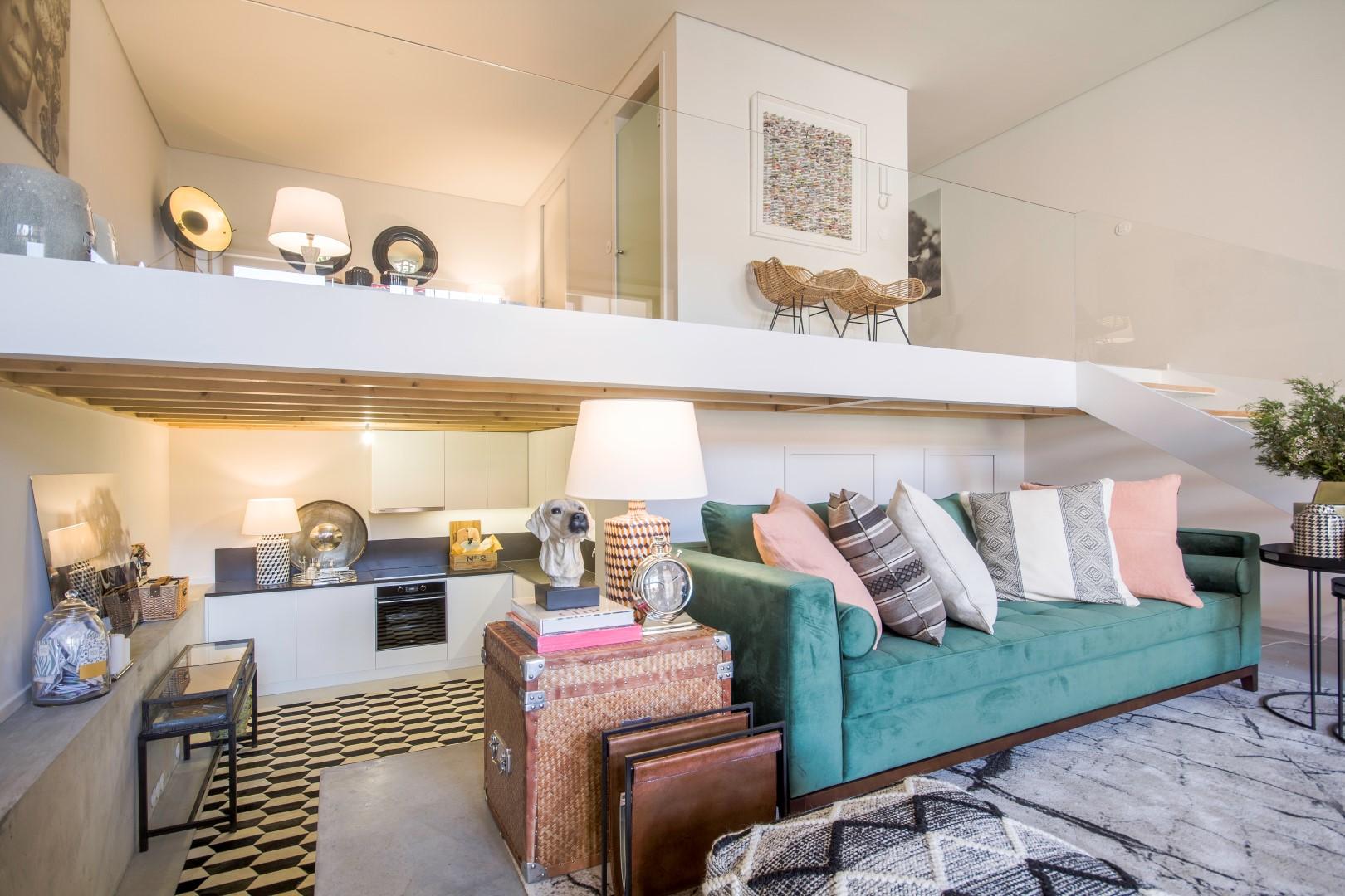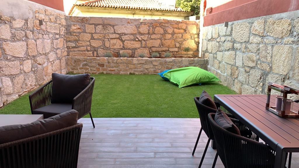 Duplex apartment in Porto´s downtown. This T0 + 1 typology apartment with 118.30 sqm comprises an open and bright mezzanine facing the living room and garden with 70.83sqm, two bathrooms, storage space, laundry, and an equipped kitchen. The living room and kitchen floors are in polished cement.