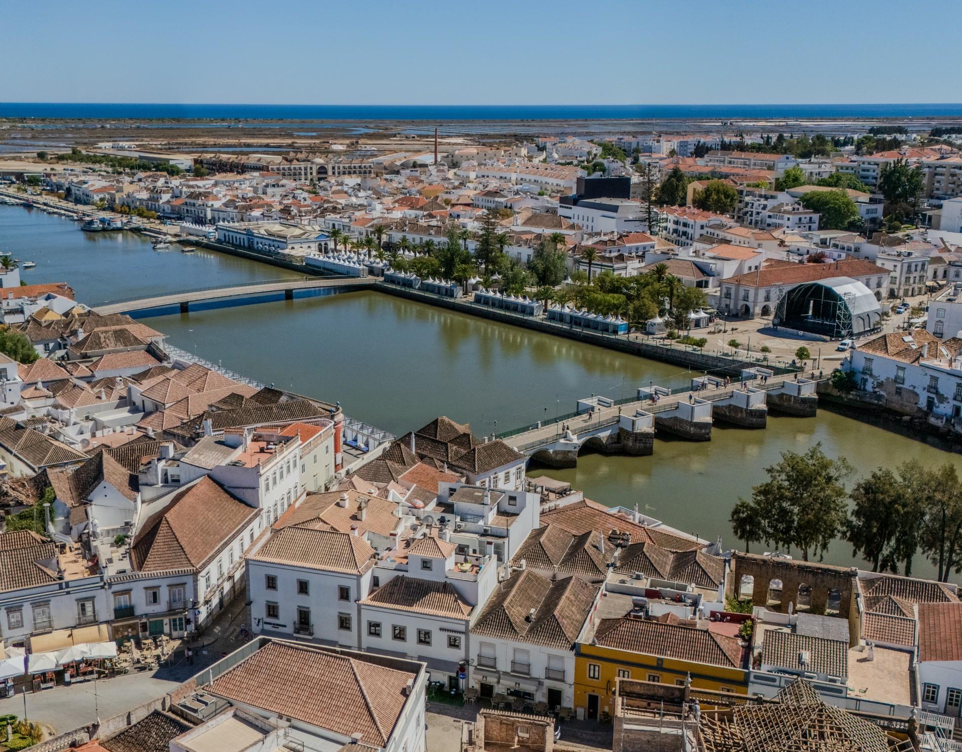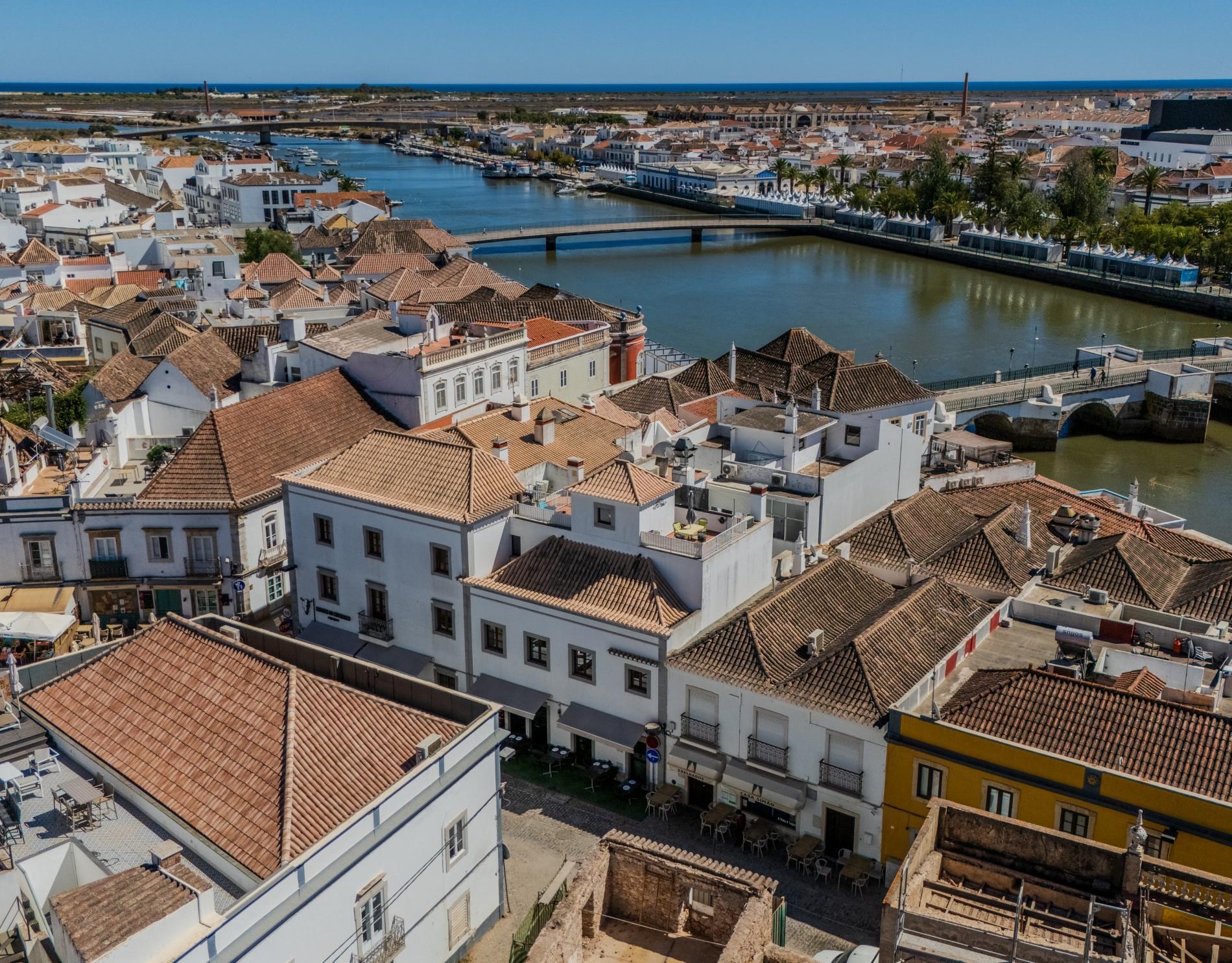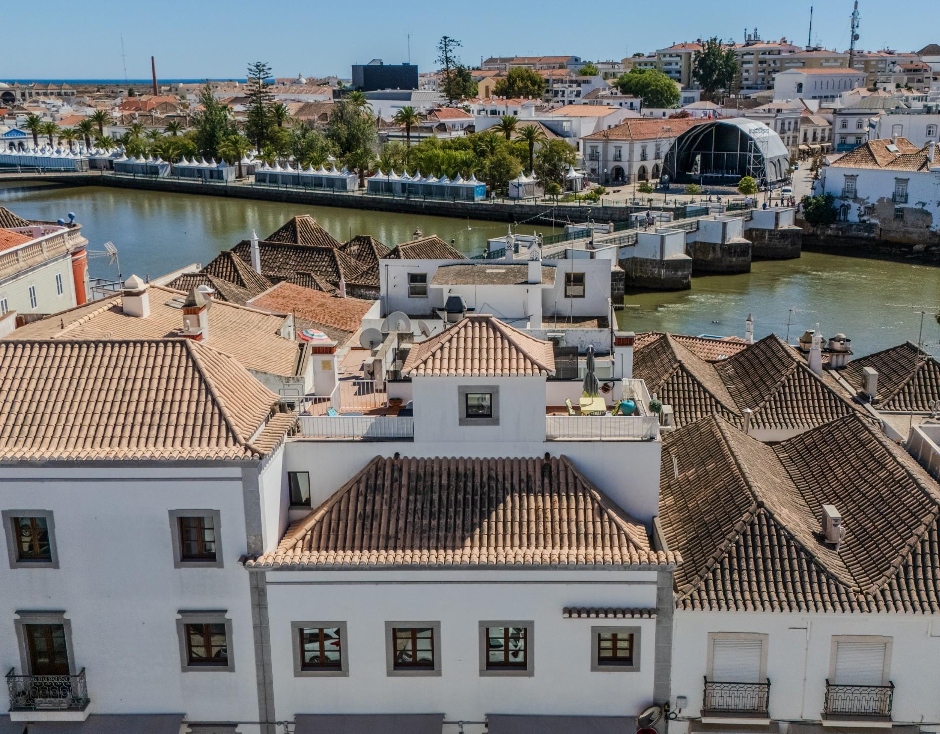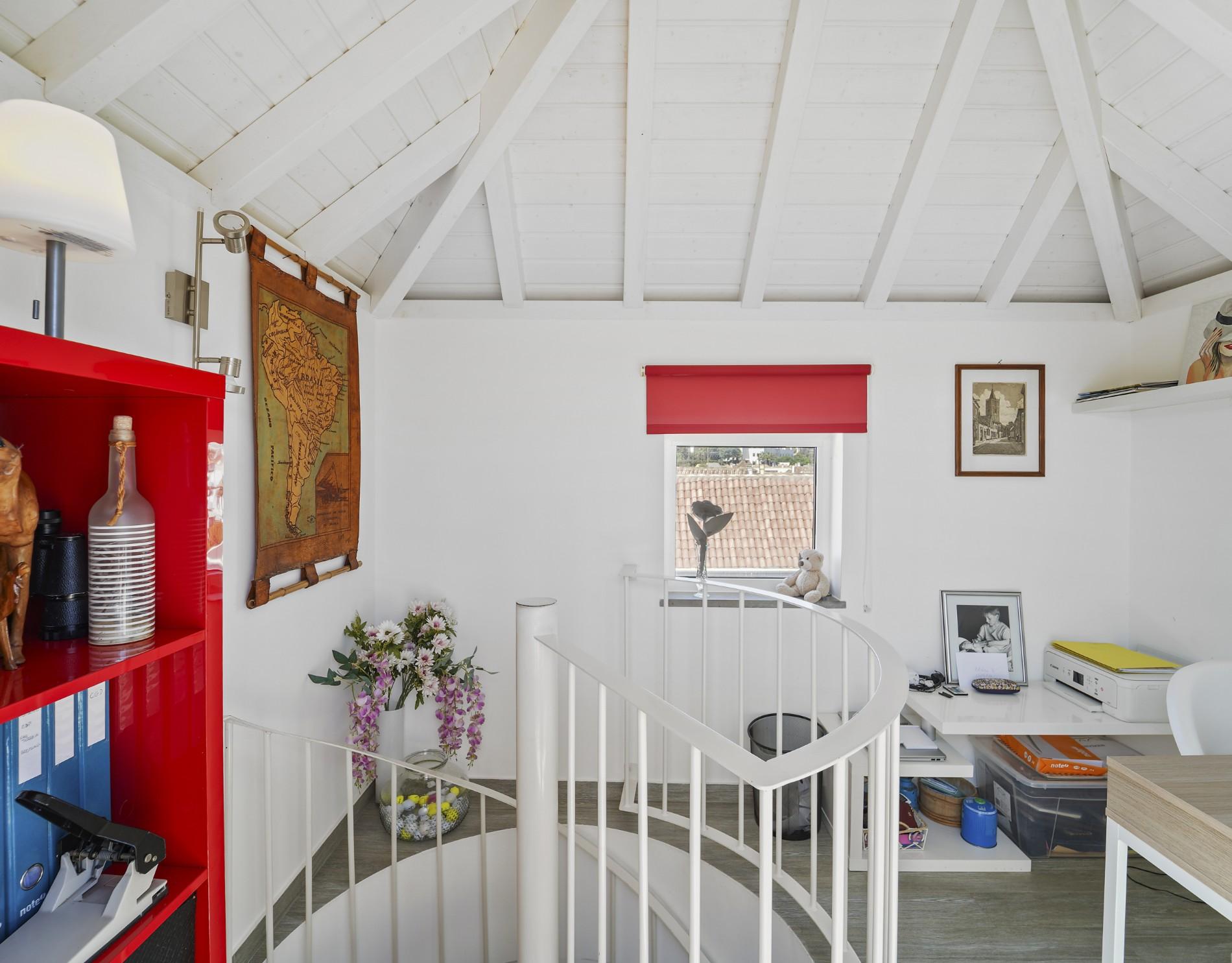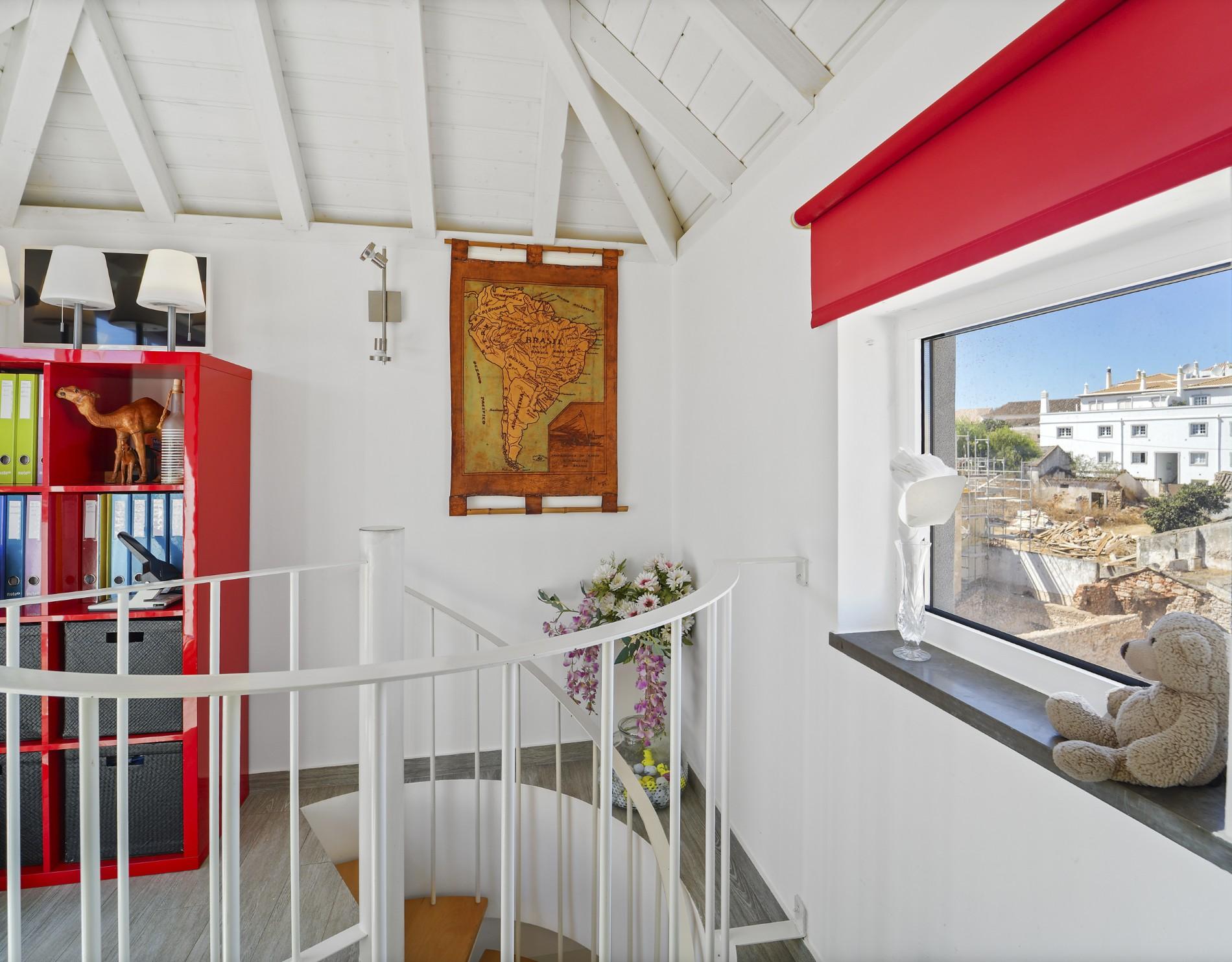 Uma escada em caracol conduz a uma área versátil de escritório no piso superior, com acesso direto ao terraço privado da cobertura através de portas de correr em vidro. Este espaço exterior é um dos pontos altos do imóvel, proporcionando vistas panorâmicas sobre Tavira e oferecendo um excelente ambiente para receber convidados, relaxar ou trabalhar a partir de casa. O ar condicionado reversível em toda a casa garante conforto durante todo o ano.