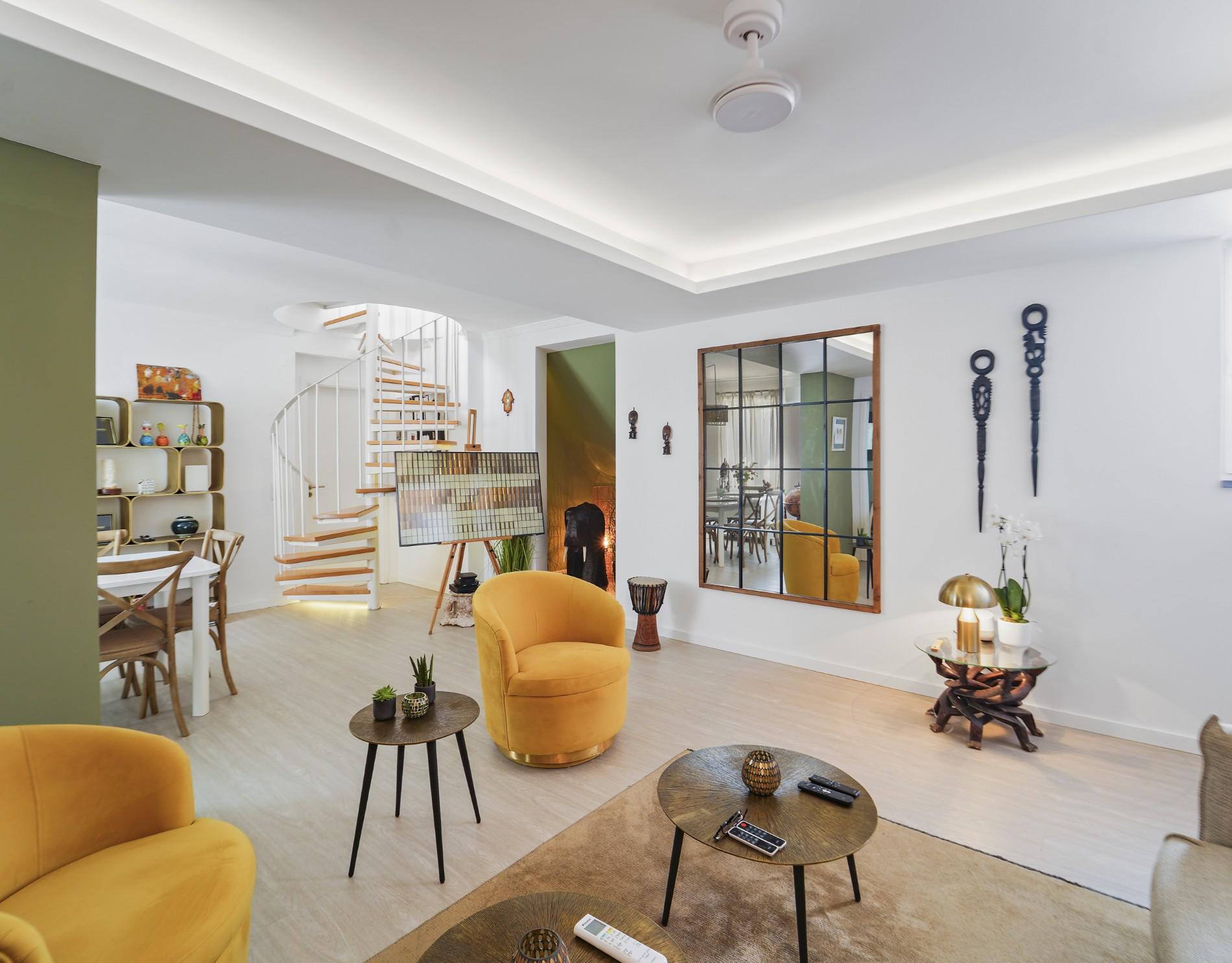 Eine Wendeltreppe führt zu einem vielseitigen Bürobereich im Obergeschoss, der durch Schiebetüren direkt auf die private Dachterrasse öffnet. Dieser Außenbereich ist ein Highlight der Immobilie und bietet Panoramablick über Tavira – perfekt zum Unterhalten, Entspannen oder Arbeiten von zu Hause. Eine reversible Klimaanlage in der gesamten Wohnung sorgt das ganze Jahr über für Komfort.