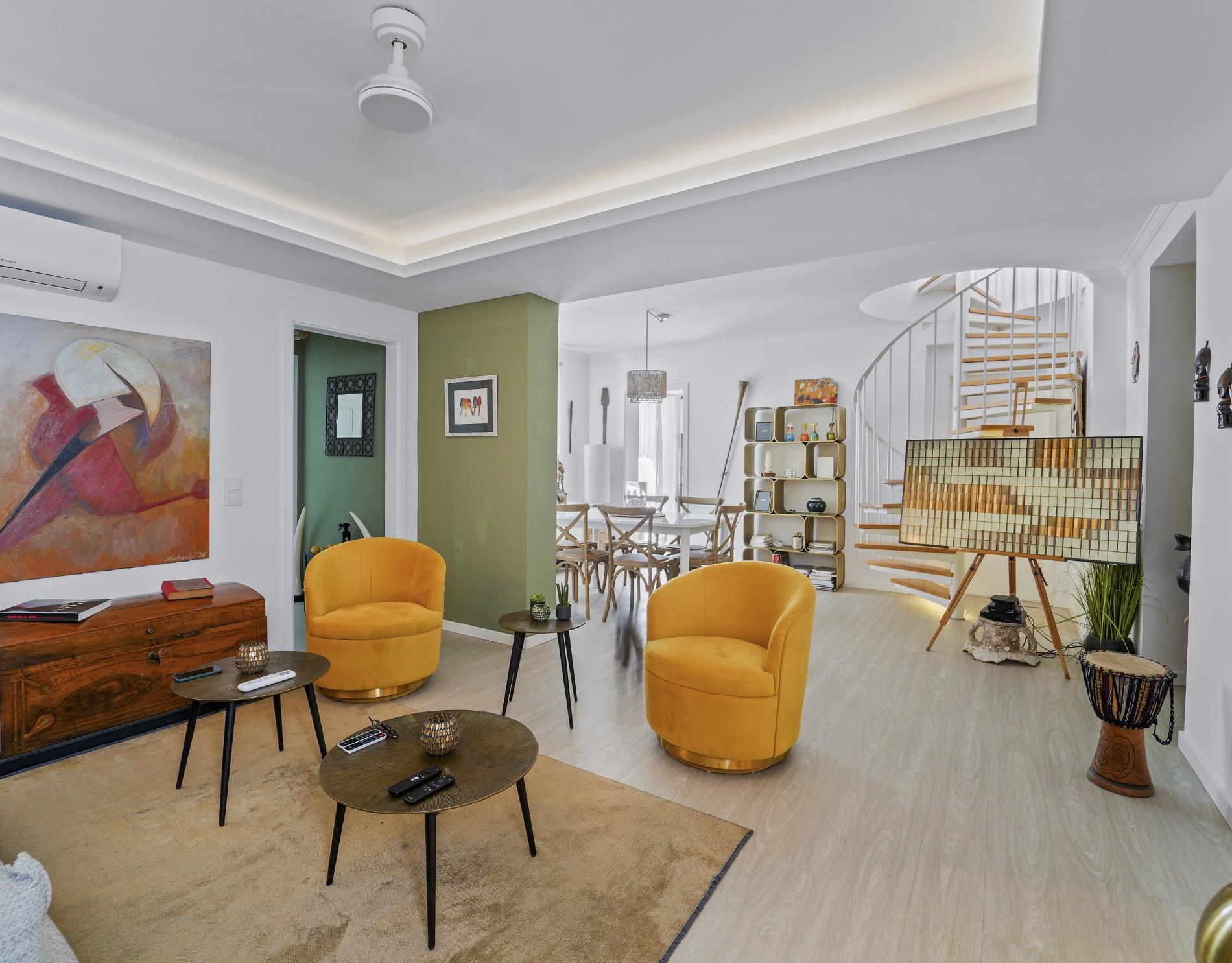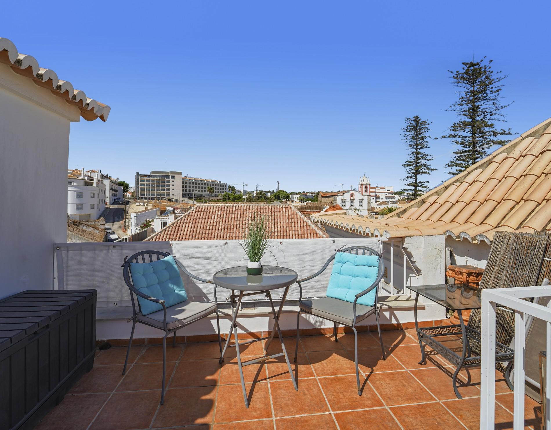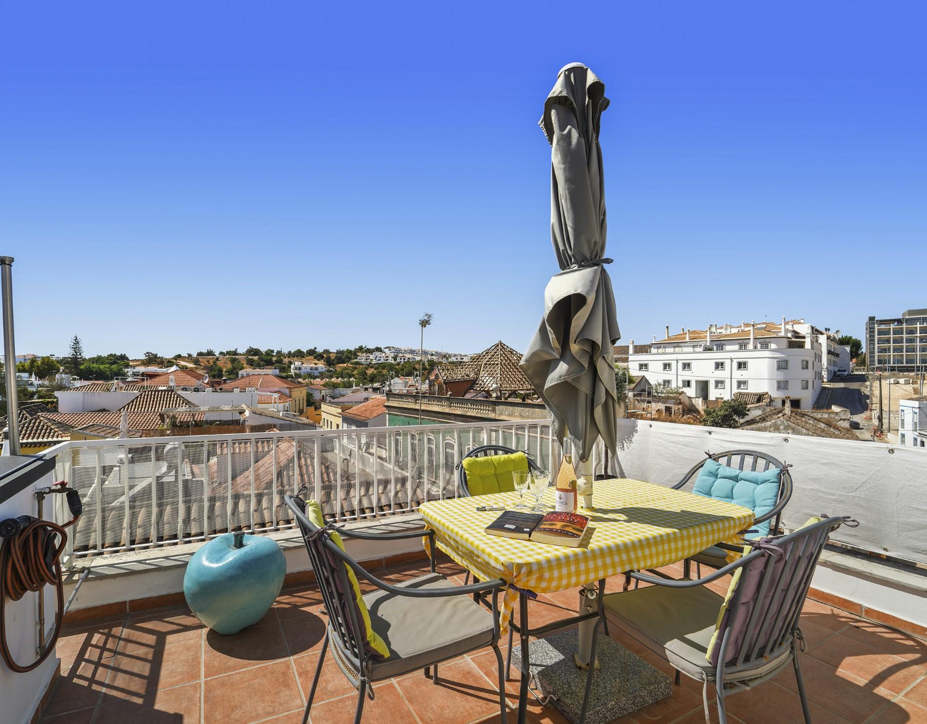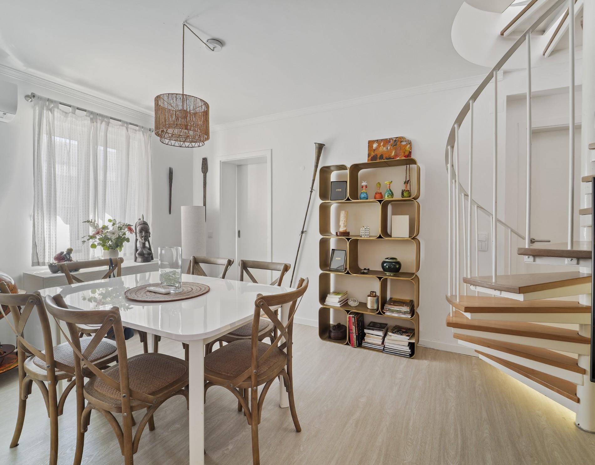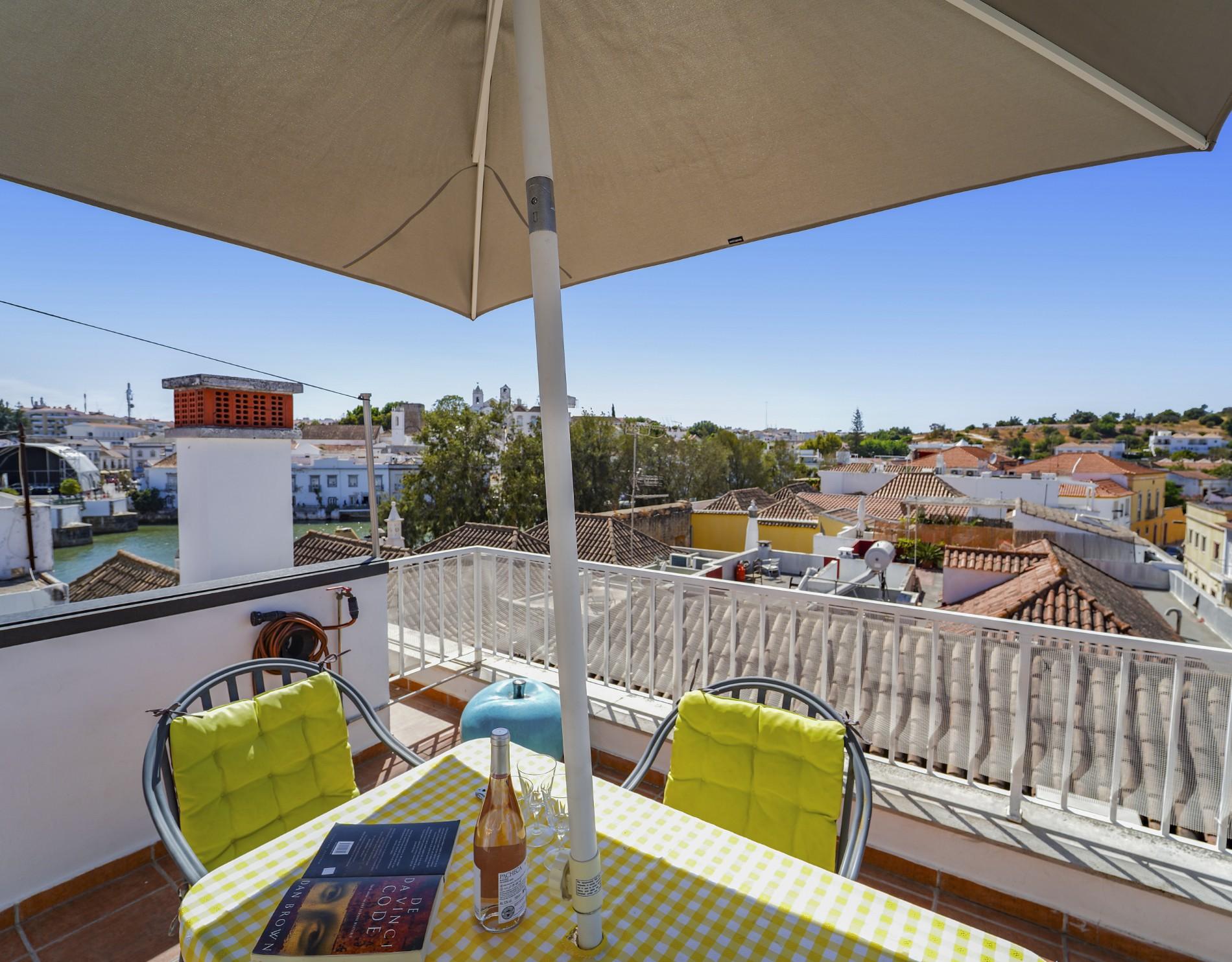 Un escalier en colimaçon mène à un bureau polyvalent à l’étage supérieur, ouvrant directement sur la terrasse privée par des baies vitrées coulissantes. Cet espace extérieur est l’un des atouts majeurs du bien, offrant des vues panoramiques sur Tavira et constituant un cadre idéal pour recevoir, se détendre ou travailler à domicile. La climatisation réversible dans tout l’appartement assure un confort toute l’année.