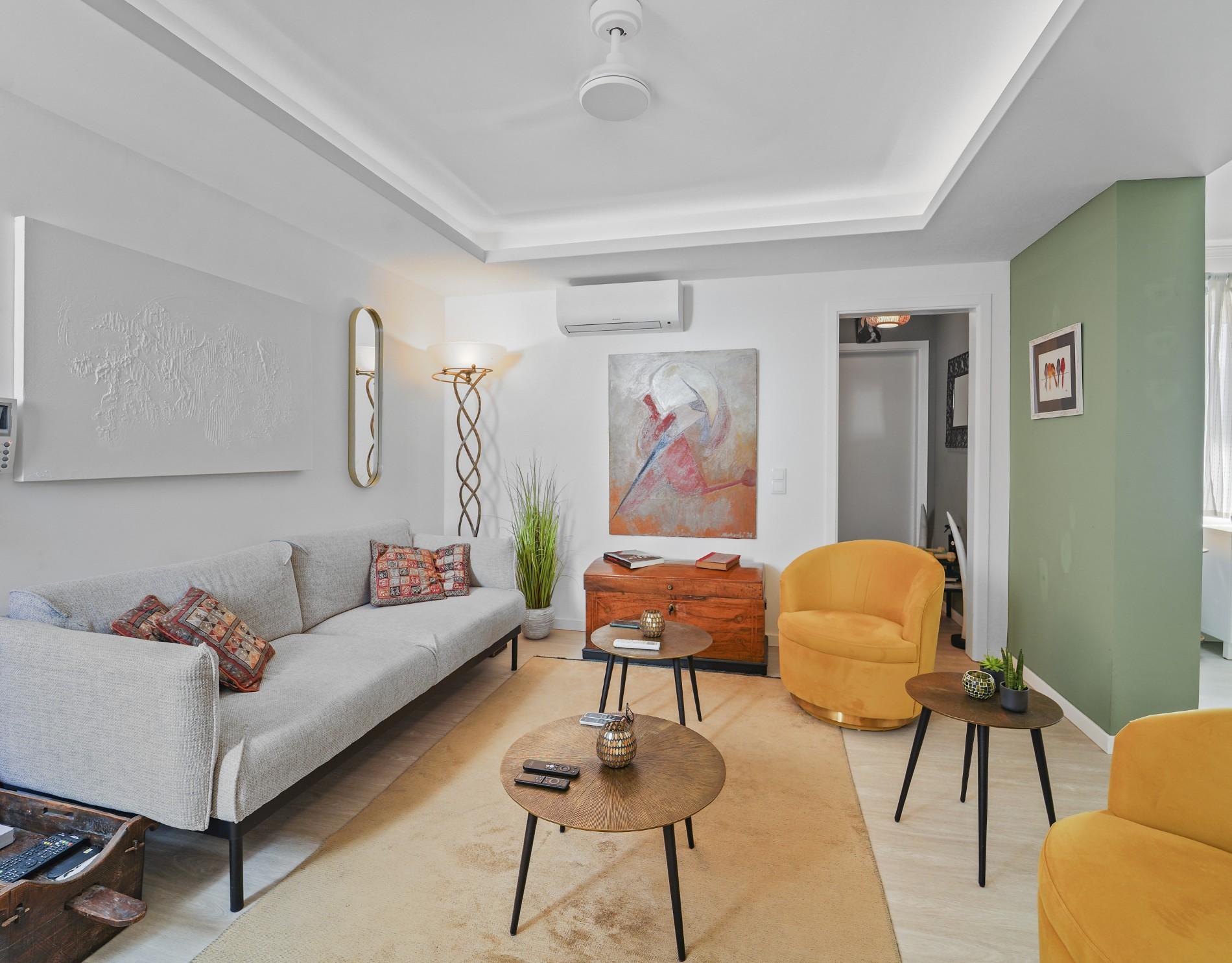 The apartment offers 115 m² of bright, well-proportioned living space. The main level includes a spacious living room, a fitted kitchen with separate pantry and small terrace, and a comfortable bedroom with built-in mirrored wardrobes. A hidden nook provides additional flexibility, ideal as a children’s area, reading corner, or guest space.