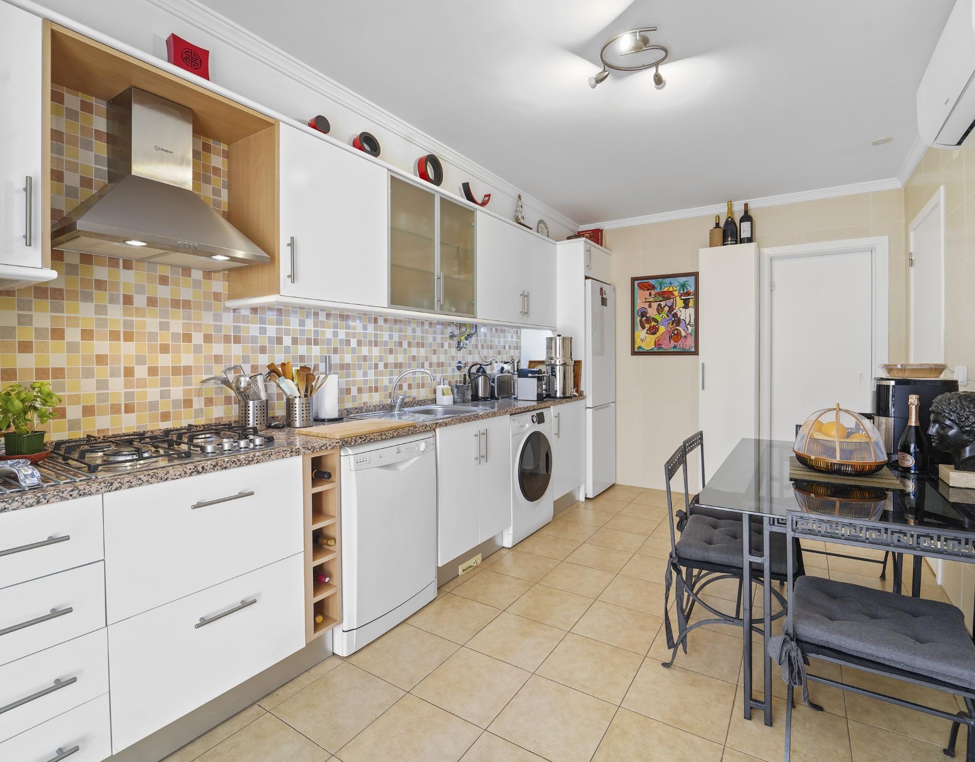 O apartamento oferece 115 m² de área habitacional luminosa e bem distribuída. O piso principal inclui uma ampla sala de estar, uma cozinha equipada com despensa separada e pequeno terraço e um quarto confortável com roupeiros embutidos espelhados. Um recanto discreto oferece flexibilidade adicional, ideal como zona infantil, canto de leitura ou espaço para hóspedes.