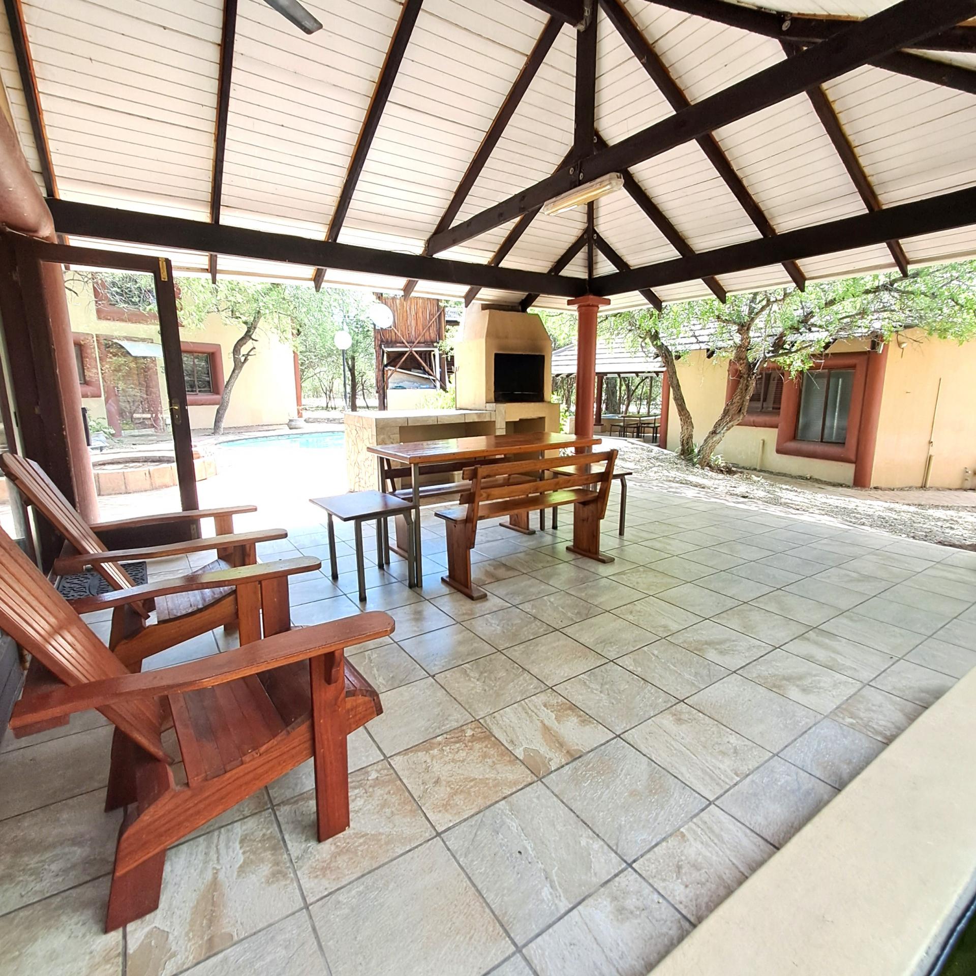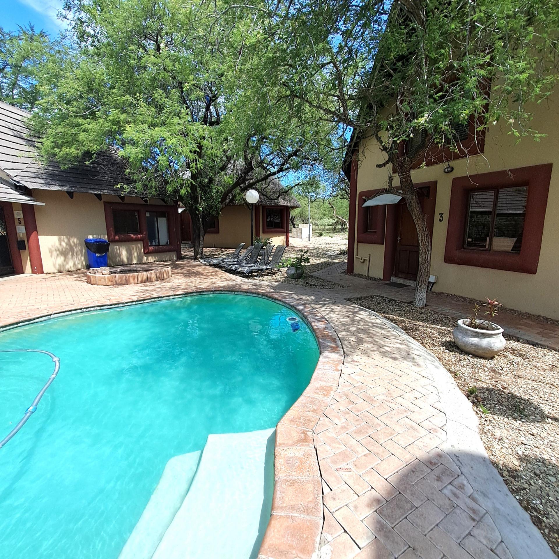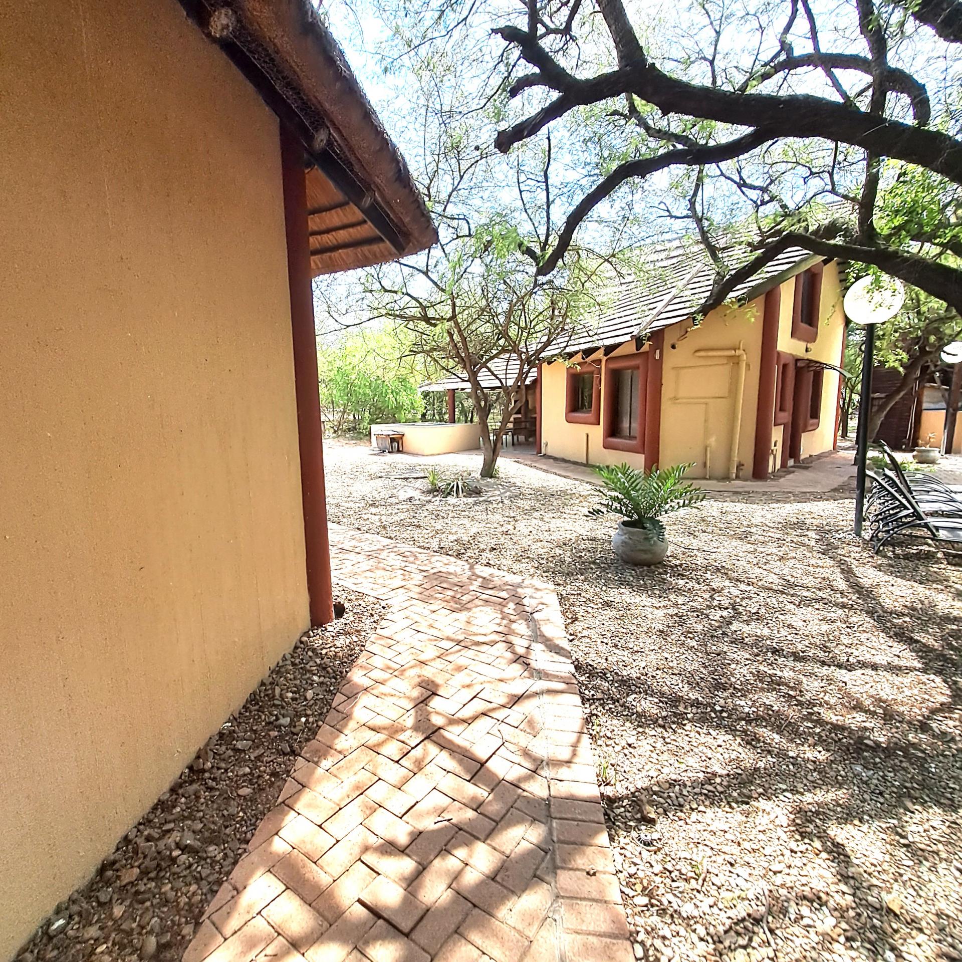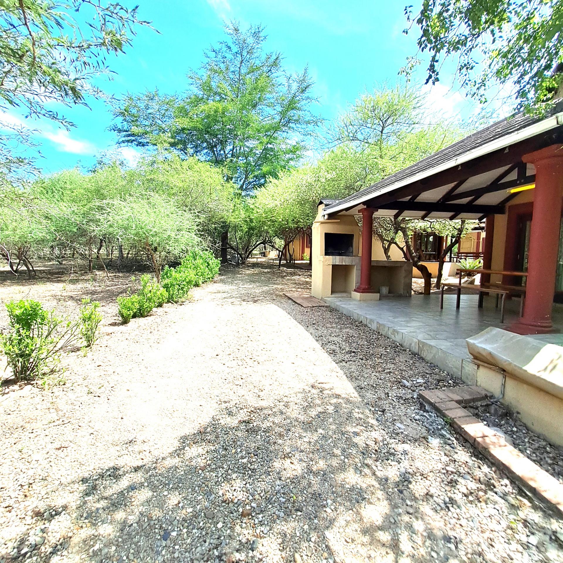 Lock stock and barrel, these 4 separate units are fully equipped, very neat, and a delight to the eye in Marloth Park. They can immediately be operated as a business. The 5th unit is a shared kitchen. Bookings are already confirmed untill October 2025 and will be included for the buyer. In total there are 20 beds, each unit has its own small cooling pool, a braai on the patio, and a small kitchenette with the essentials, as there is a large shared kitchen with excellent facilities, a dining area, and a covered patio and a stove for guests convenience to prepare delicious meals before eating in their own units. There is a large swimming pool and a braai for all guests to use, and many wild animals constantly pass through the area which can be viewed.from your patio. All the units have two air conditioners and lovely bathrooms each with showers. All outdoor areas have pathways for walking, each with its own splash pool and a braai a separate storage room for bedding, and a place to store gas bottles. The property includes a 5000-liter water tank, a borehole and outdoor lights that illuminate the entire area. The electricity supply is excellent, making this a true gem of a place in the bush. The kitchenetts consist of a toaster, kettle, microwave