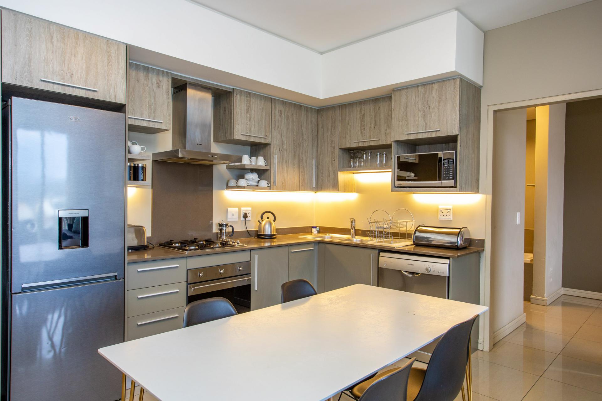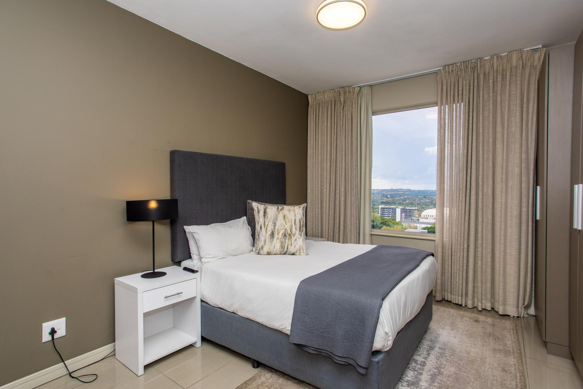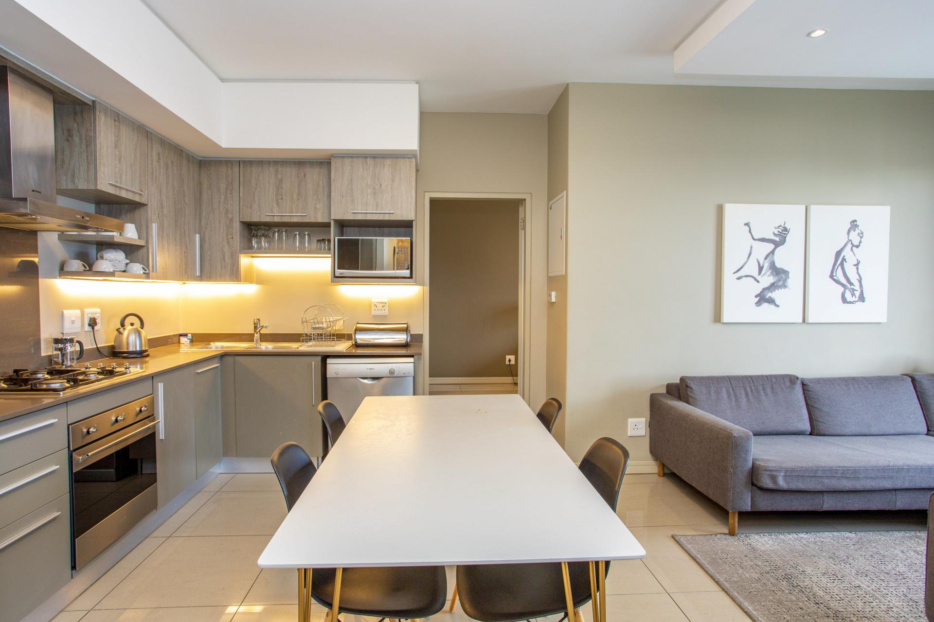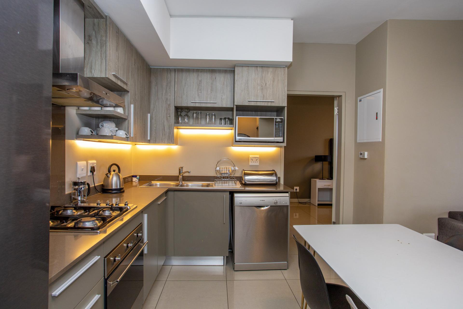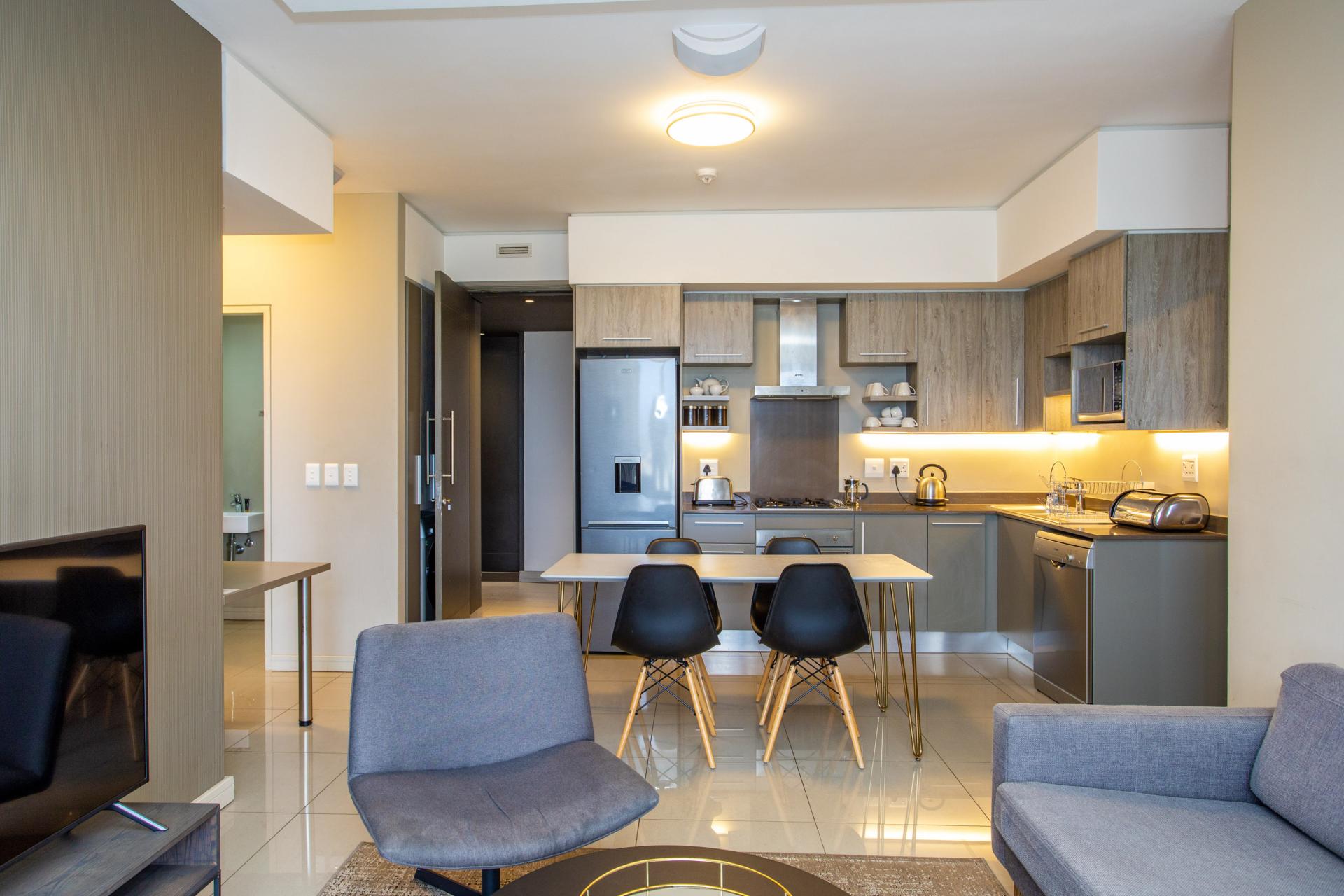 This fully furnished, extremely stylish, two bedroom two bathroom apartment offers exceptional views and a good size balcony. The apartment has been designed with top-of-the-range finishes and appliances throughout, including beautiful flooring, tiling and wall treatments. The kitchen optimises space and offers the benefit of contemporary lighting, a gas stove as well as allocation for two water appliances. The apartment has prepaid electricity, and is Fibre and DSTV ready. There are 2 basement parking bays included. The Tyrwhitt has been developed around luxurious communal areas ,a Restaurant on the ground floor of the building, a communal green area for all residents, 24 hr security/reception with patrols, as well as a backup generator which powers the elevators and passage lights throughout the building.