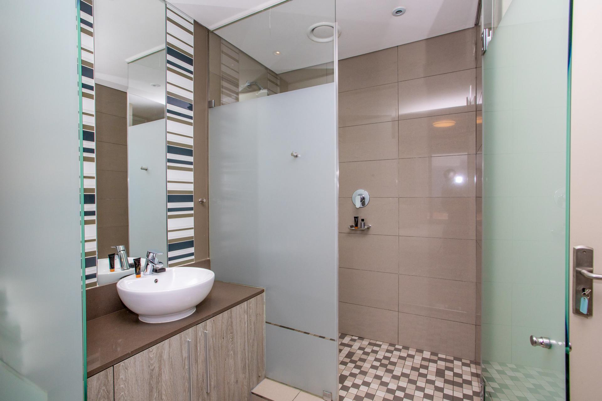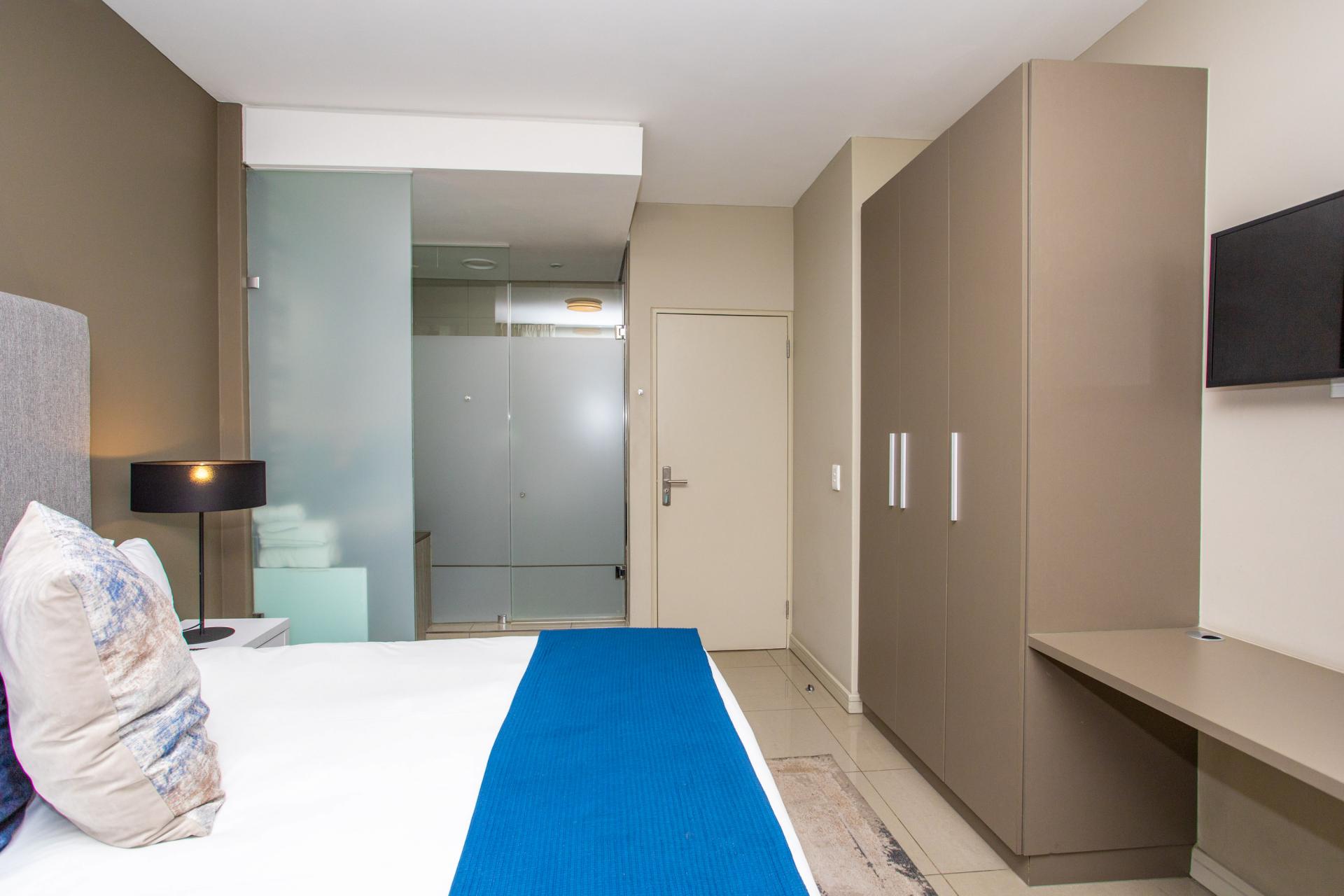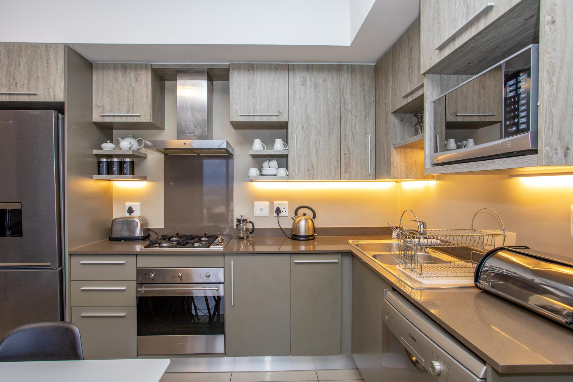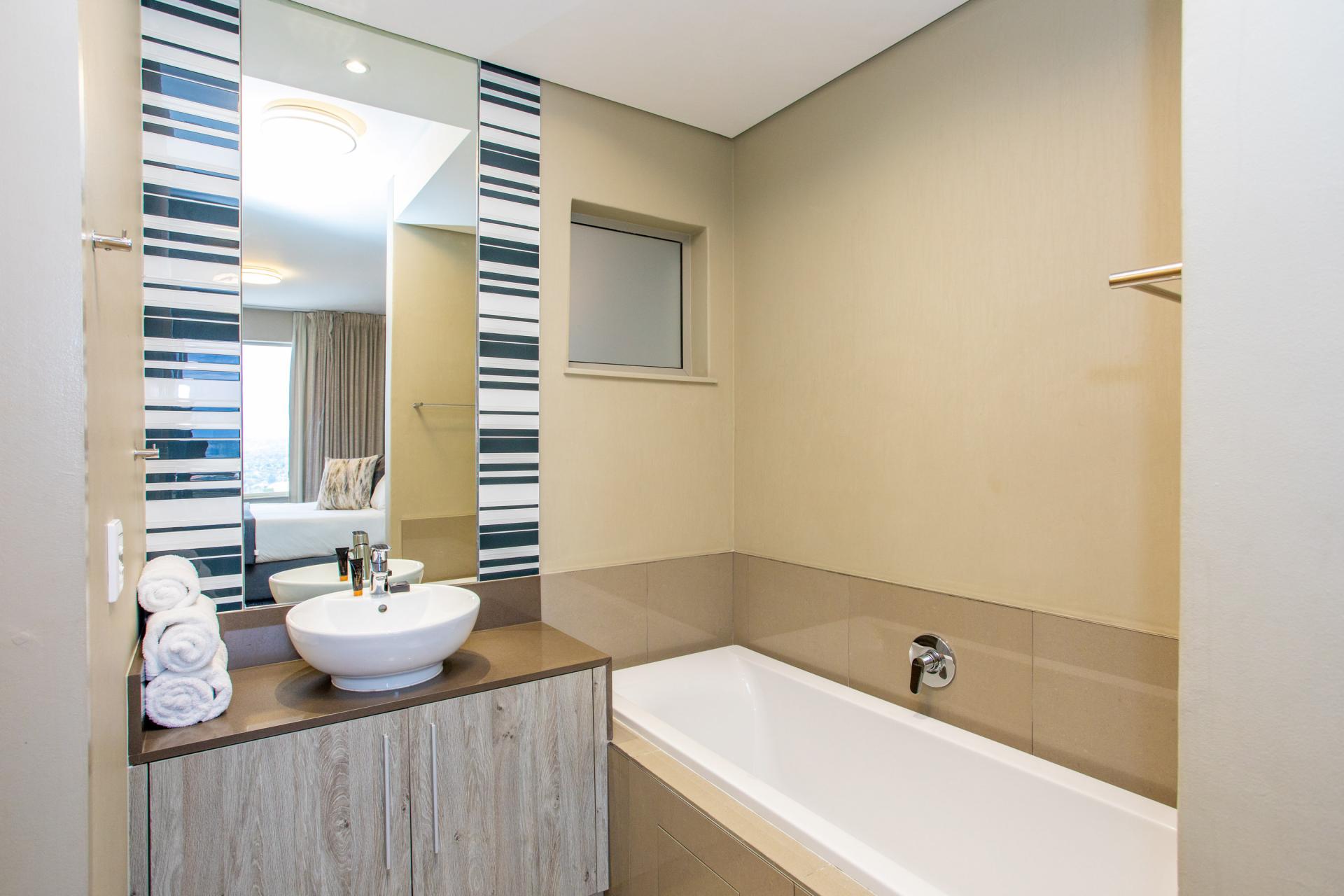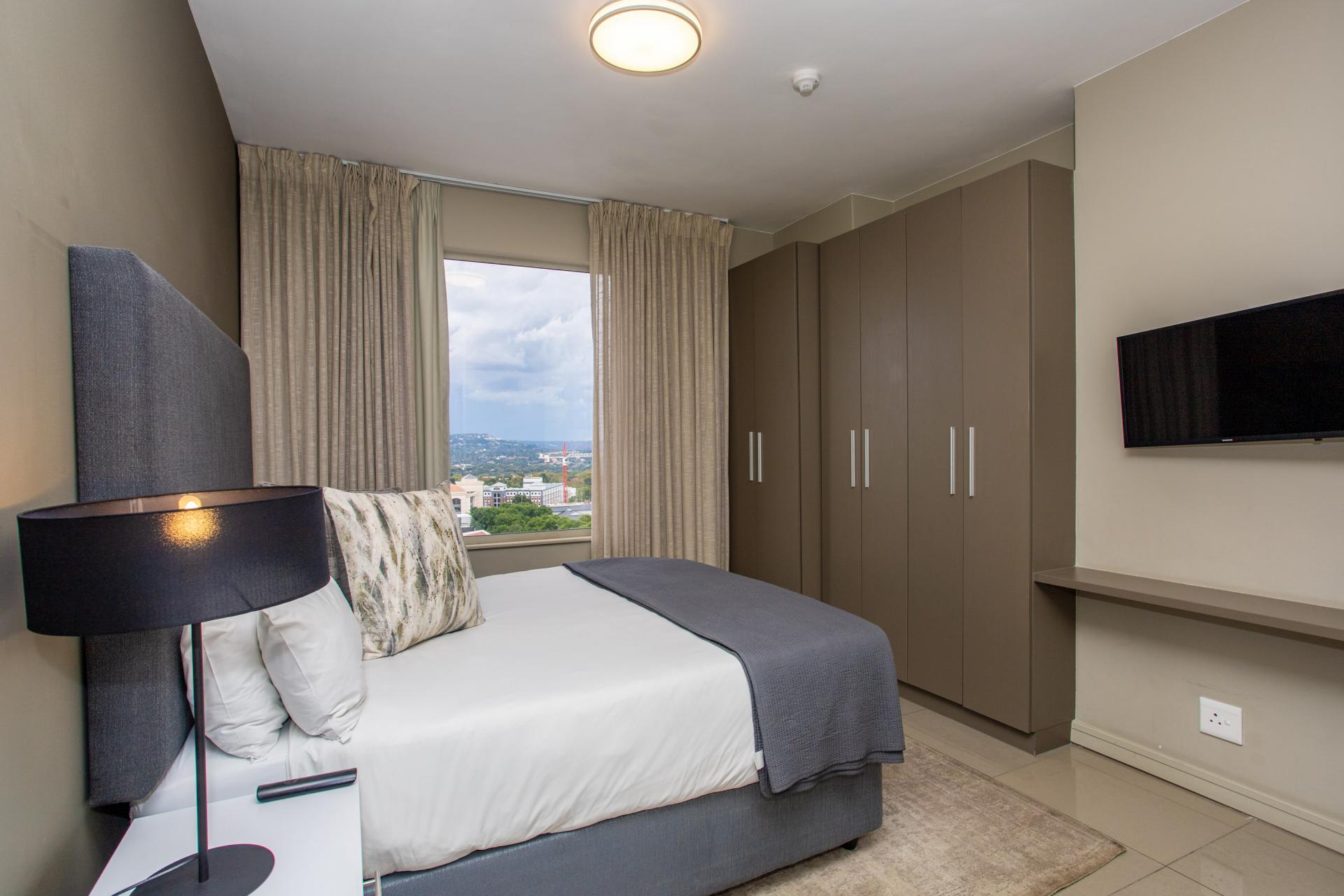 This fully furnished, extremely stylish, two bedroom two bathroom apartment offers exceptional views and a good size balcony. The apartment has been designed with top-of-the-range finishes and appliances throughout, including beautiful flooring, tiling and wall treatments. The kitchen optimises space and offers the benefit of contemporary lighting, a gas stove as well as allocation for two water appliances. The apartment has prepaid electricity, and is Fibre and DSTV ready. There are 2 basement parking bays included. The Tyrwhitt has been developed around luxurious communal areas ,a Restaurant on the ground floor of the building, a communal green area for all residents, 24 hr security/reception with patrols, as well as a backup generator which powers the elevators and passage lights throughout the building.