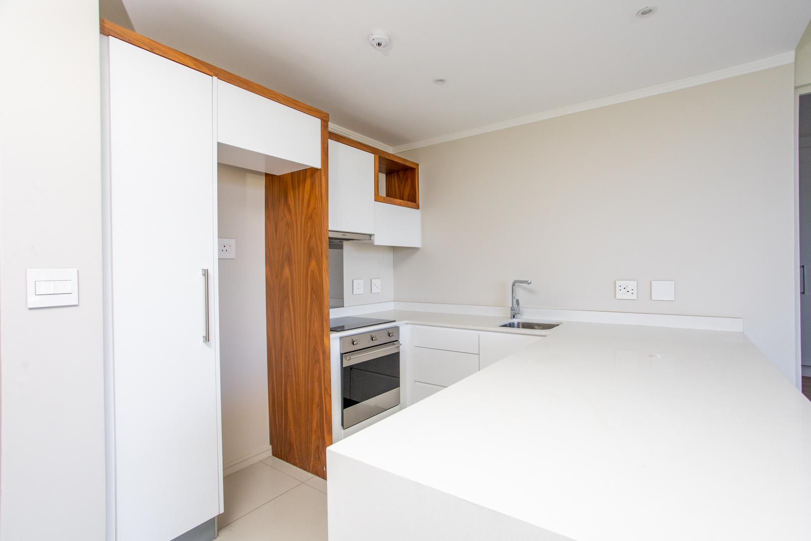 This modern, open-plan apartment features a spacious living area seamlessly flowing into a minimalist kitchen with space for three appliances.