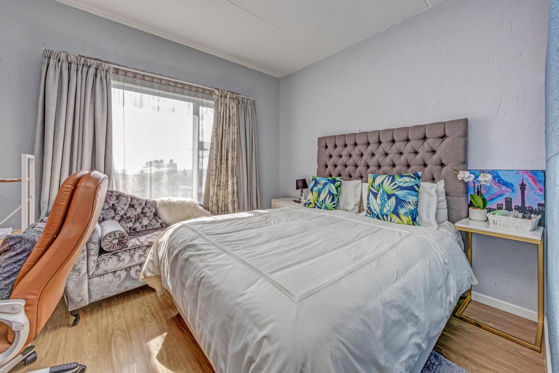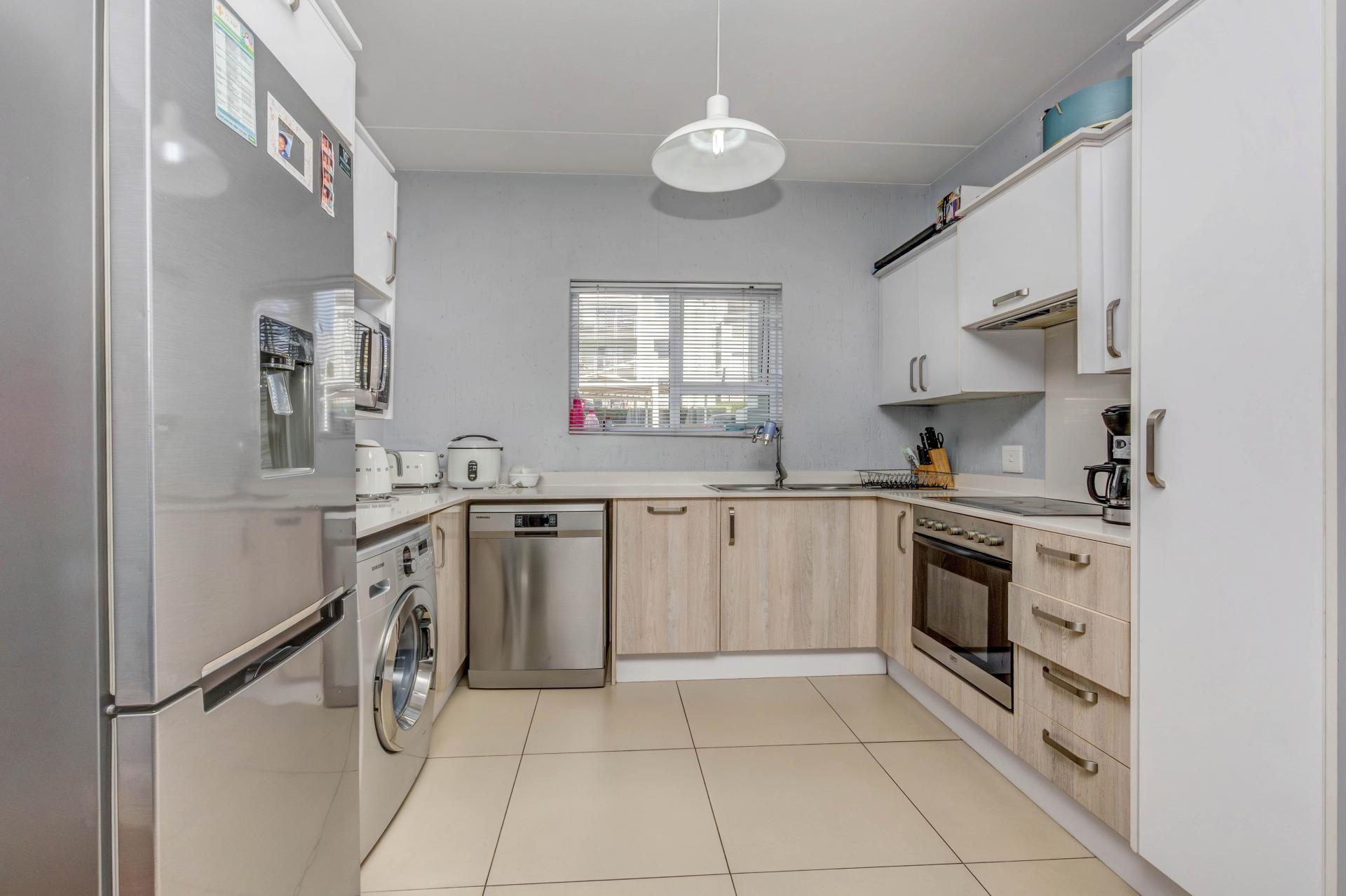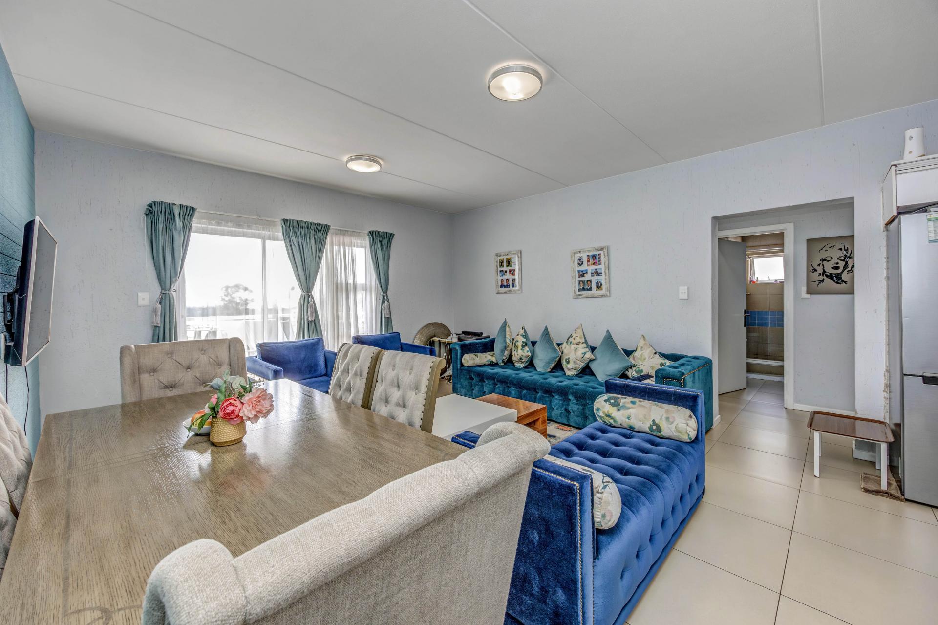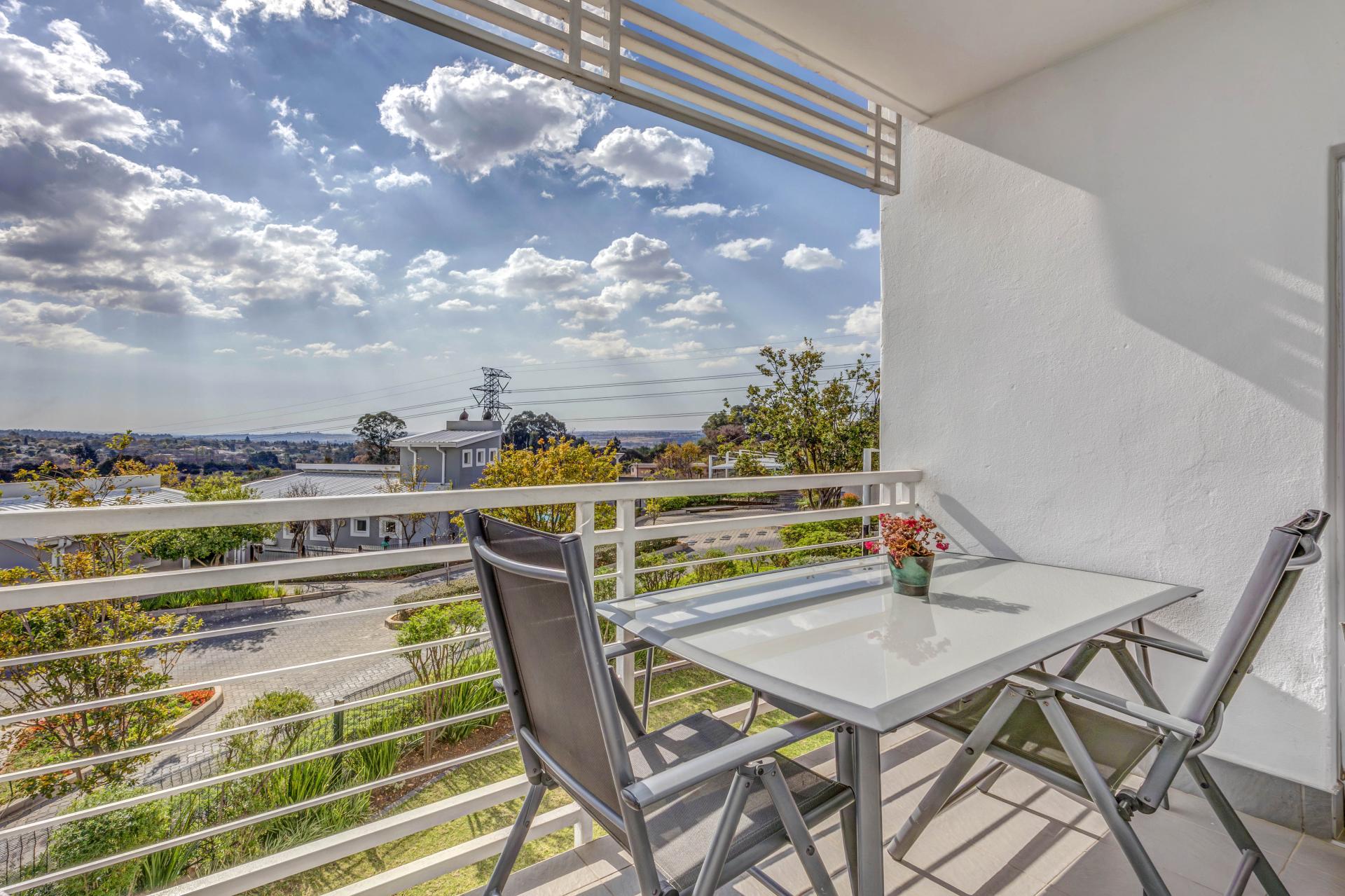 Beautifully designed modern apartment at The Quails, Paulshof. Situated on the second floor, the unit offers an open-plan living space, a sleek kitchen with quality finishes, and a private balcony.