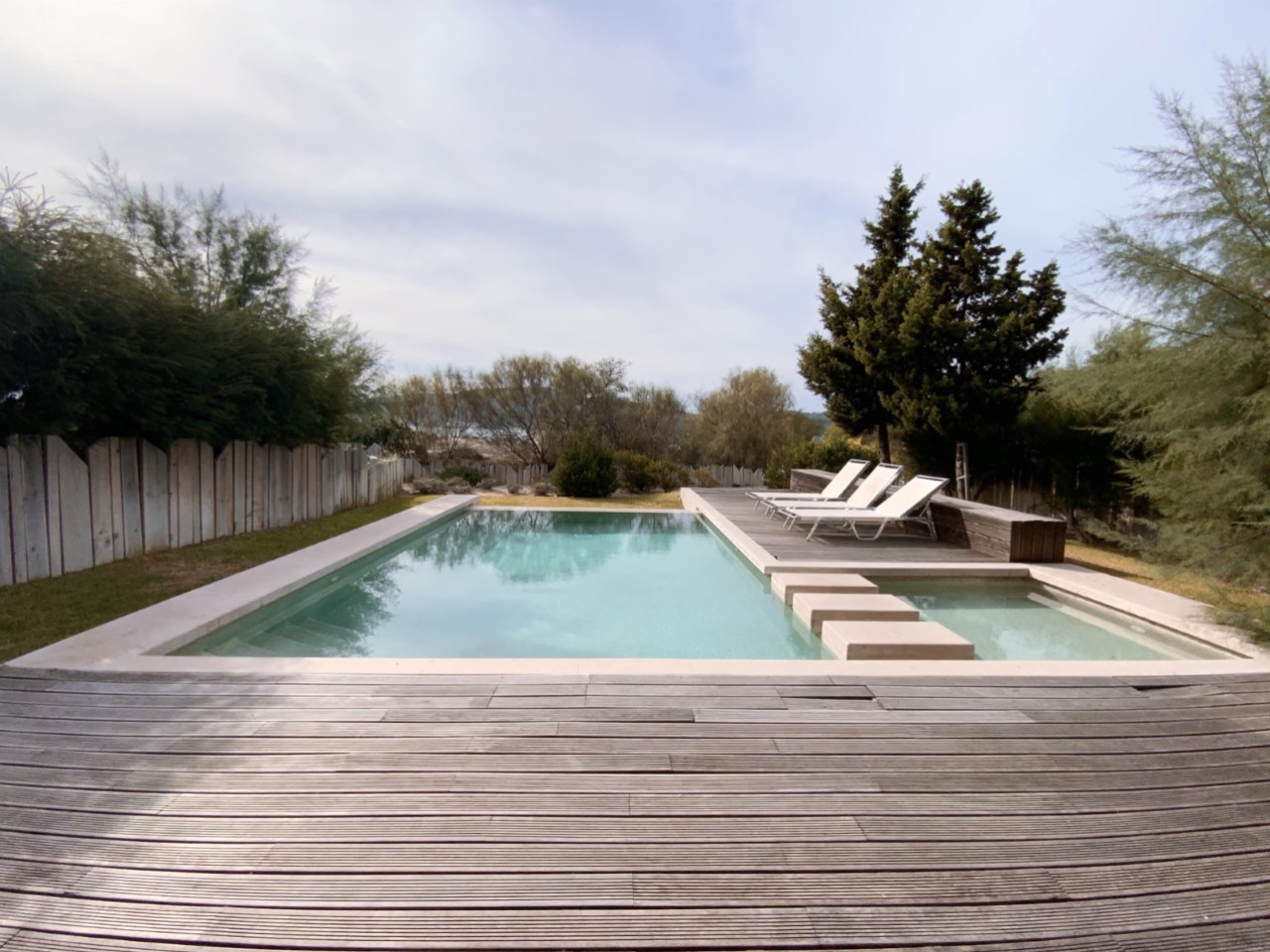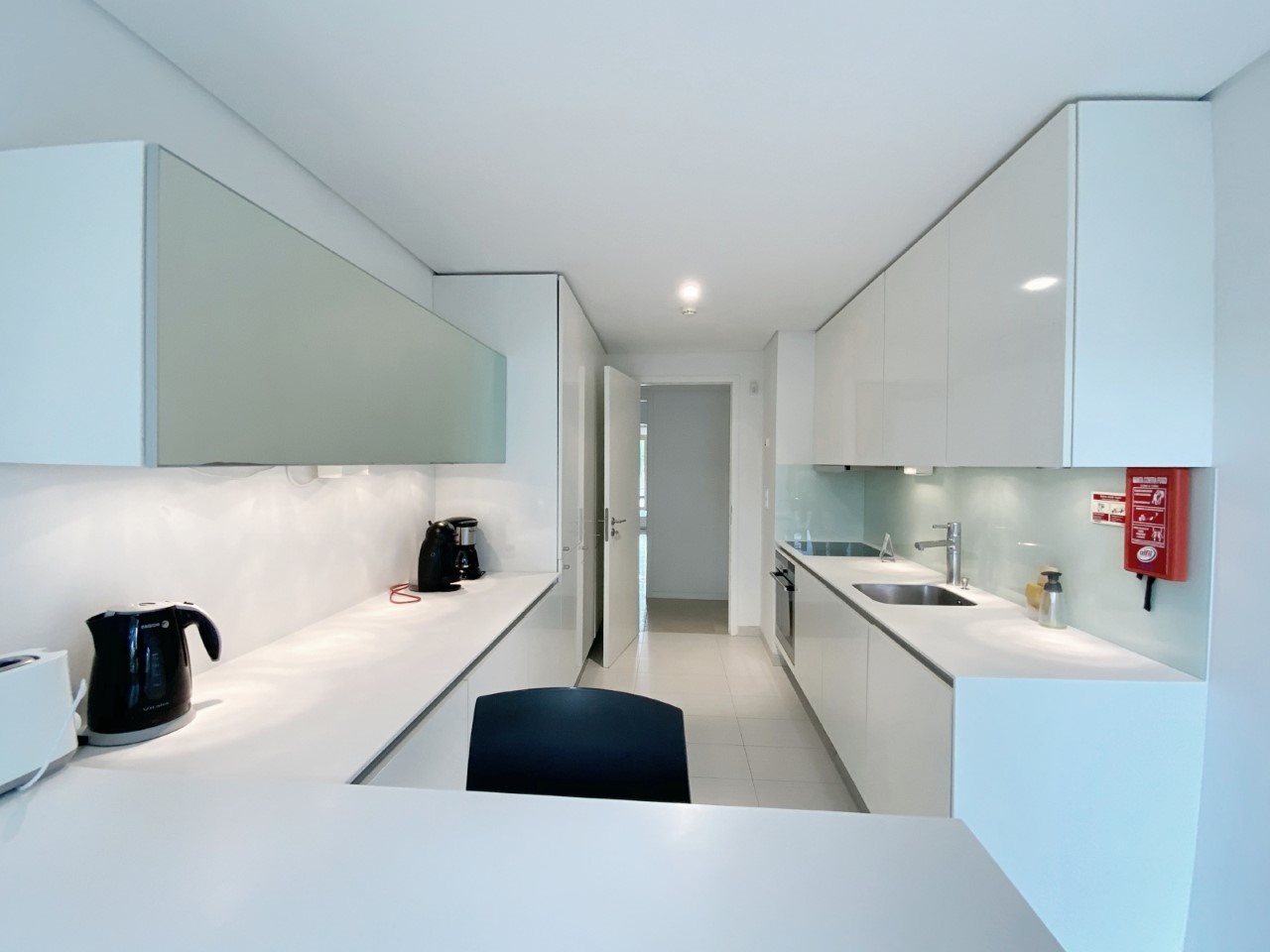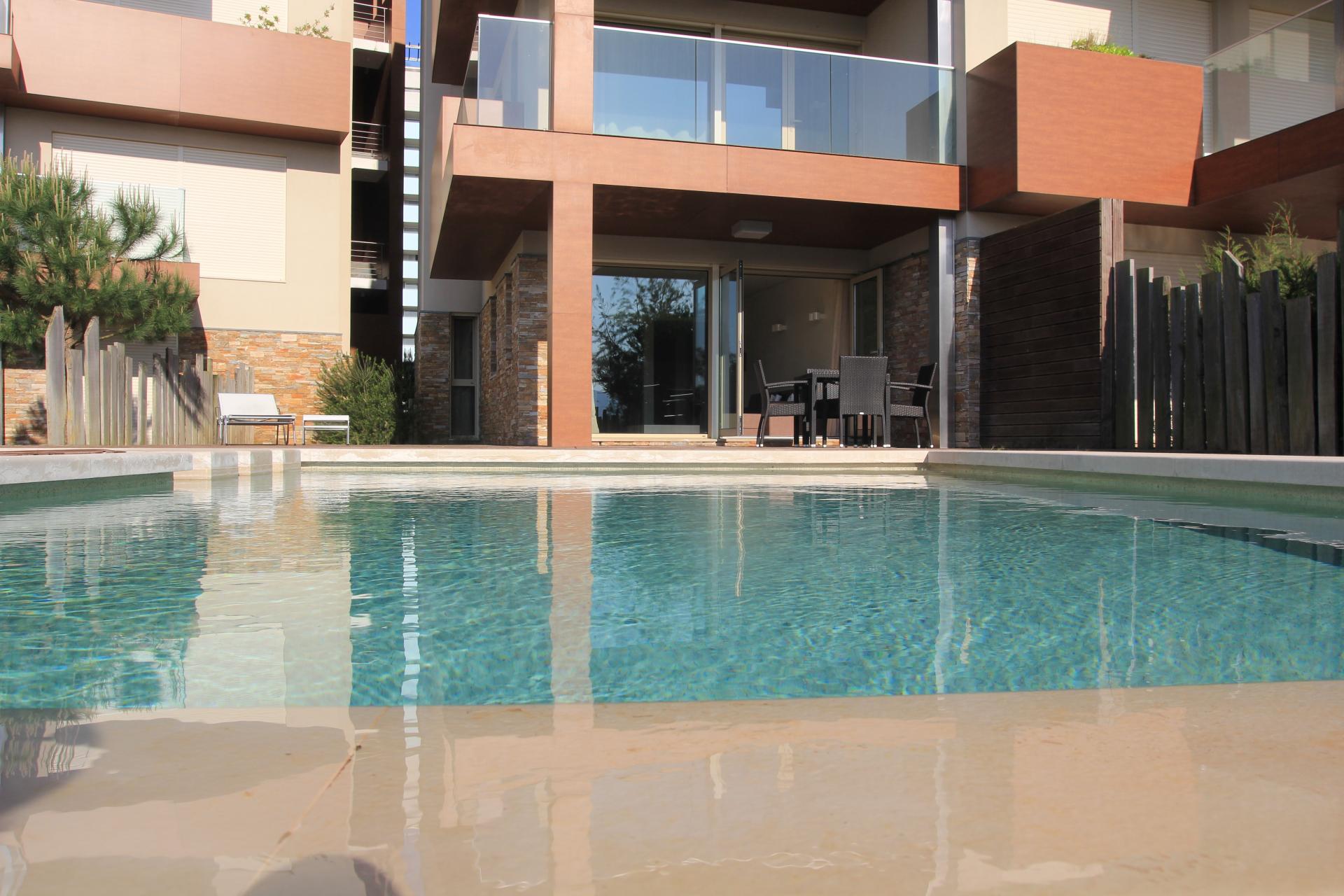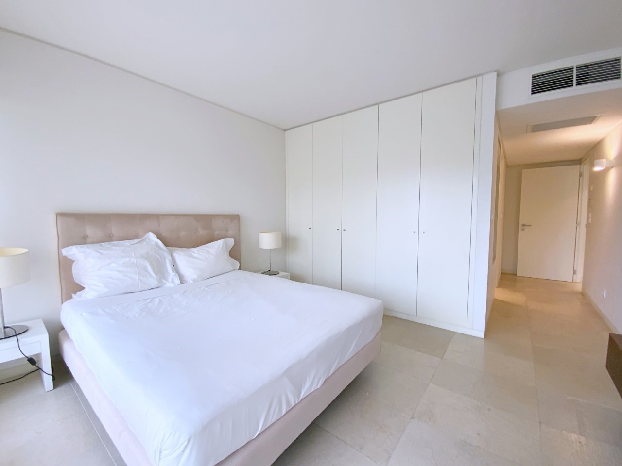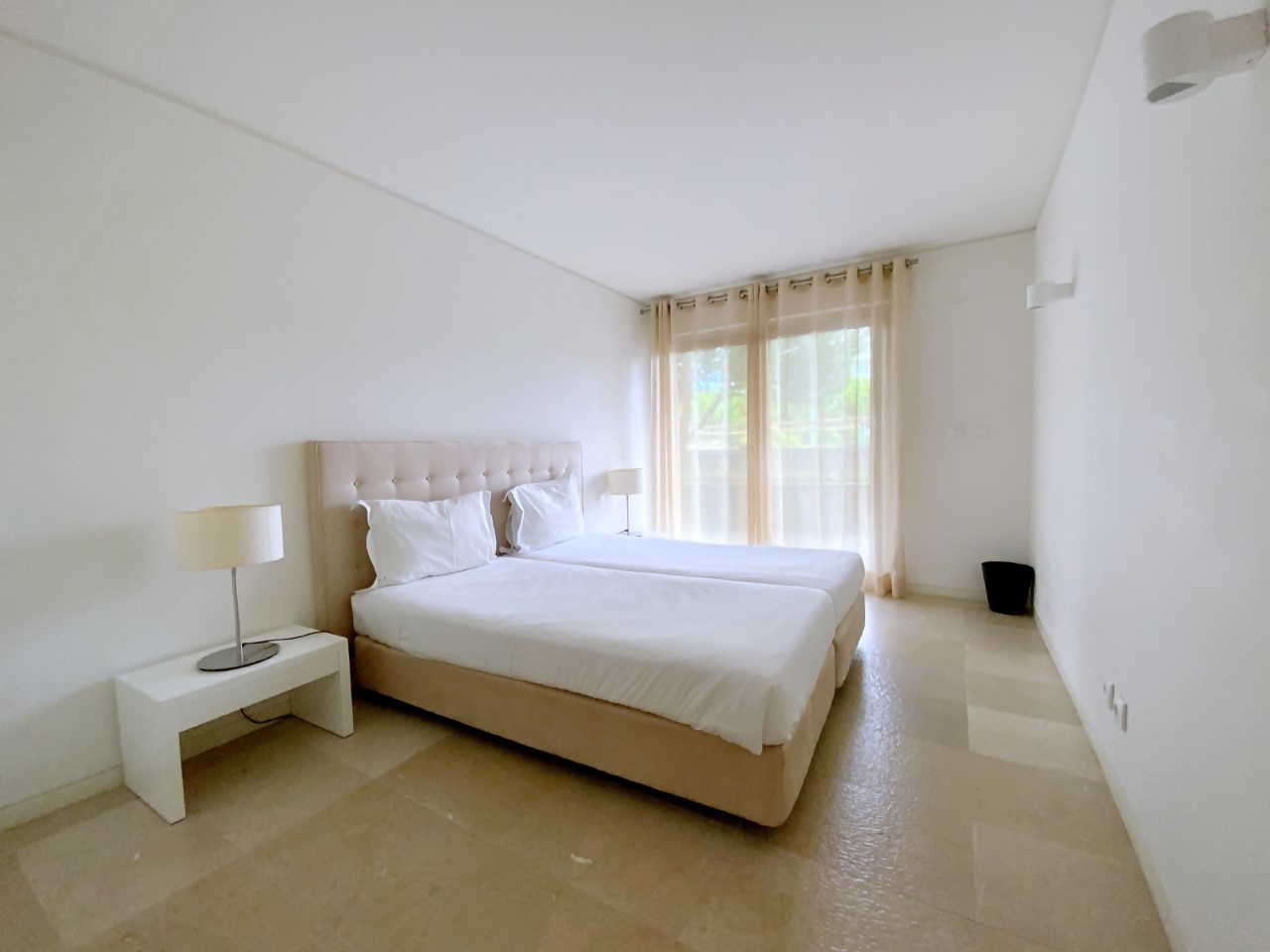 This fantastic 2-bedroom apartment faces the ocean and has about 135 sq.m. It offers luxury finishes, a fully equipped Poggempohl kitchen, a garden, and a private pool. Two bedrooms, a dining room, two bathrooms with underfloor heating, and an excellent living room with access to the garden and pool. The decoration is simple and in soft tones, adapted to the use of the house. The living room and the main suite have plasma screens, central heating, a fireplace in the living room, and air conditioning throughout the house. The apartment has 1 parking space and is located a few minutes from the golf course.