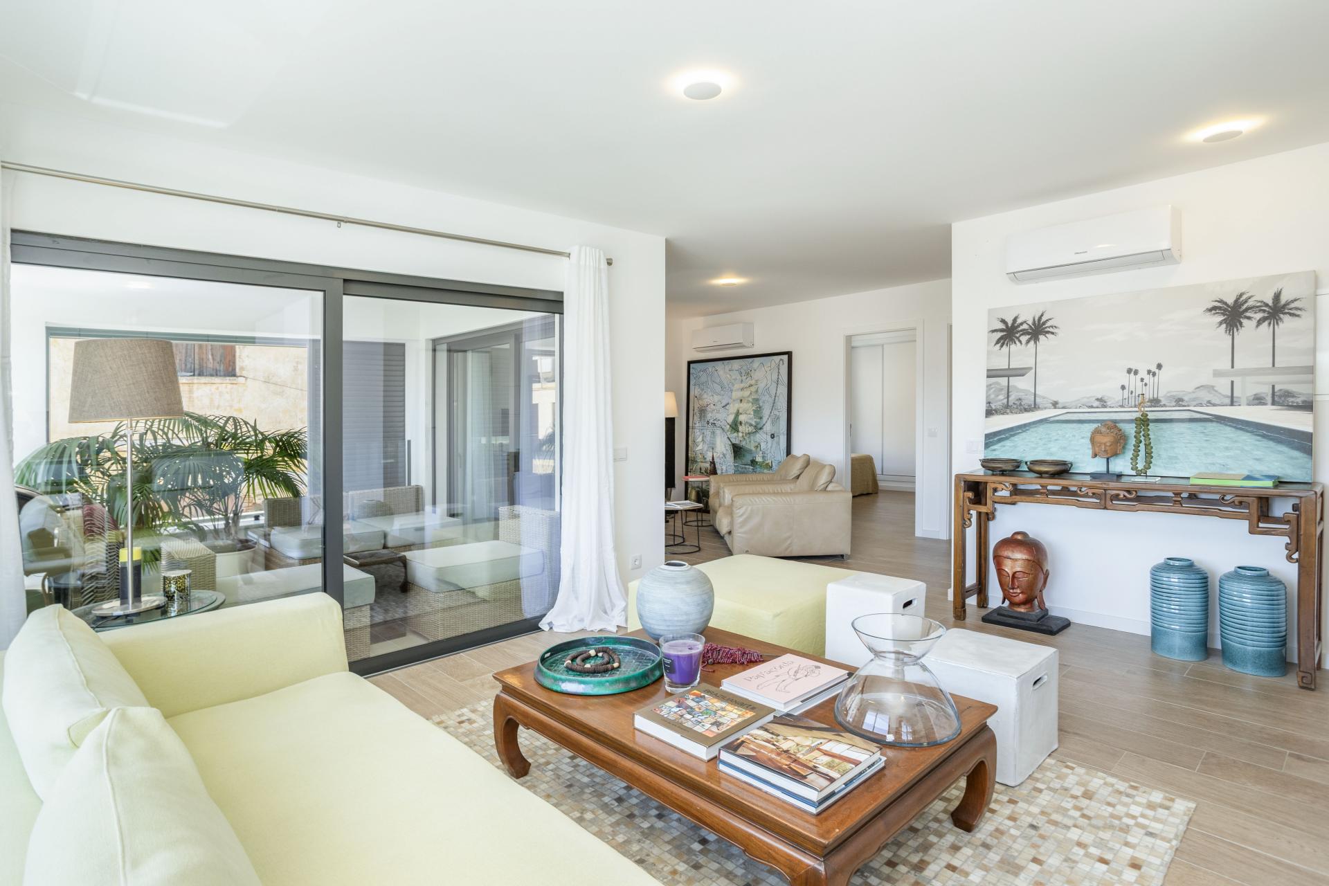 Die Wohnung verfügt über ein großzügiges Wohn- und Esszimmer im offenen Grundriss mit großen Schiebetüren, die auf eine herrliche überdachte Terrasse führen und so ein perfektes Wohngefühl innen wie außen schaffen. Die voll ausgestattete Küche umfasst eine Spülmaschine, eine Waschmaschine, eine Mikrowelle, einen Kühl-Gefrierschrank sowie Hisense-Klimaanlagen in allen Räumen. Mit Garage, Aufzug und sicherem Zugang zu dem neu erbauten Gebäude (Energieausweis: A) ist diese pflegeleichte Wohnung ideal für modernes Wohnen.