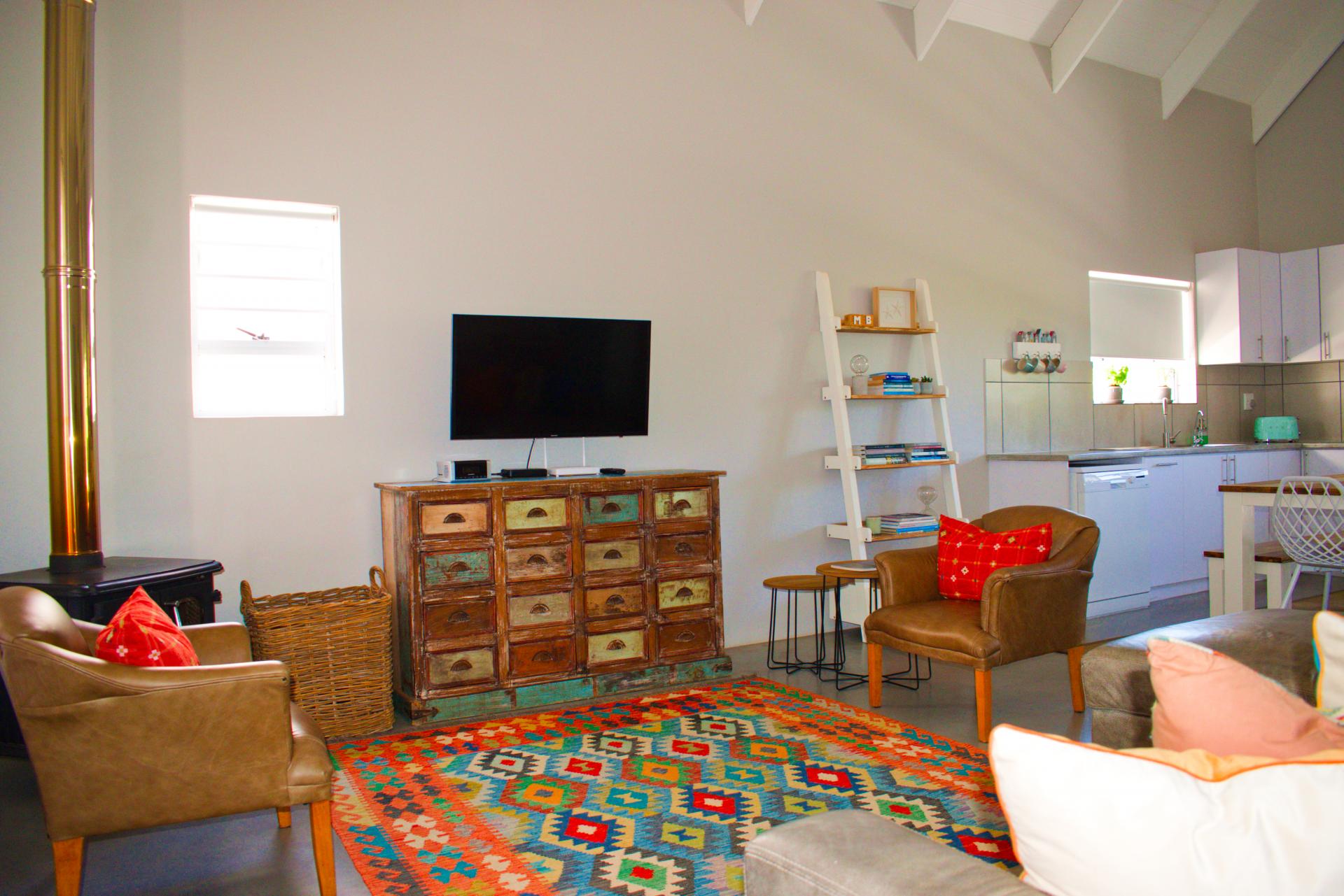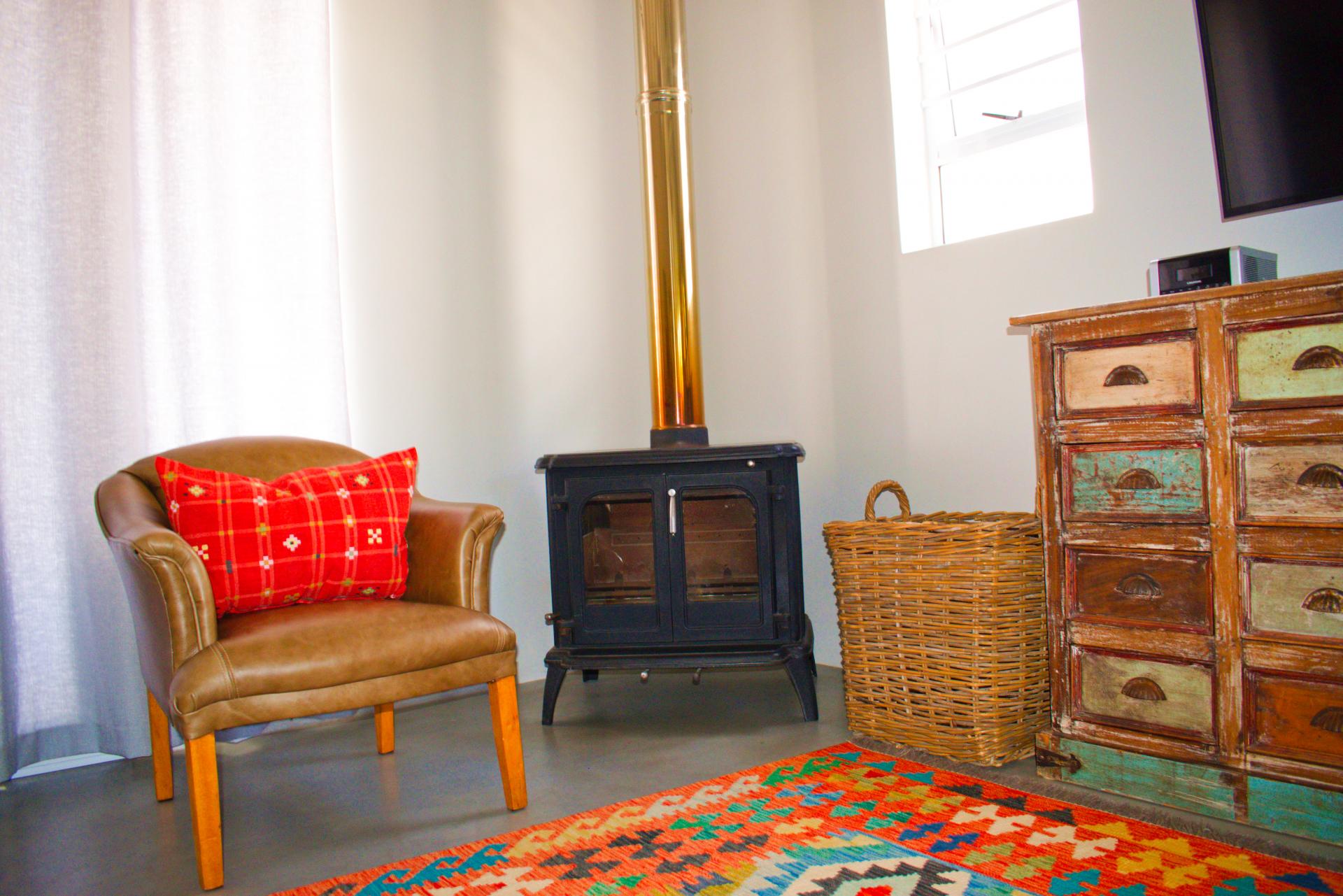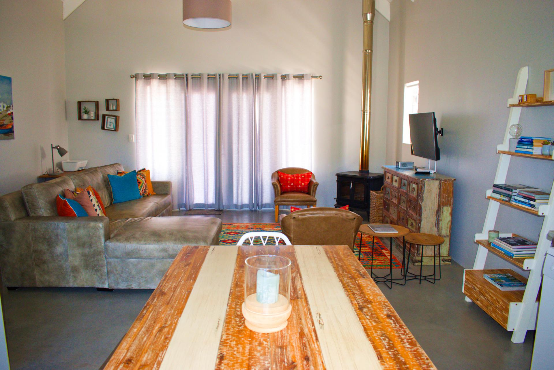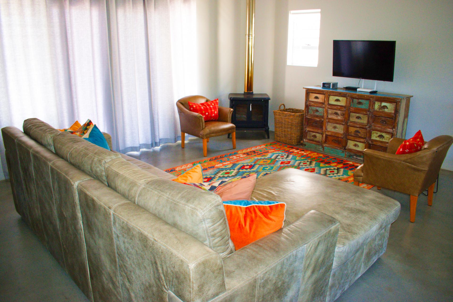 * Large open-plan living area with fireplace. The lounge leading to a under covered pergola patio and built-in braai.