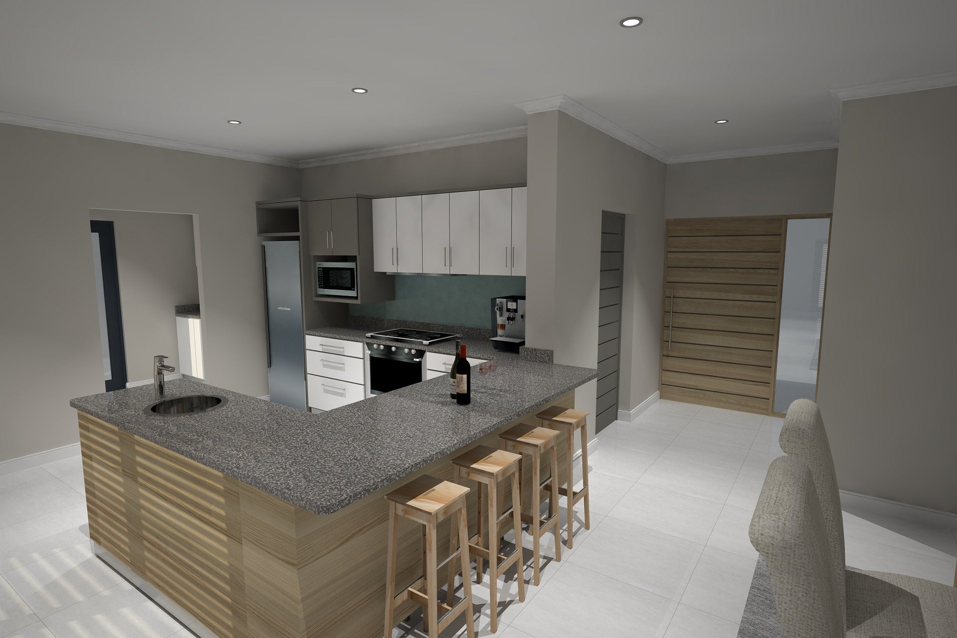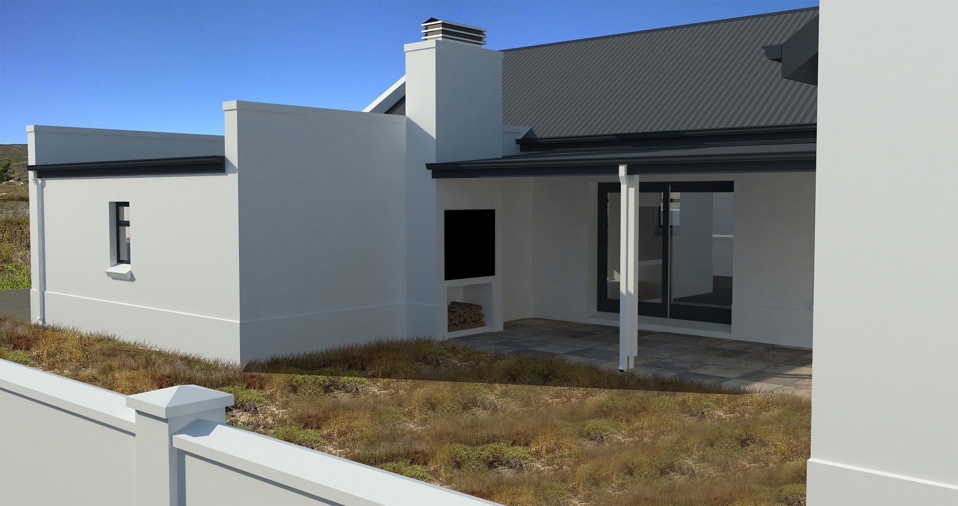 A modern single-story home with an open-plan living area leading to a patio with a built-in braai.