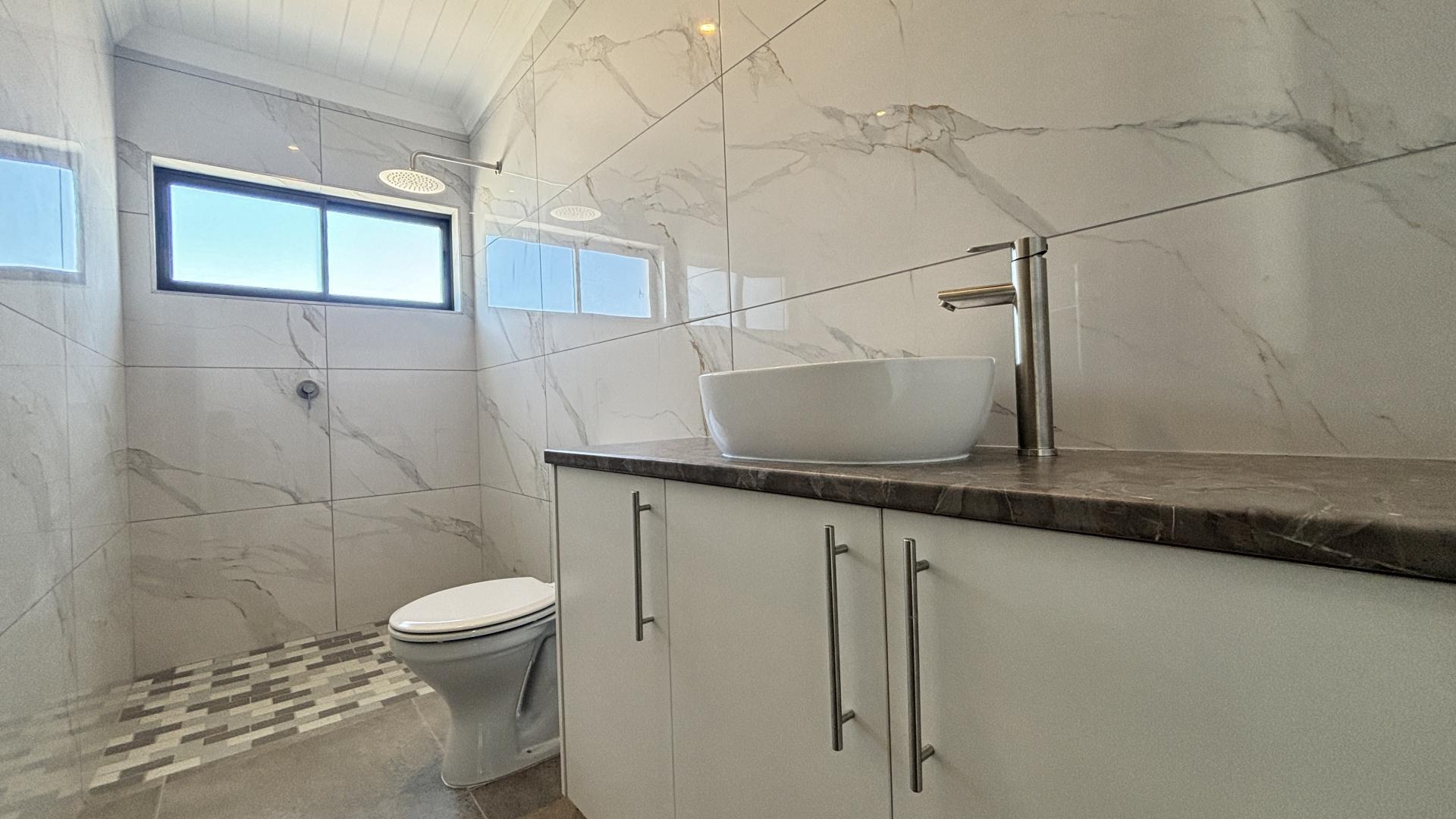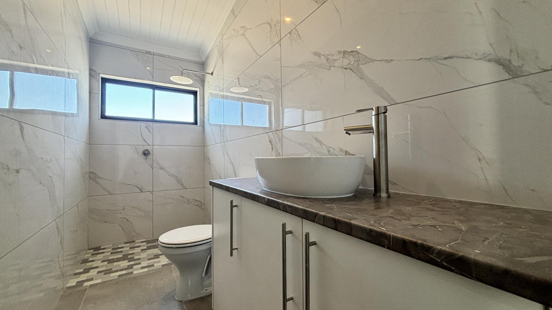 The bathroom is beautifully finished with modern tiles, a spacious walk-in shower, a stylish vanity with a vessel basin, and high-quality fittings, delivering a touch of luxury.