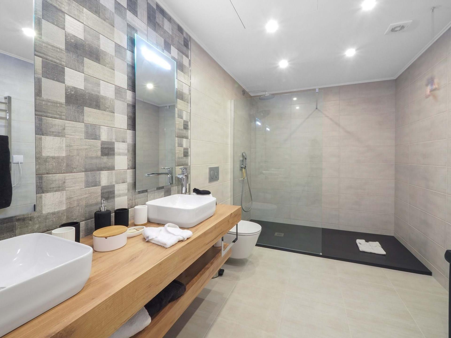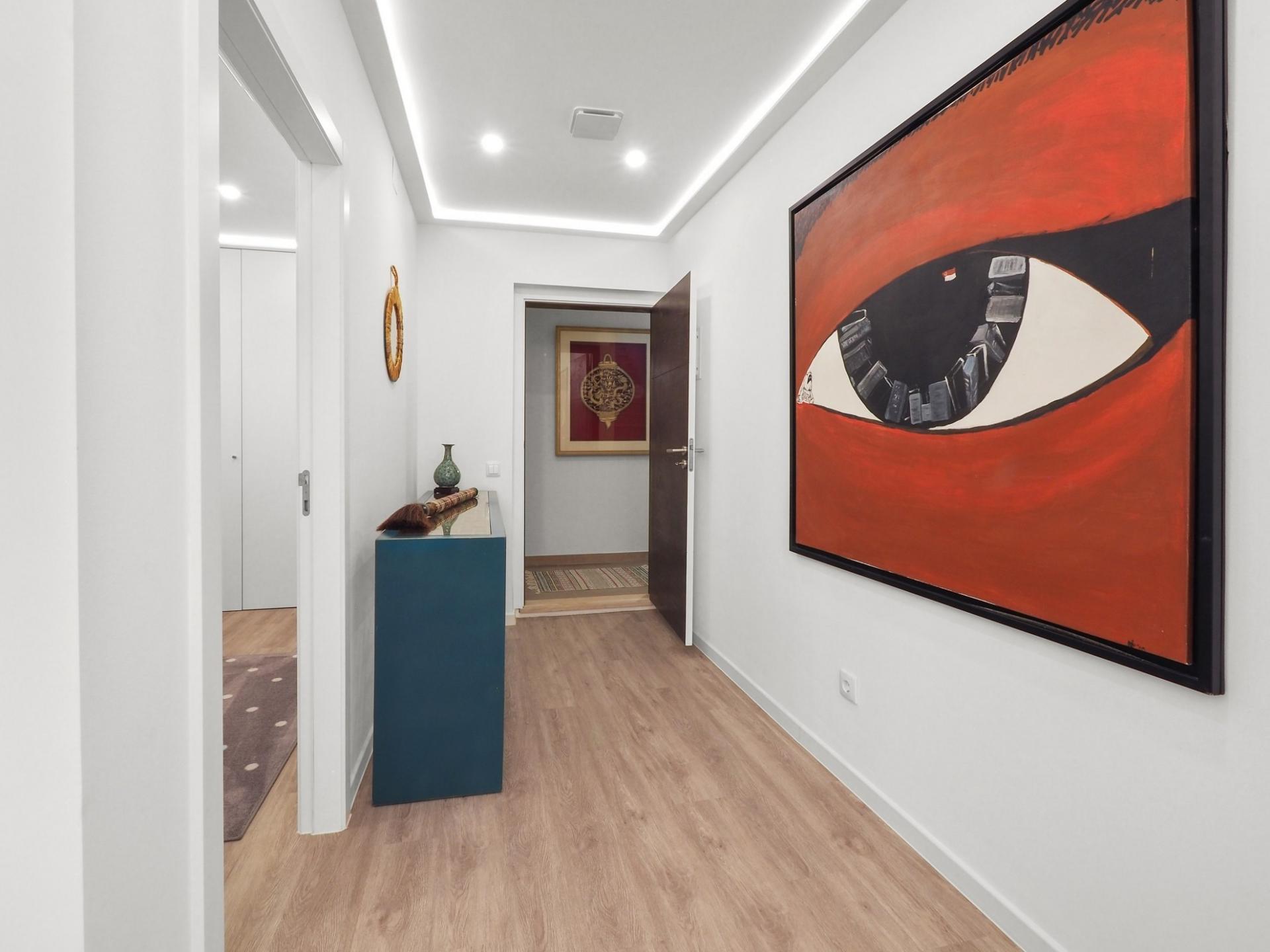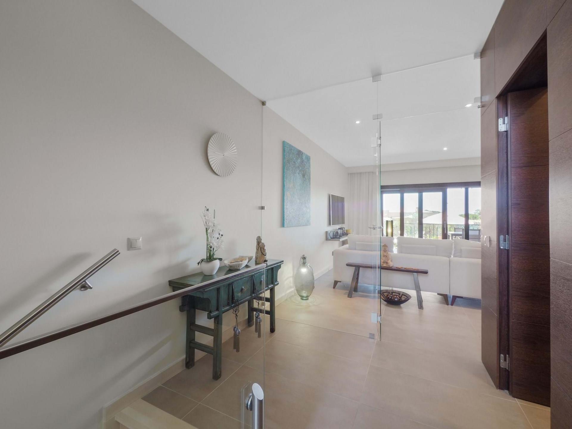 Set across three levels, the interiors are designed to balance space and light. The ground floor welcomes you with a bright entrance hall and double-height ceiling, leading into an open-plan living and dining area with direct access to a covered south-facing terrace. A fully equipped kitchen complements the main living spaces, while the private garden and pool – recently renovated – extend the lifestyle outdoors, creating a setting for relaxed days and al fresco evenings.