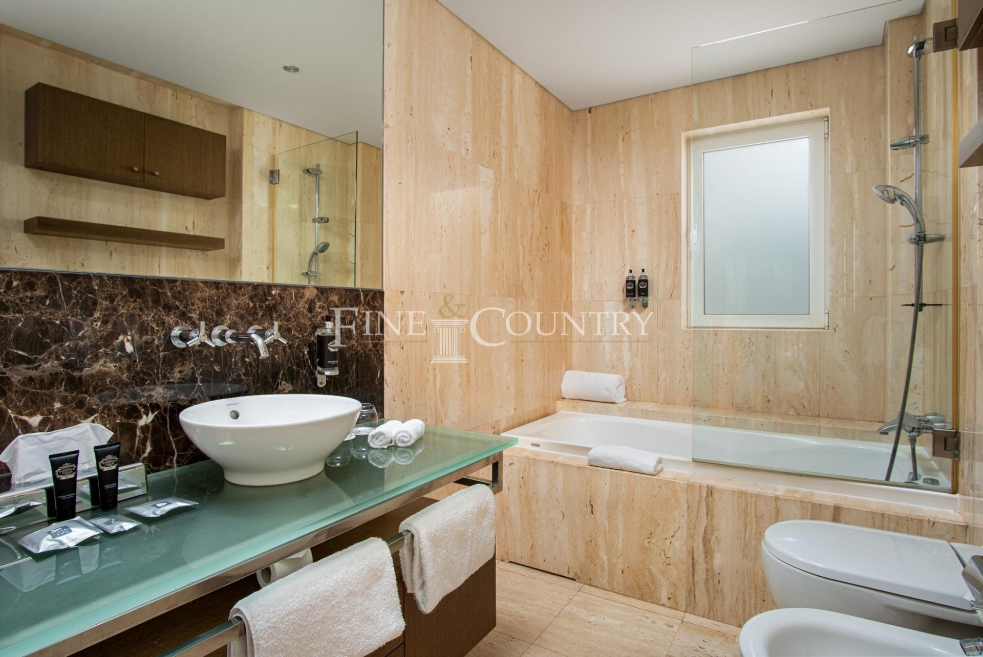 The resort boasts a restaurant, bars, spa, indoor heated pool and outdoor pools, fitness centre, Turkish bath, sauna and Jacuzzis, a running track and a multisports’ court. It comprises ground-floor entrance hall, guest WC, spacious lounge/dining area, open-plan fully fitted kitchen, patio doors accessing terrace, landscaped gardens and communal pool, two first-floor en-suite bedrooms with Jacuzzi baths, fitted wardrobes (one with private terrace) and views overlooking the well-maintained gardens and ocean.