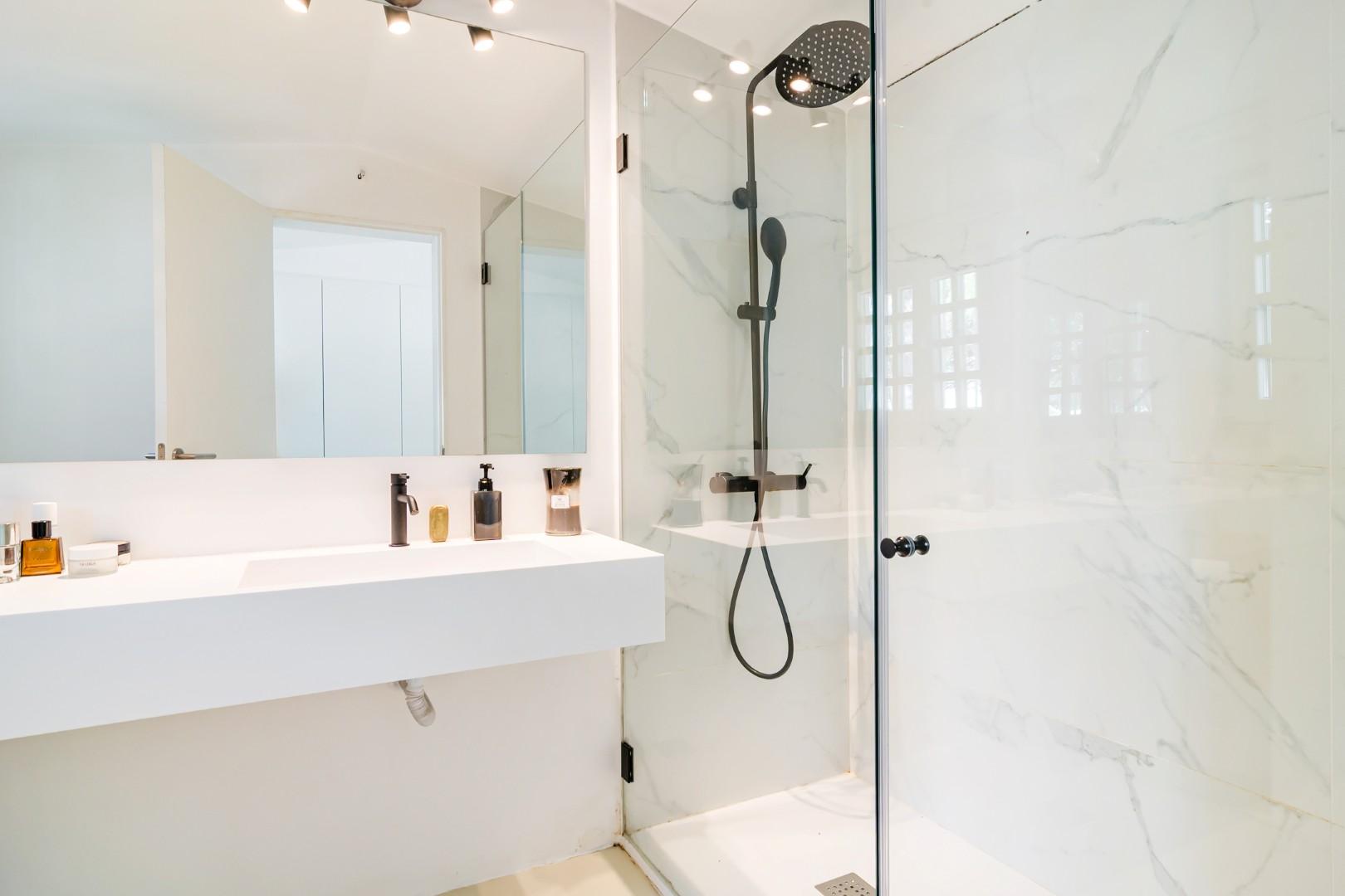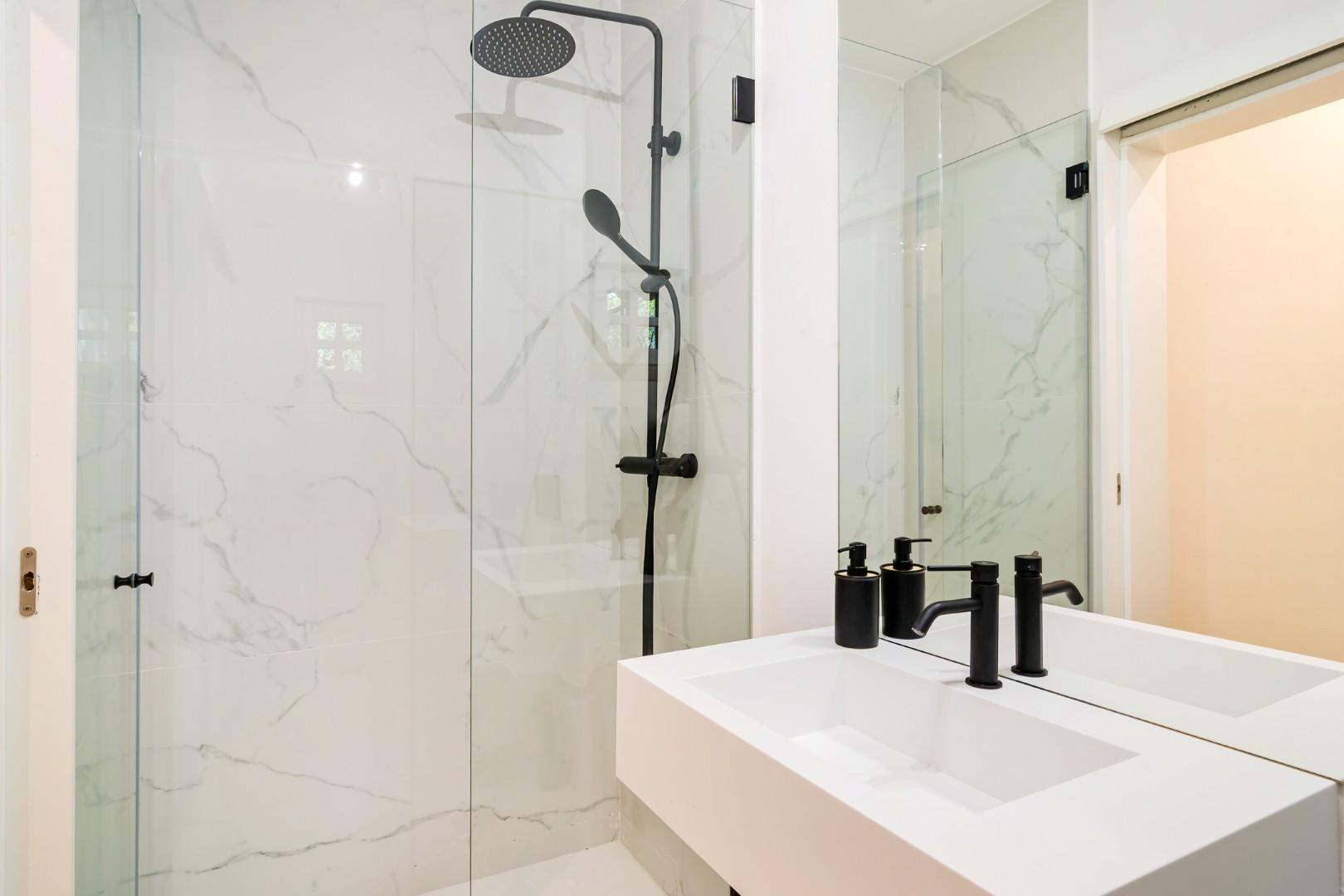 À l'étage, la propriété offre une suite parentale spacieuse avec des armoires encastrées et une salle de bains attenante, également équipée d'une douche, d'un éclairage naturel et de plans de travail en Corian sans joint.