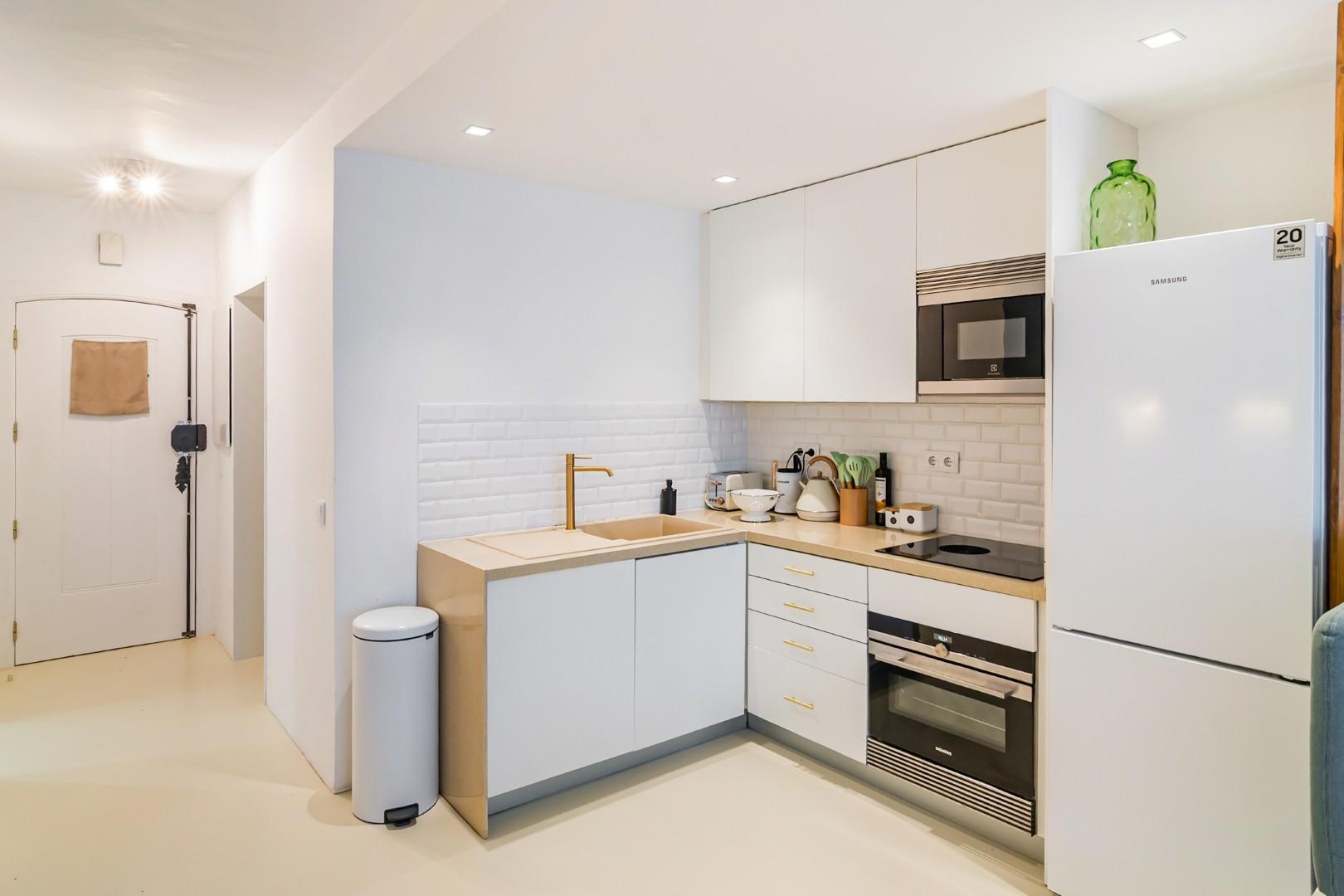 On the ground floor, the home features a welcoming guest bedroom with wardrobe and natural light, alongside a full bathroom with a shower, window, and elegant seamless Corian countertop. The open-plan kitchen is fully equipped with top-quality appliances, including a full-size fridge, washing machine, Bora induction hob, oven, microwave, and all the necessary utensils, cutlery, and tableware. The kitchen connects to a stylish dining area with a custom-designed banquette offering abundant built-in storage, and a bright living room that opens onto a private patio with views of the communal garden and golf course.