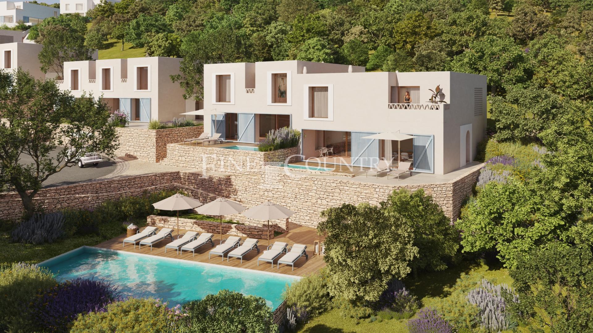 Cada propriedade beneficia de amplos terraços ou um jardim com piscina privada e garagem para 1-2 carros.