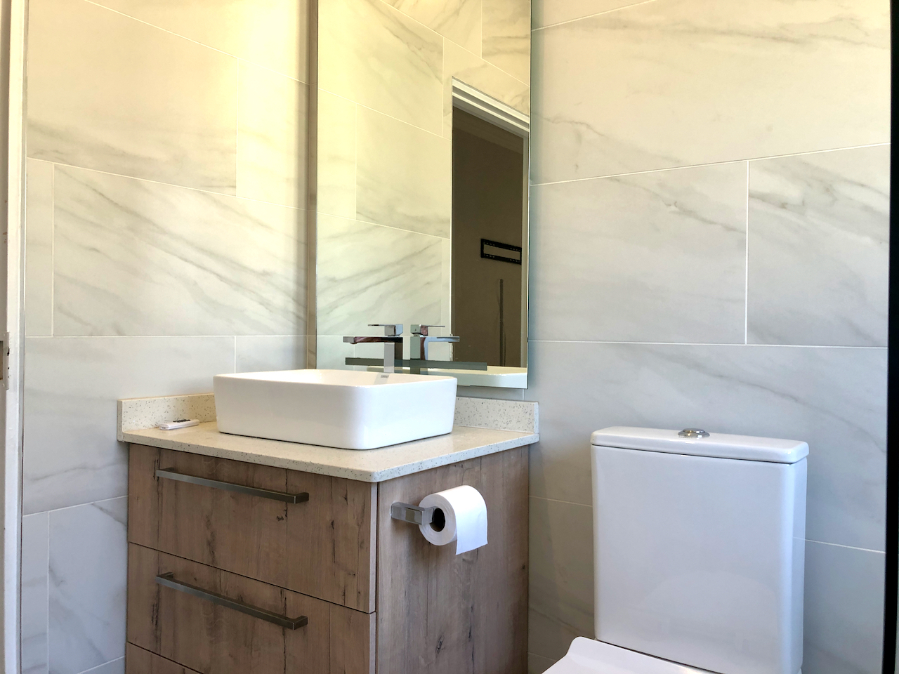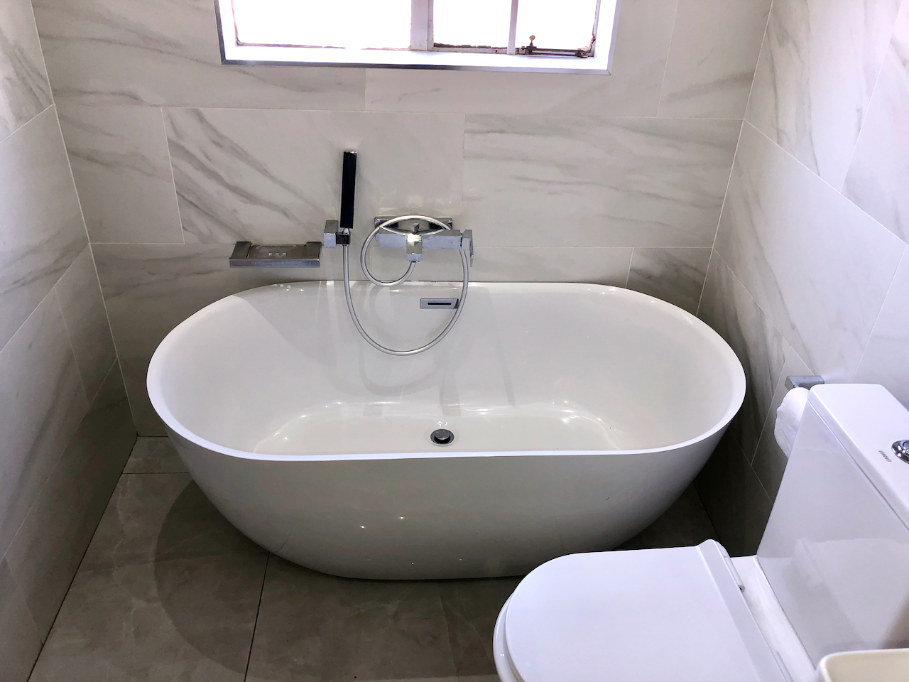 Both bedrooms are generously sized, featuring built-in cupboards and air-conditioning for year-round comfort. The guest bathroom offers a touch of luxury with a freestanding oval tub, while the main en-suite bathroom features a sleek walk-in shower with contemporary finishes.