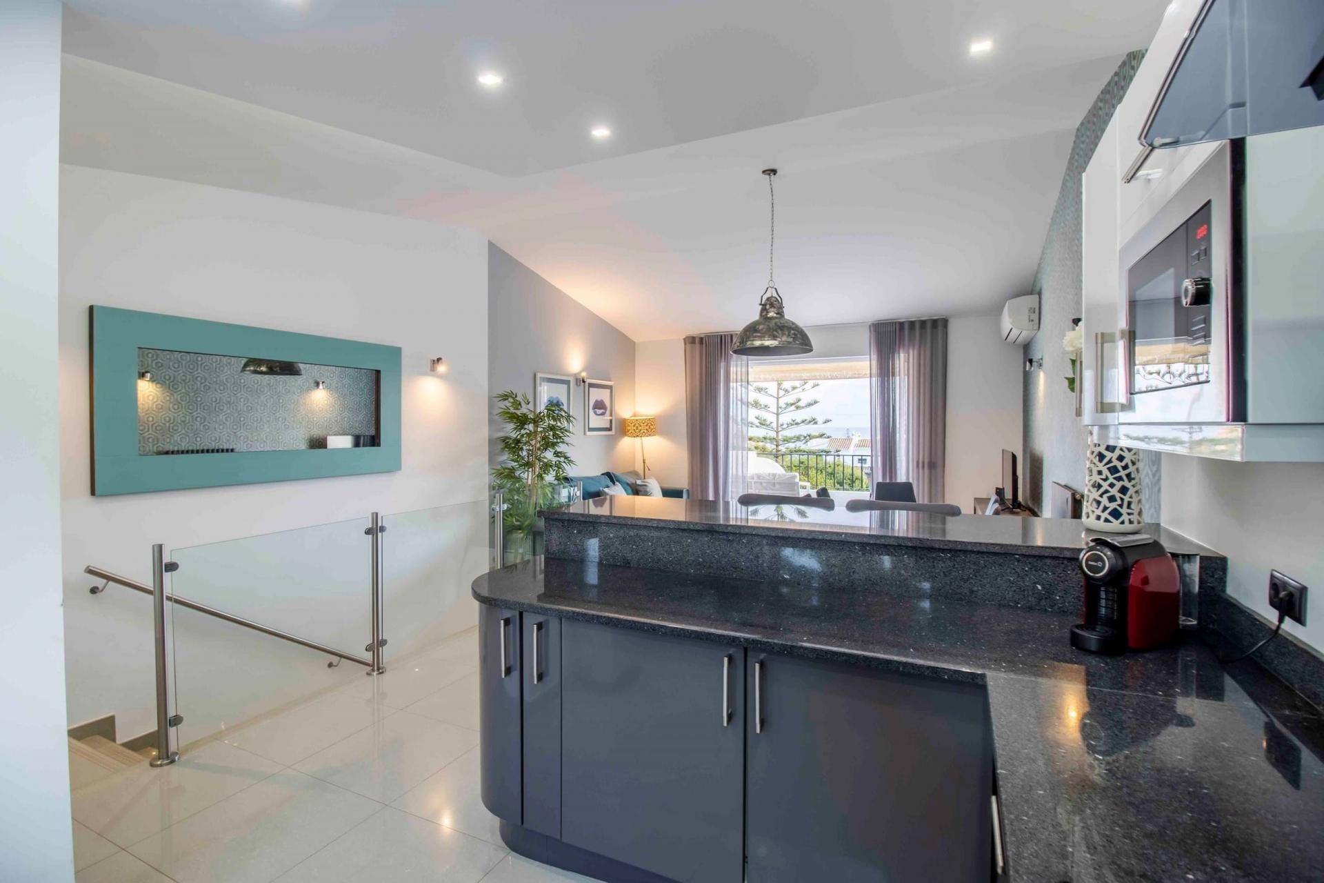 On the upper floor, there is a fully equipped kitchen integrated with the living/dining room, which has a fireplace and access to the outdoor terrace with a magnificent view of the sea the ideal setting to relax in peace. Thanks to its location, the house receives excellent sunlight throughout the day, offering sea views from the kitchen, living room and terrace.