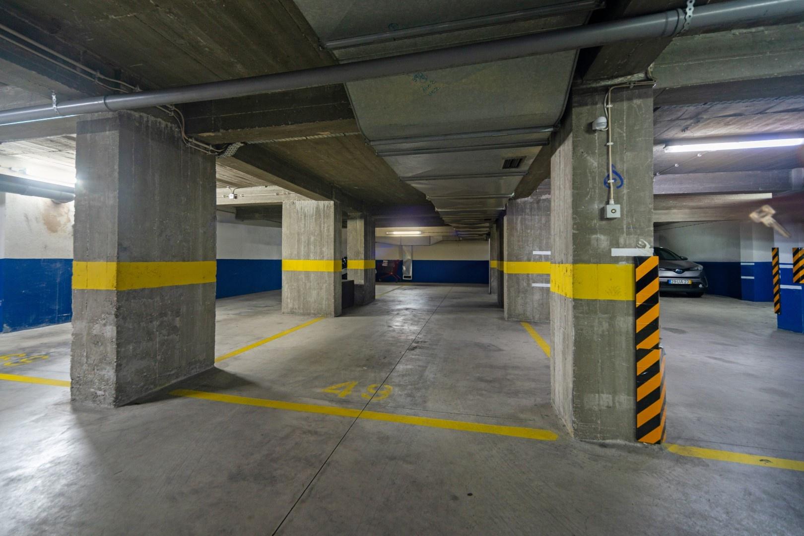 There are 2 underground parking spaces, a storage room, a communal swimming pool on the roof terrace with panoramic views, a fully equipped gym, and security and surveillance in the building.