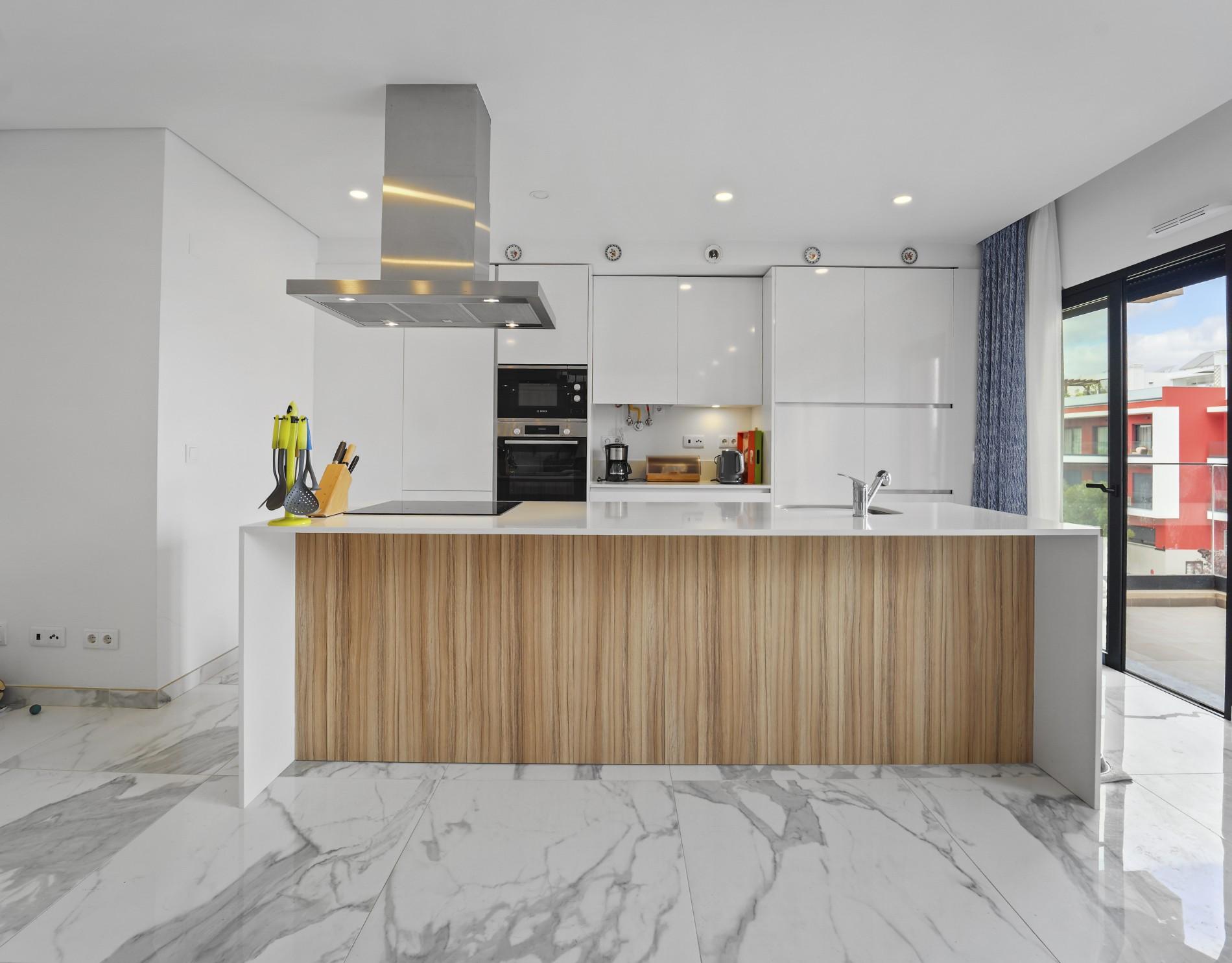 The penthouse provides three bedrooms, all with direct access to outdoor spaces. The master suite and second bedroom include private bathrooms, while the third bedroom is served by a stylish family bathroom. Each room comes with fitted wardrobes and reversible air conditioning, while underfloor heating in the bathrooms and a central vacuum system add to the comfort.