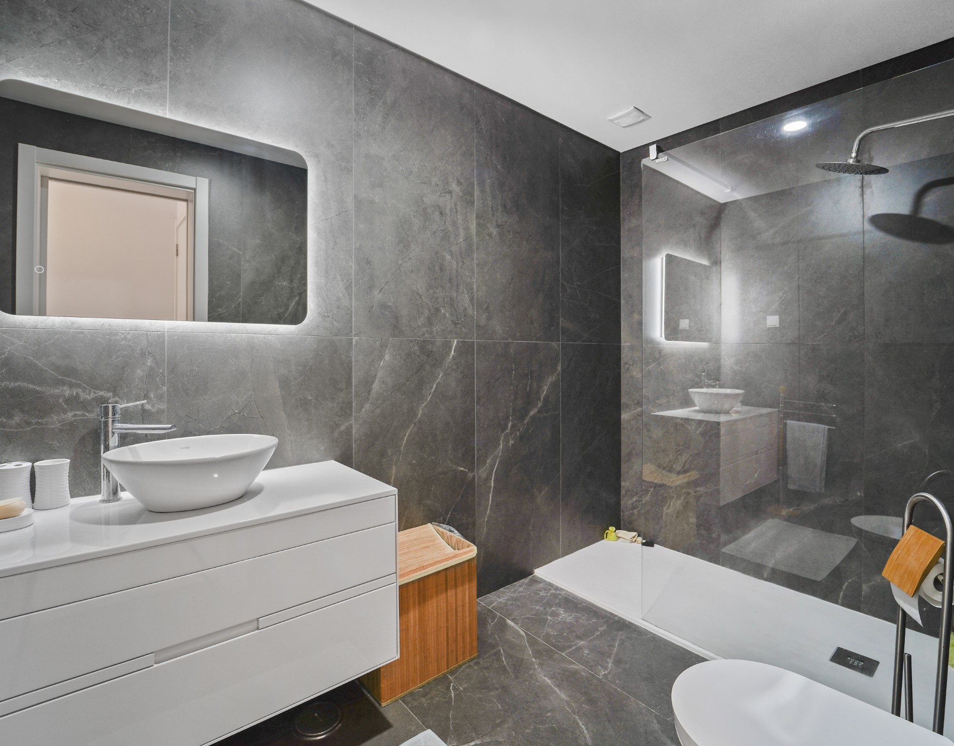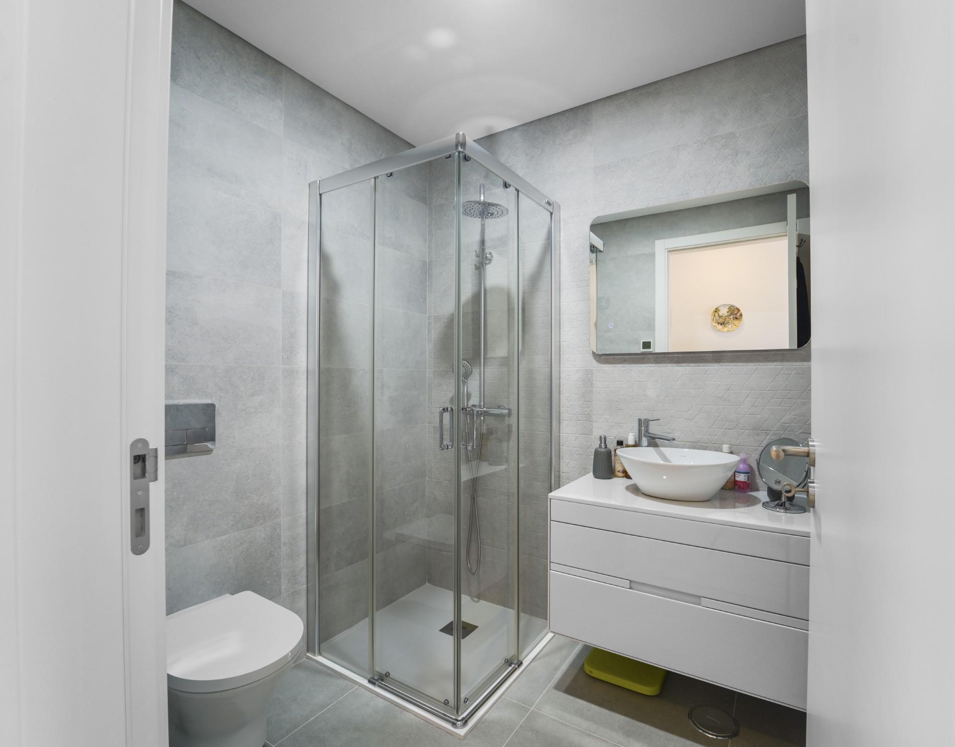 La partie nuit comprend trois chambres, toutes avec accès direct à l’extérieur. La suite parentale et la deuxième chambre possèdent leur propre salle de bain, tandis que la troisième chambre est desservie par une salle de bain familiale élégante. Chaque chambre est équipée de placards intégrés et climatisation réversible. Les salles de bain bénéficient d’un chauffage au sol, et l’appartement est doté d’un système d’aspiration centralisée.