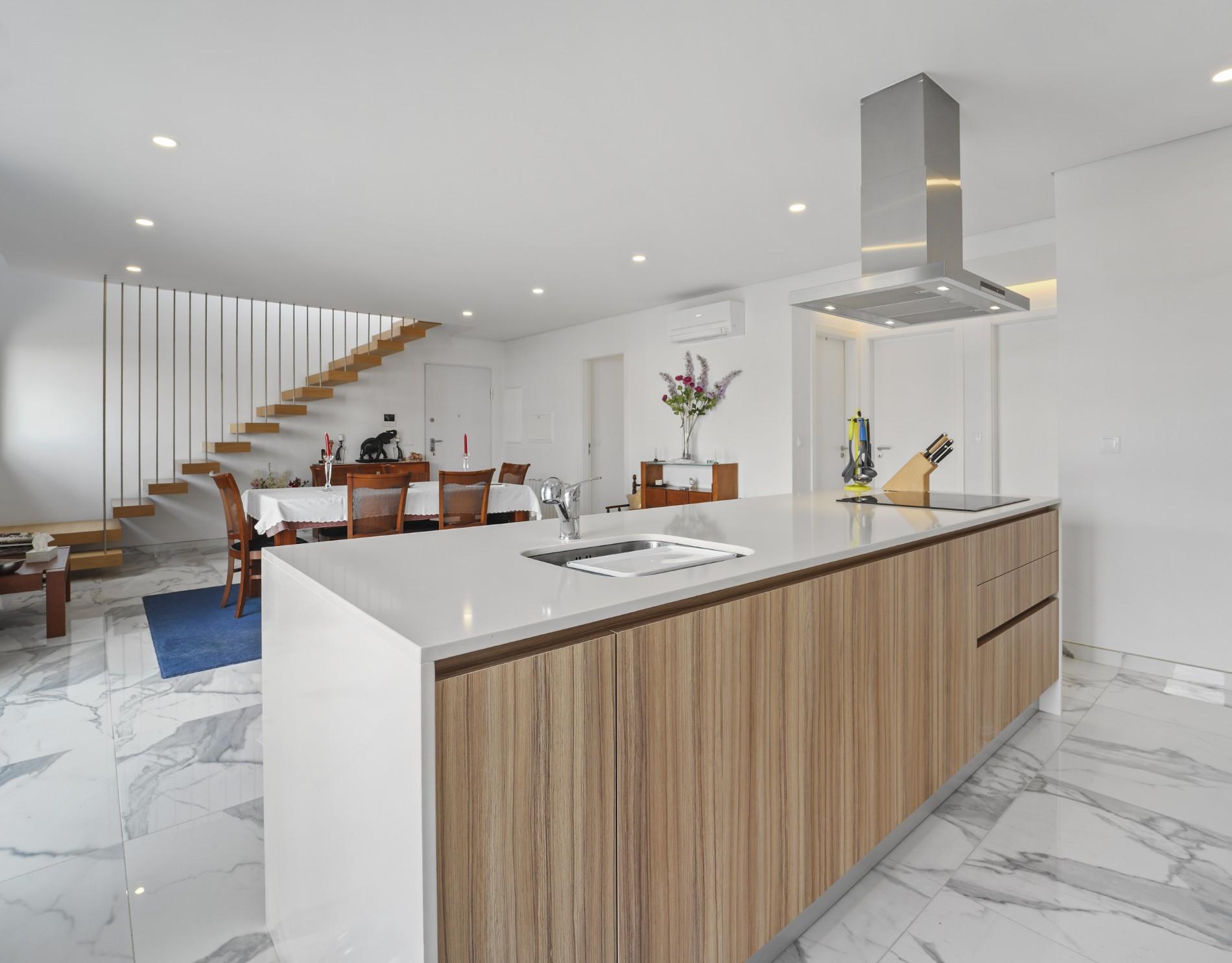 L’appartement offre 125 m² habitables et 186 m² de surface totale, conçus pour optimiser la lumière naturelle et fluidifier la transition intérieur-extérieur. L’espace salon et salle à manger en open space s’ouvre sur un balcon privé, tandis que la cuisine moderne et équipée dispose d’une buanderie fermée.