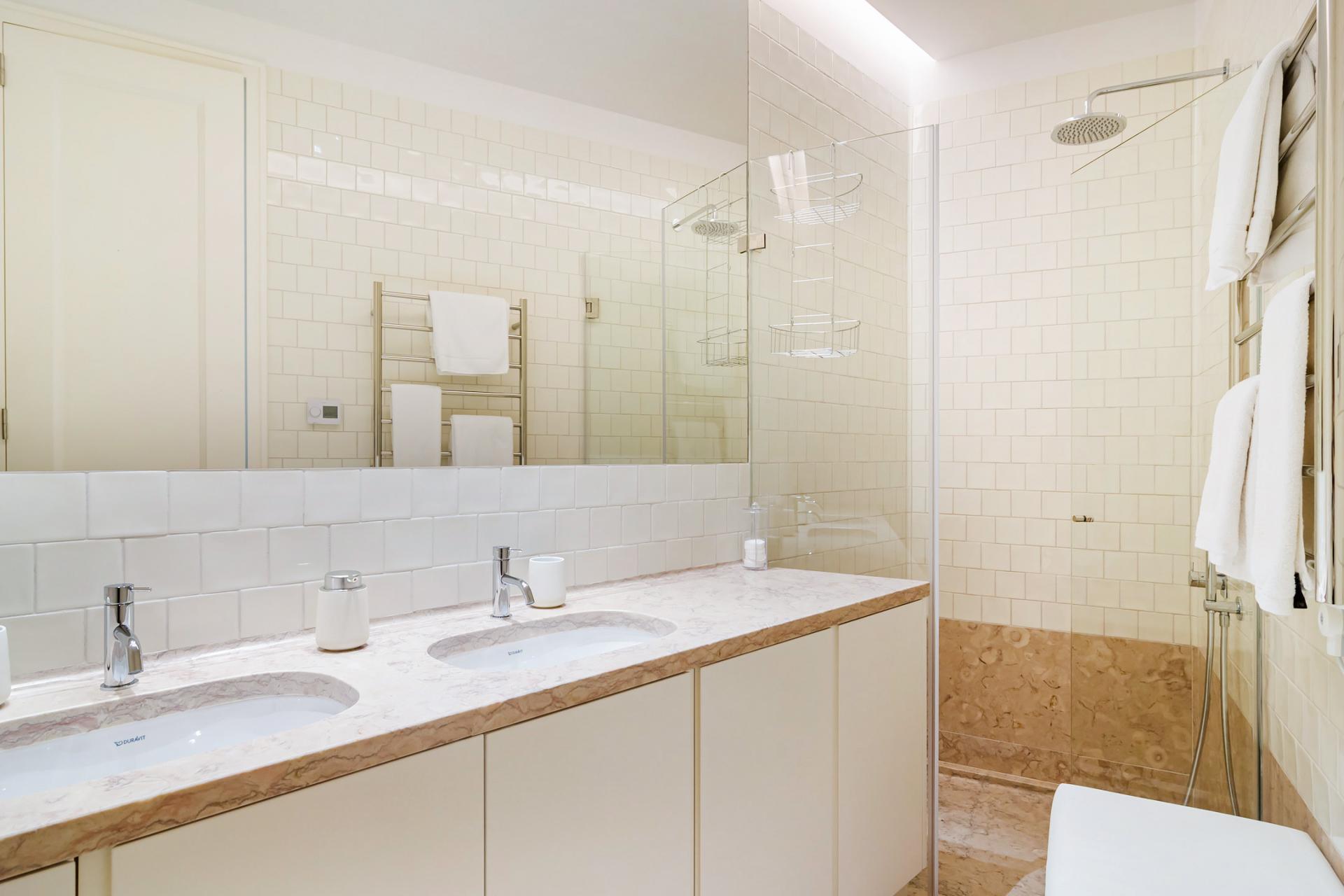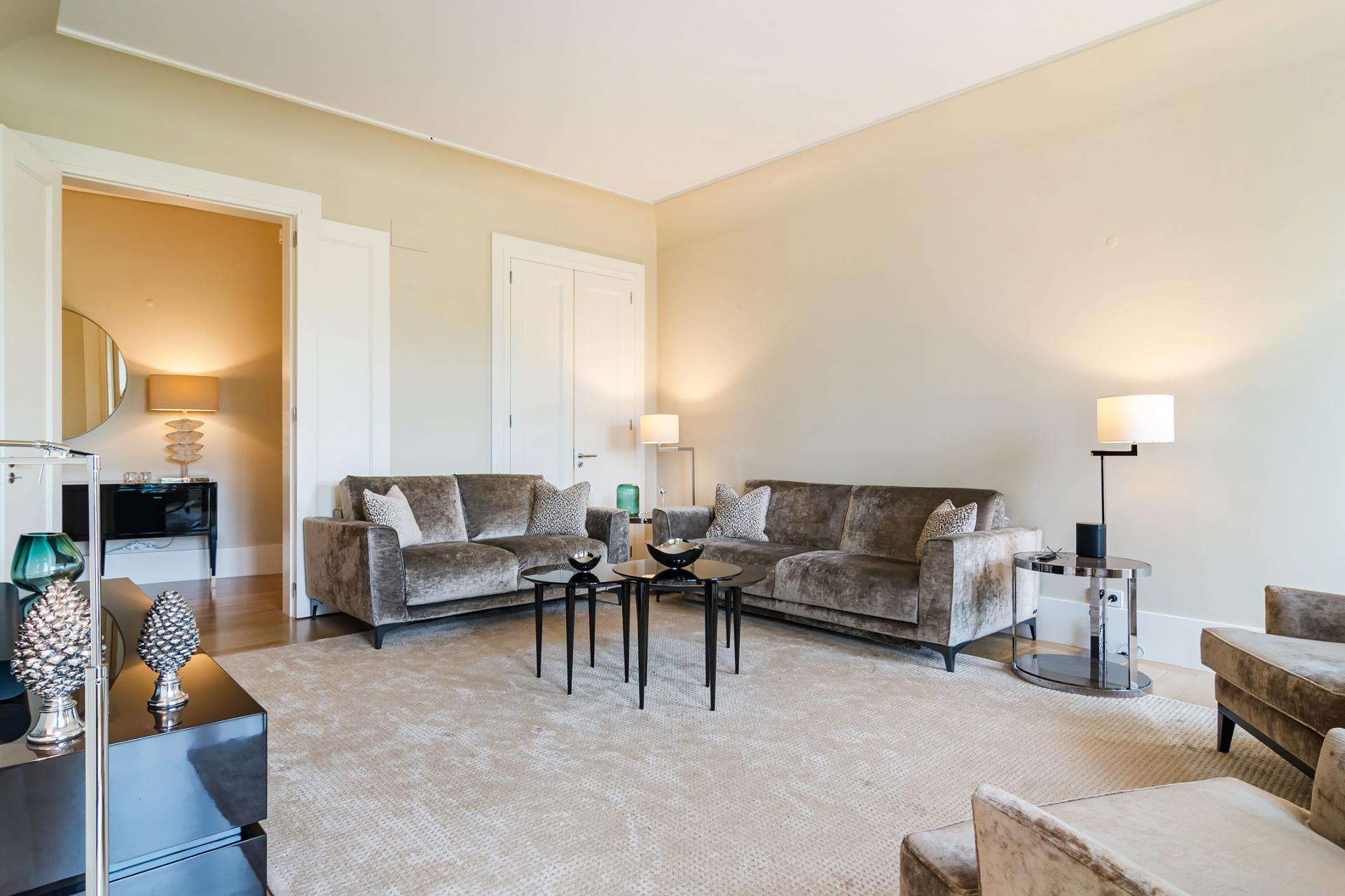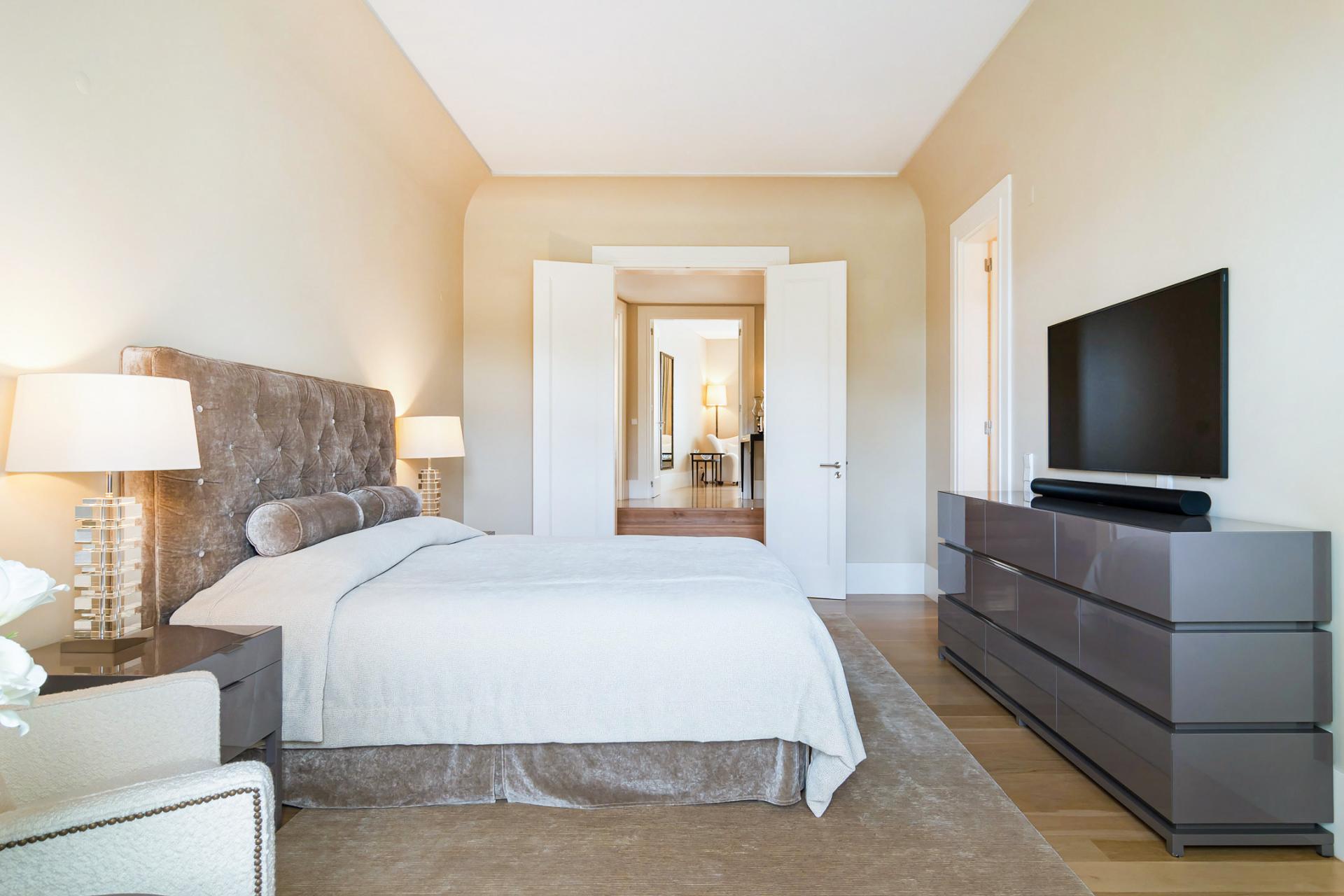 This apartment occupies the entire 2nd floor of the building and has 3 bedrooms, 2 of which are en-suite, with 23 sqm and 26 sqm. The layout allows for perfect integration of the social areas. There is a dining room, a TV room, and a 51 sqm living room next to the kitchen. The kitchen includes a laundry and storage area. It is fully equipped with top-of-the-line appliances. There are a total of 4 bathrooms, one of which is a guest bathroom. This apartment also includes two parking spaces and a storage room.