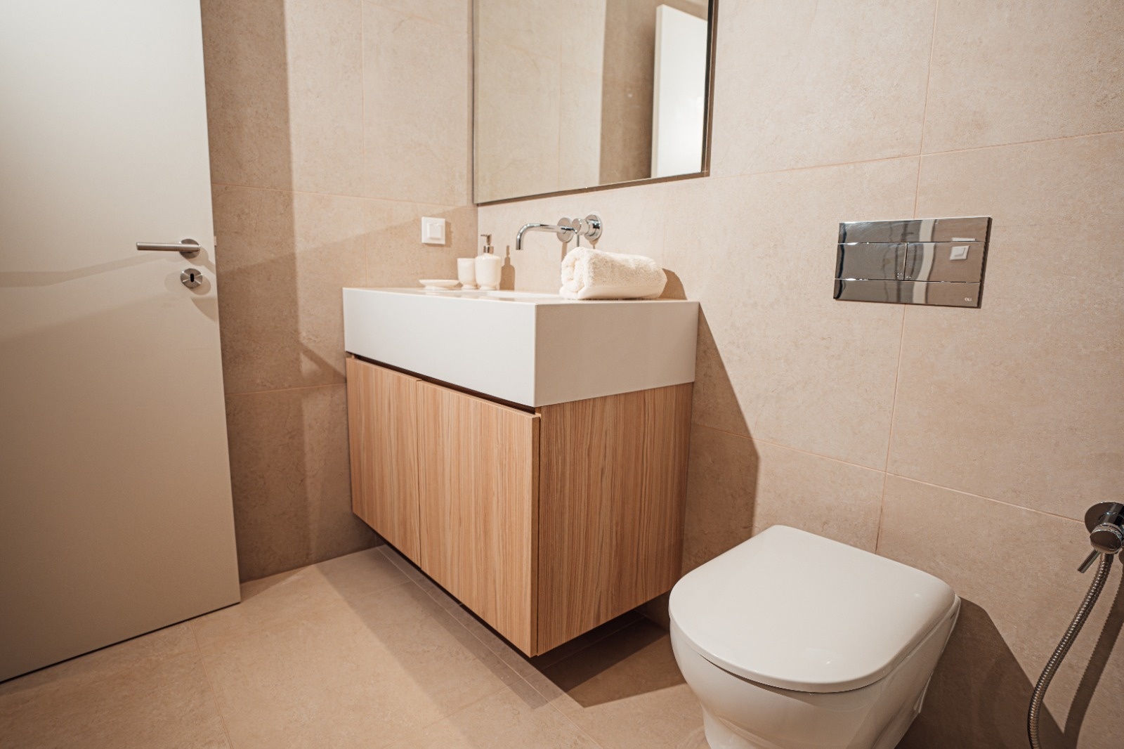 High-quality materials such as Tarkett Mountain Oak flooring, lacquered MDF carpentry, double-glazed thermal and acoustic windows, and microcement terrace walls ensure both style and comfort.
