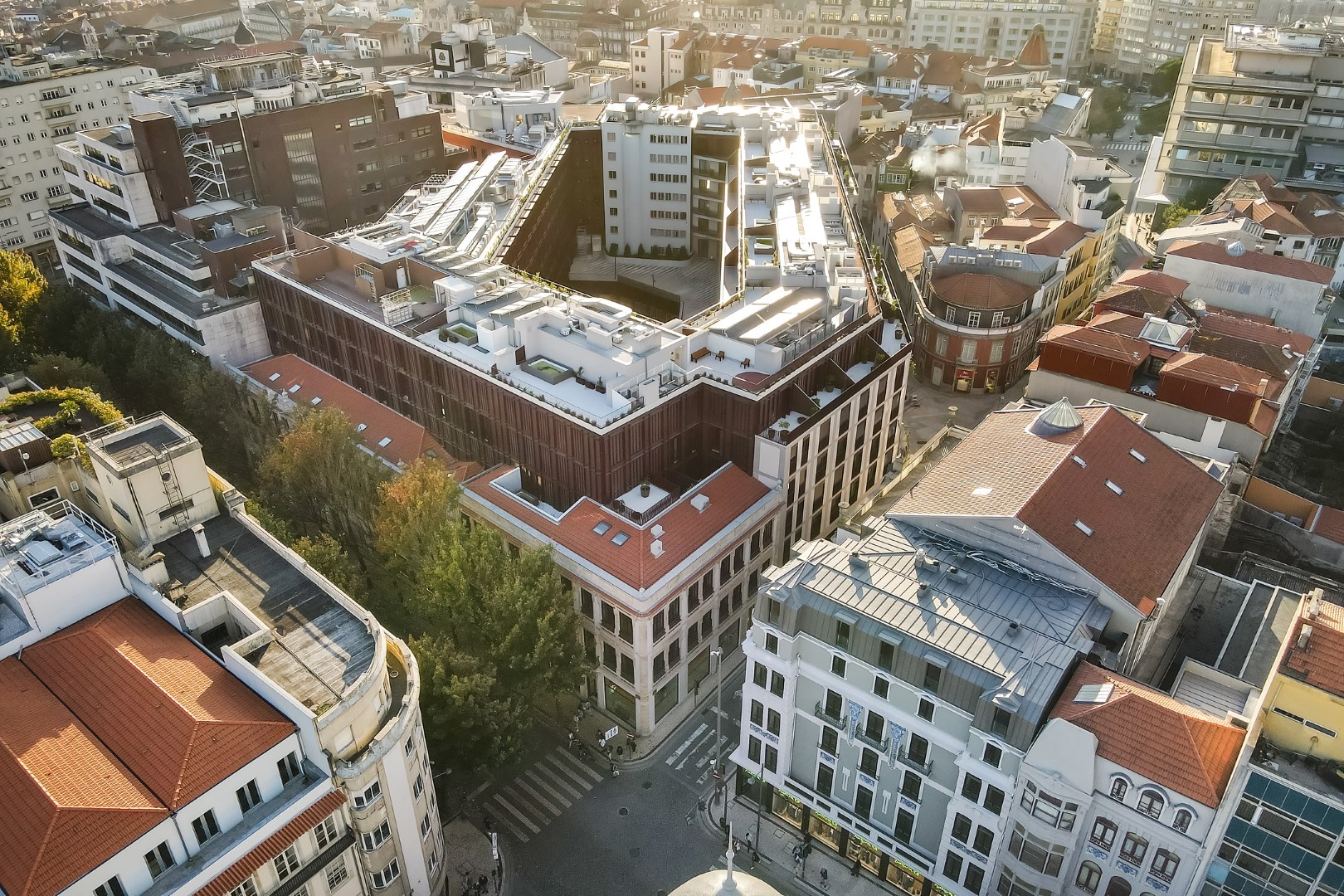 The new Bonjardim development, designed by Promontorio - Espaço de Arquitetura, has 16 commercial spaces on the first floor, as well as a hotel.