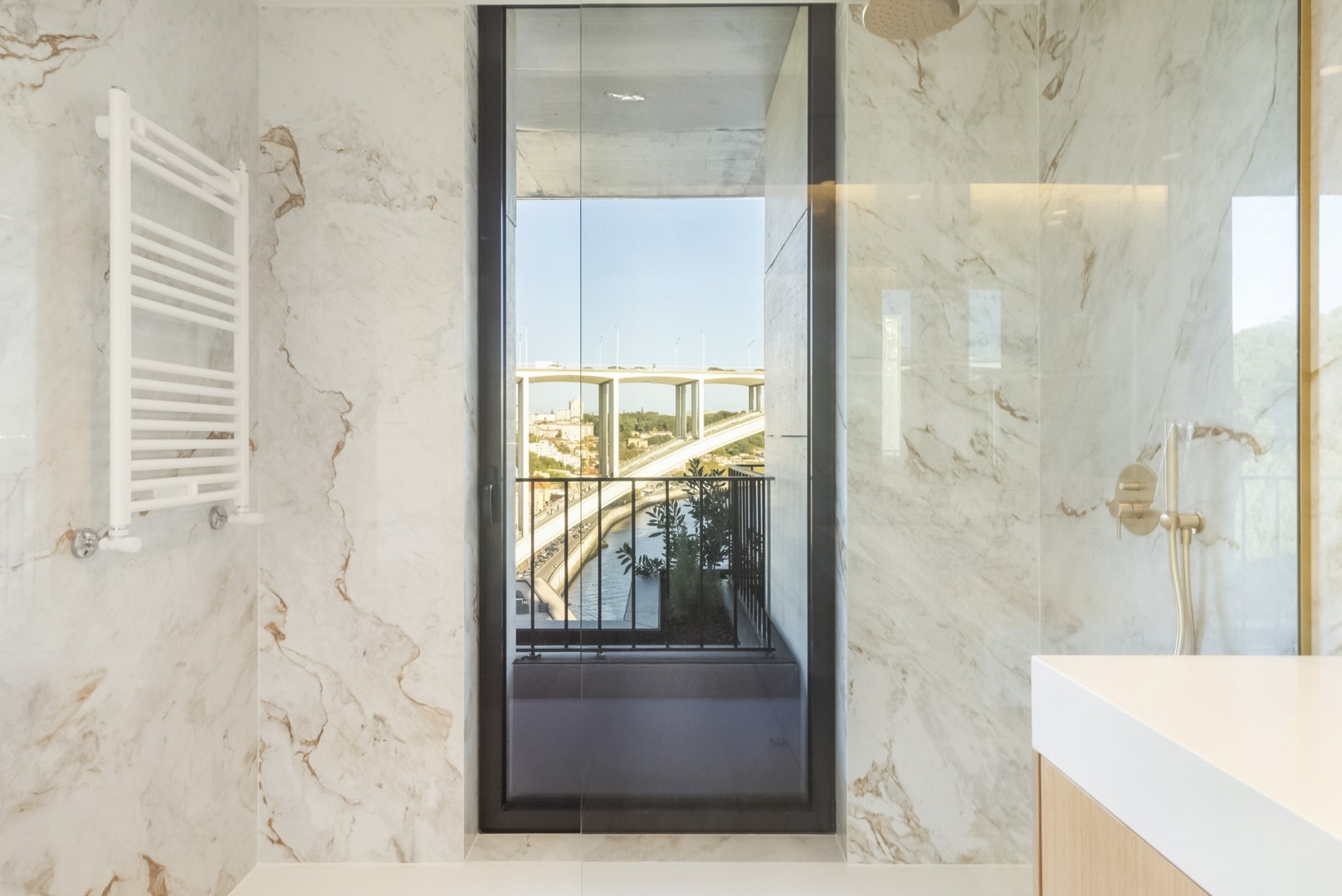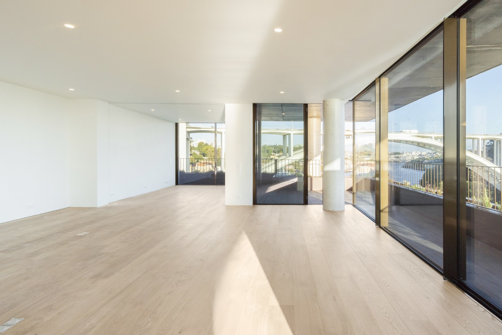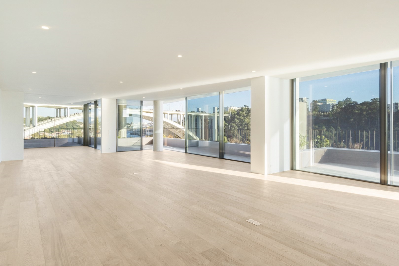 This luxurious and exclusive 344m2 apartment is the combination of a T3 and a T4, on the penultimate floor of the Panorama Douro Residences building, facing the Douro River in Porto.