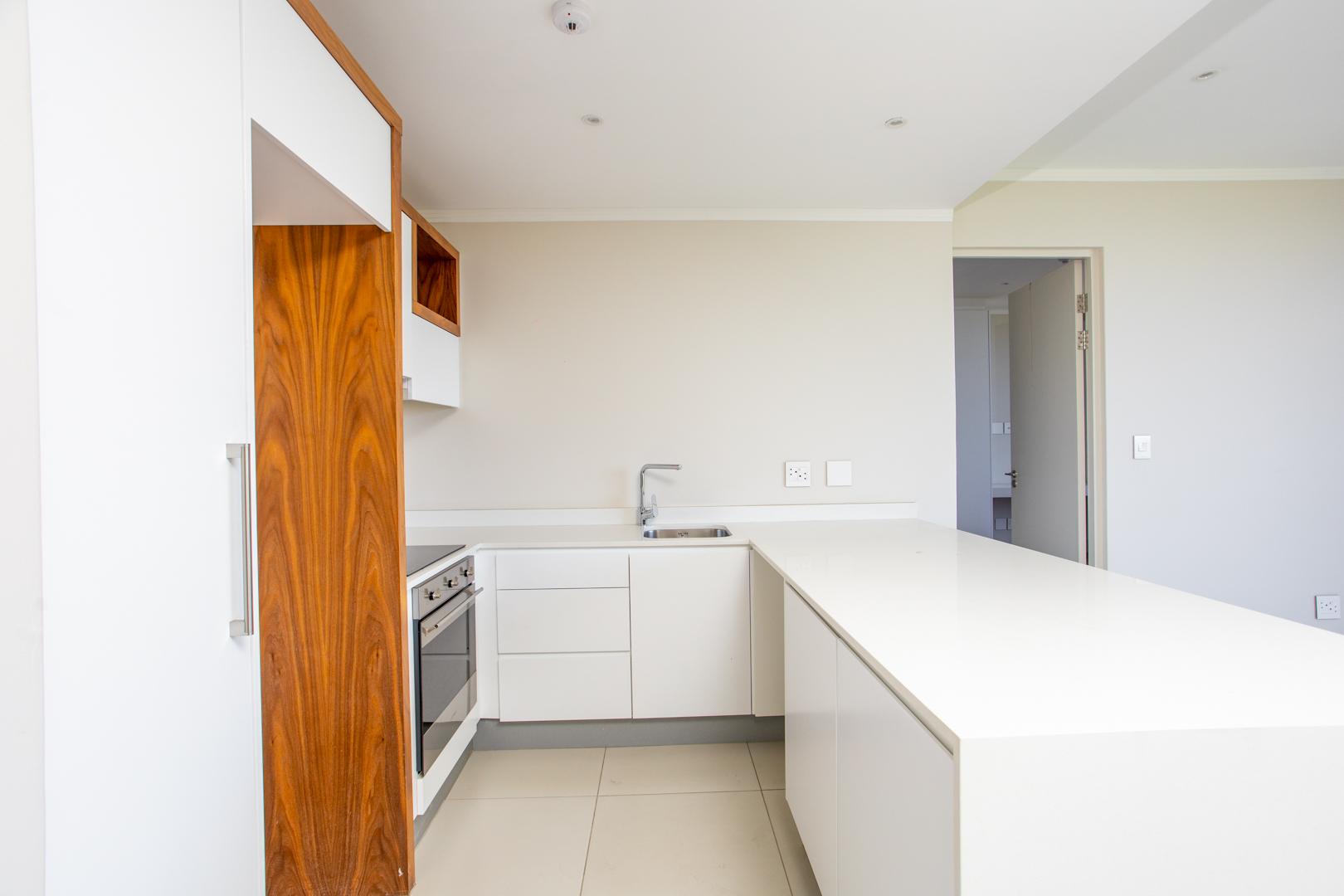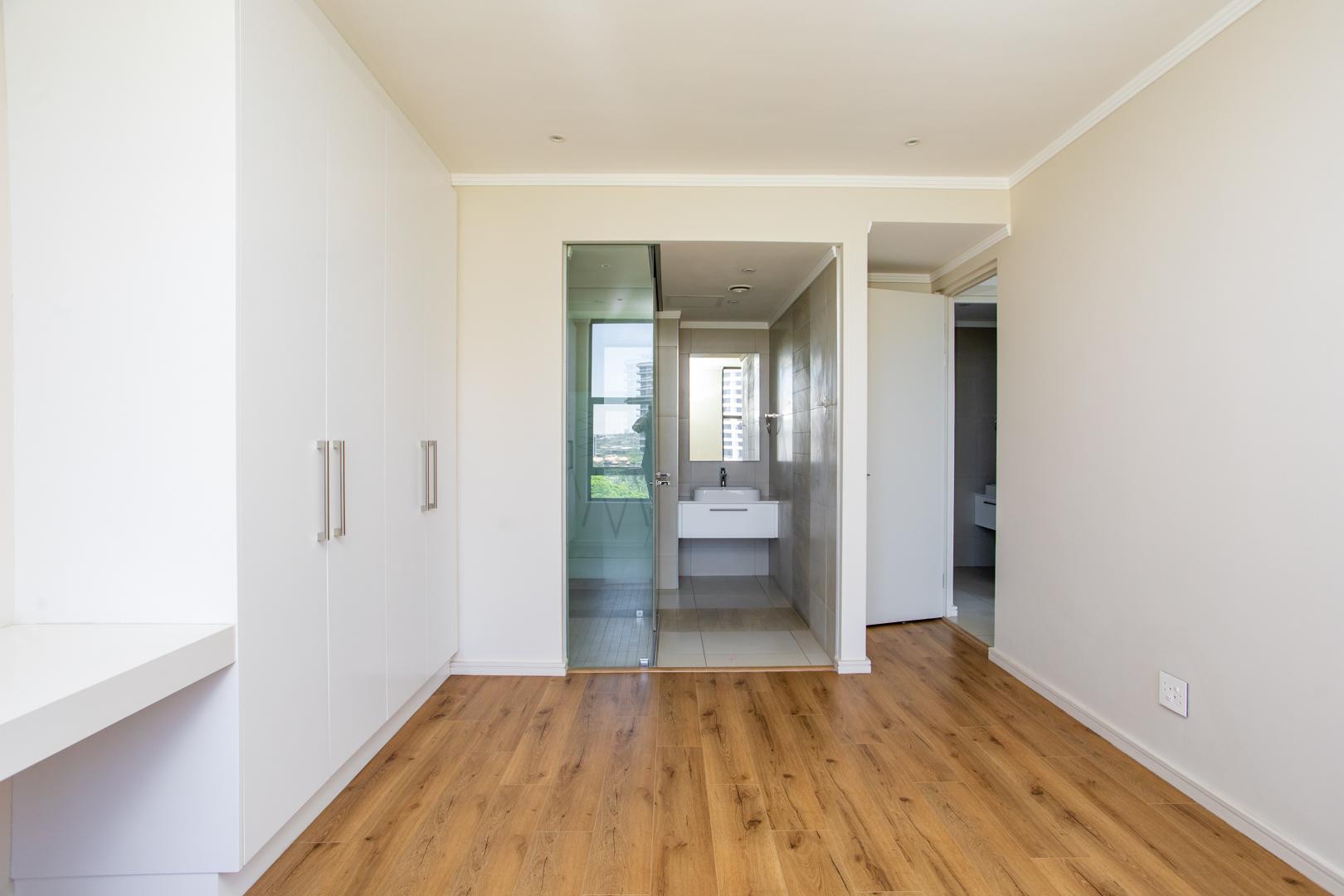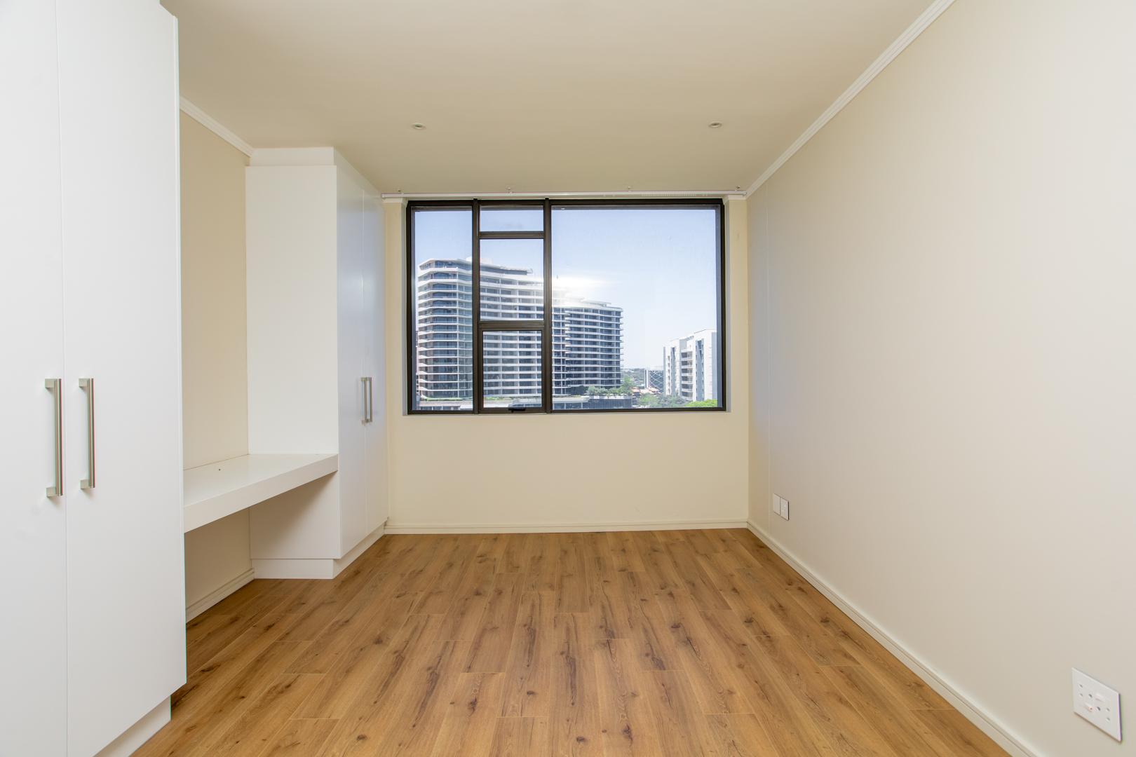 Sliding stacking doors open from the living area to a private balcony, where residents can enjoy panoramic views of the city and, in the distance, the Hartebeest mountains. It’s the perfect spot to unwind after a long day or entertain guests while taking in the serene surroundings.