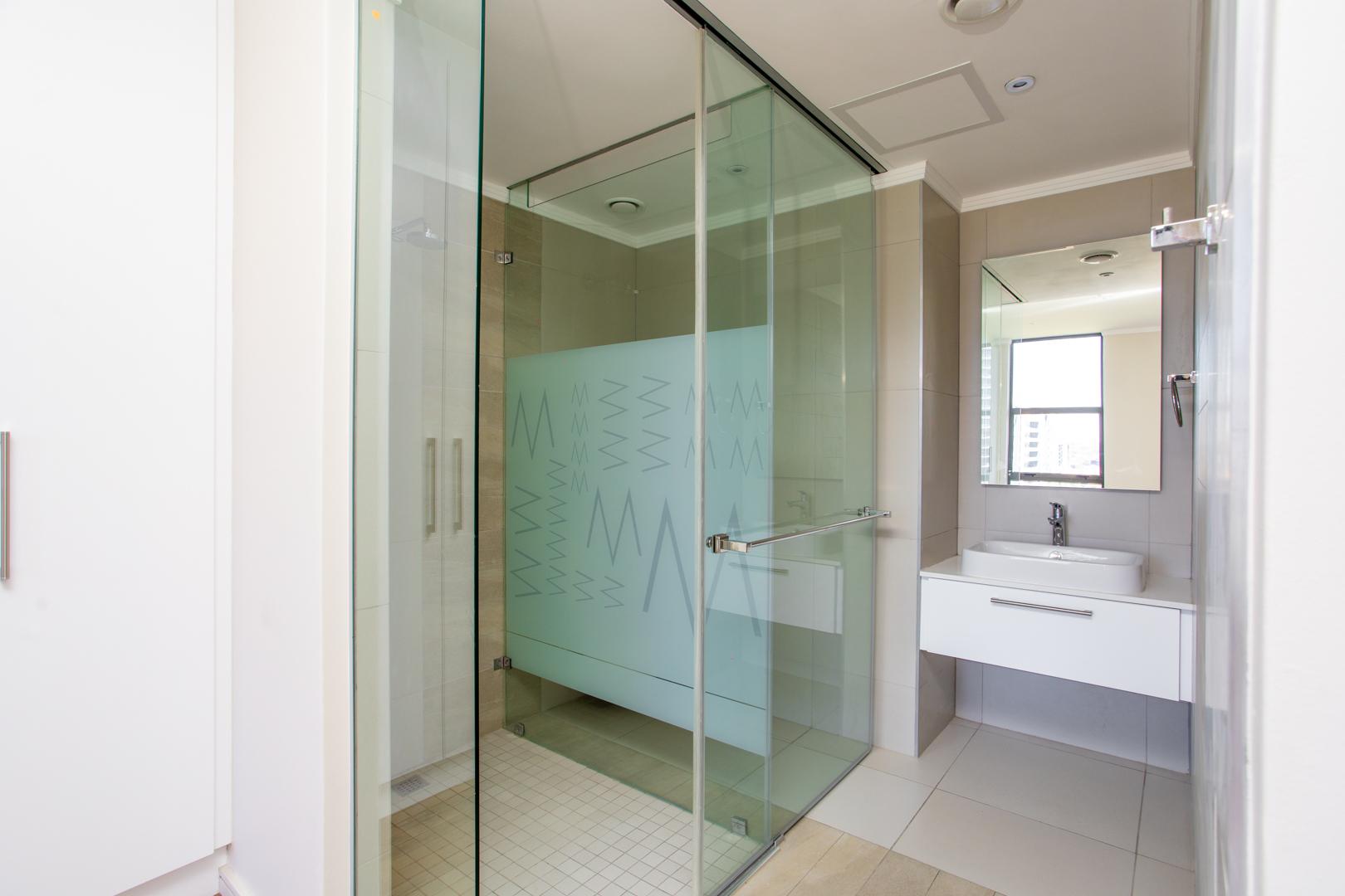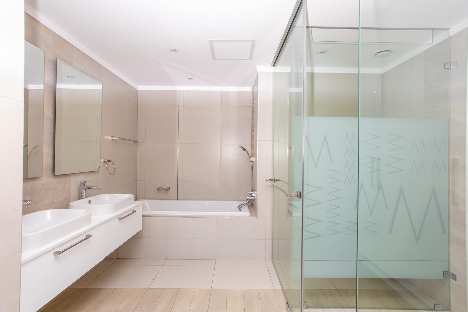Each of the three bedrooms provides a unique view, showcasing the iconic architectural skylines and curves of Johannesburg’s buildings. The two ensuite bathrooms are elegantly finished with Caesarstone countertop basins, creating a sophisticated, contemporary atmosphere. A guest toilet and shower offer added convenience and comfort for visitors.