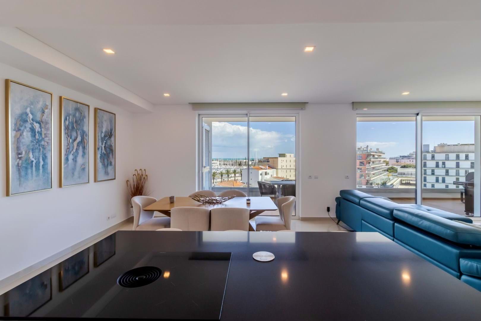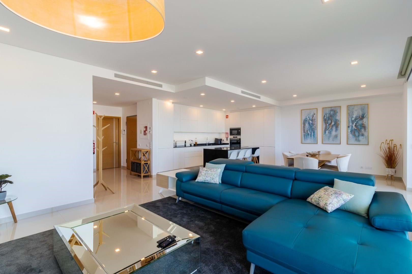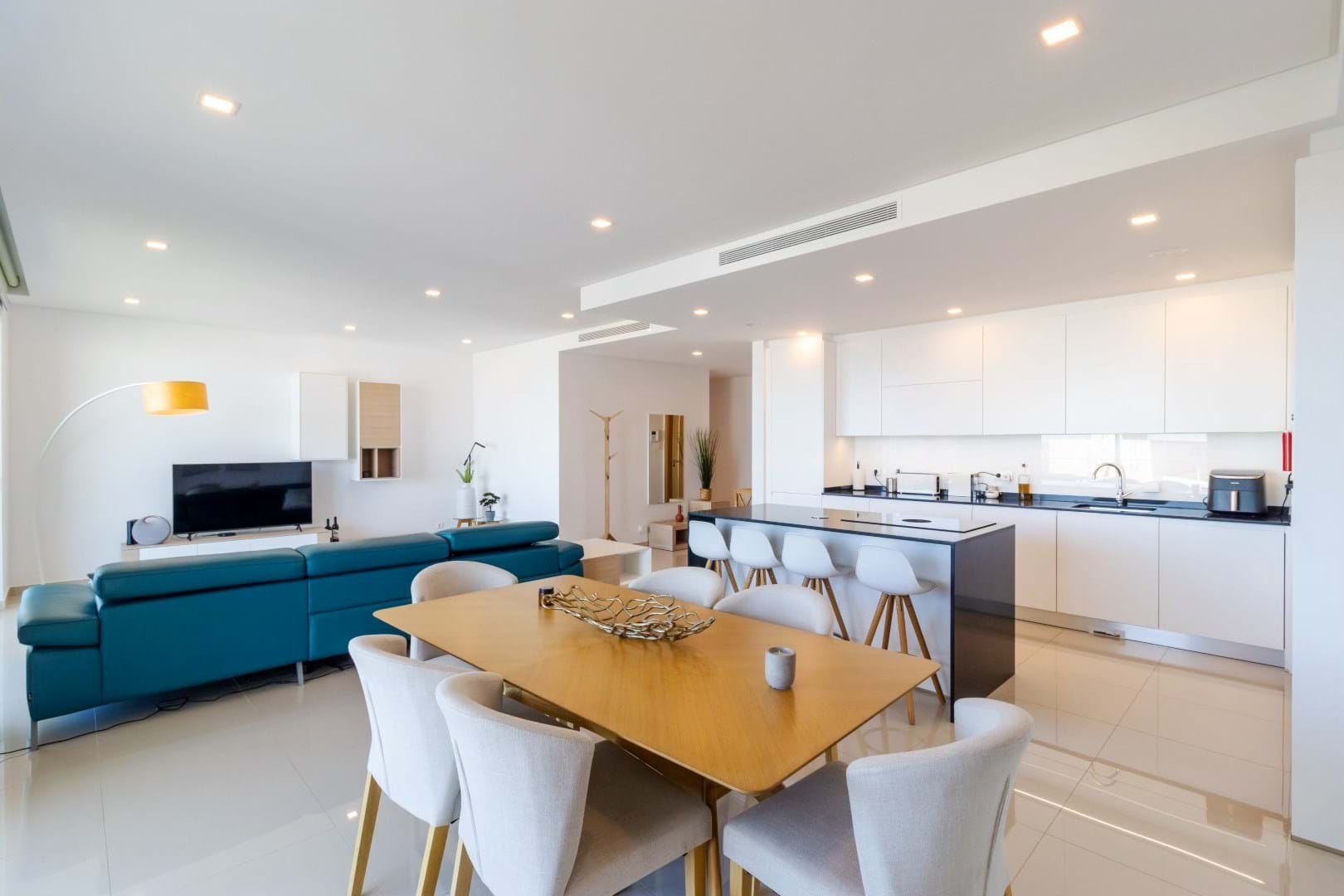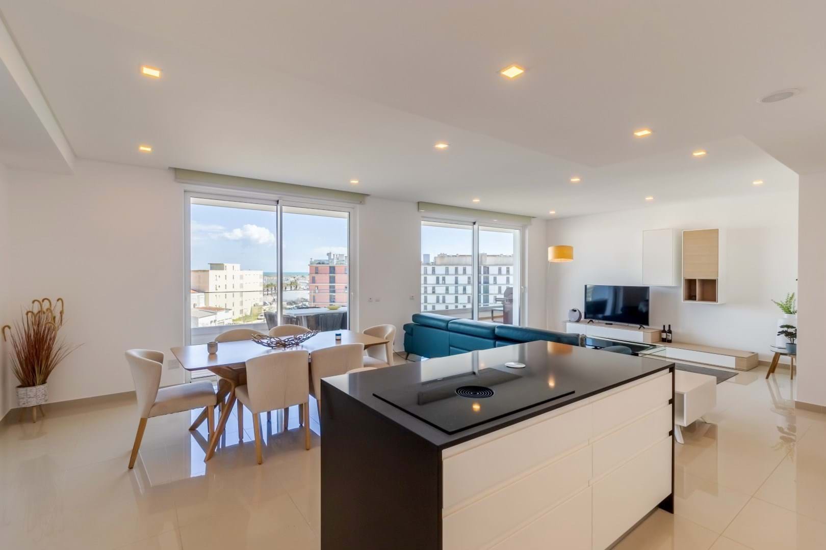 Designed for both comfort and style, the apartment's open-plan layout seamlessly connects the living room, dining room, and kitchen, creating a bright, spacious atmosphere that flows onto a generously sized terrace. This stunning outdoor area is ideal for entertaining, with panoramic sea views that create a truly memorable backdrop.
