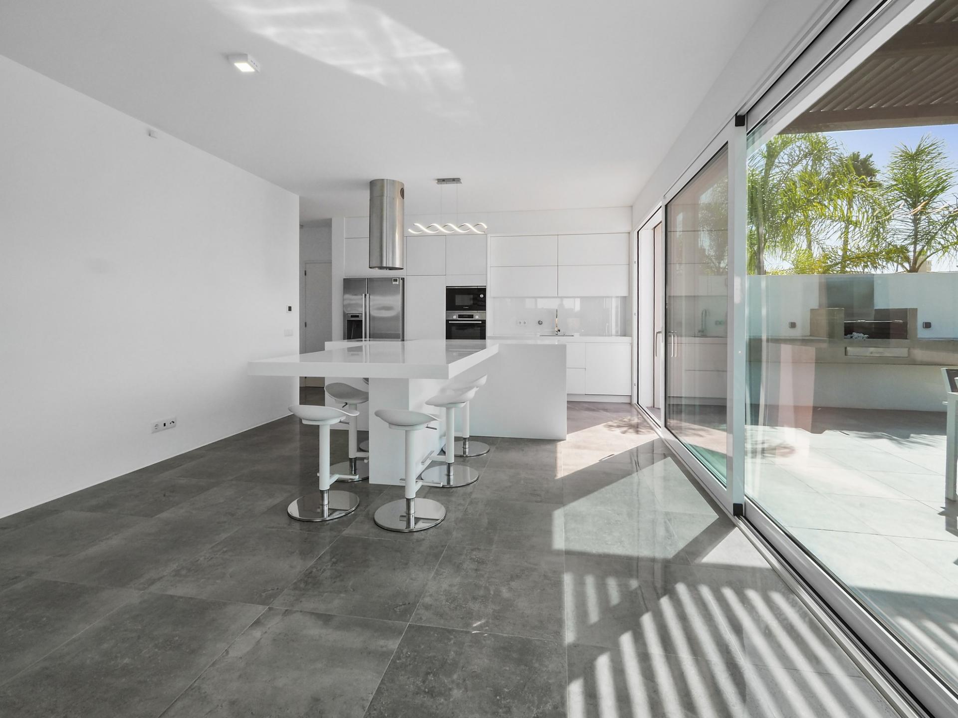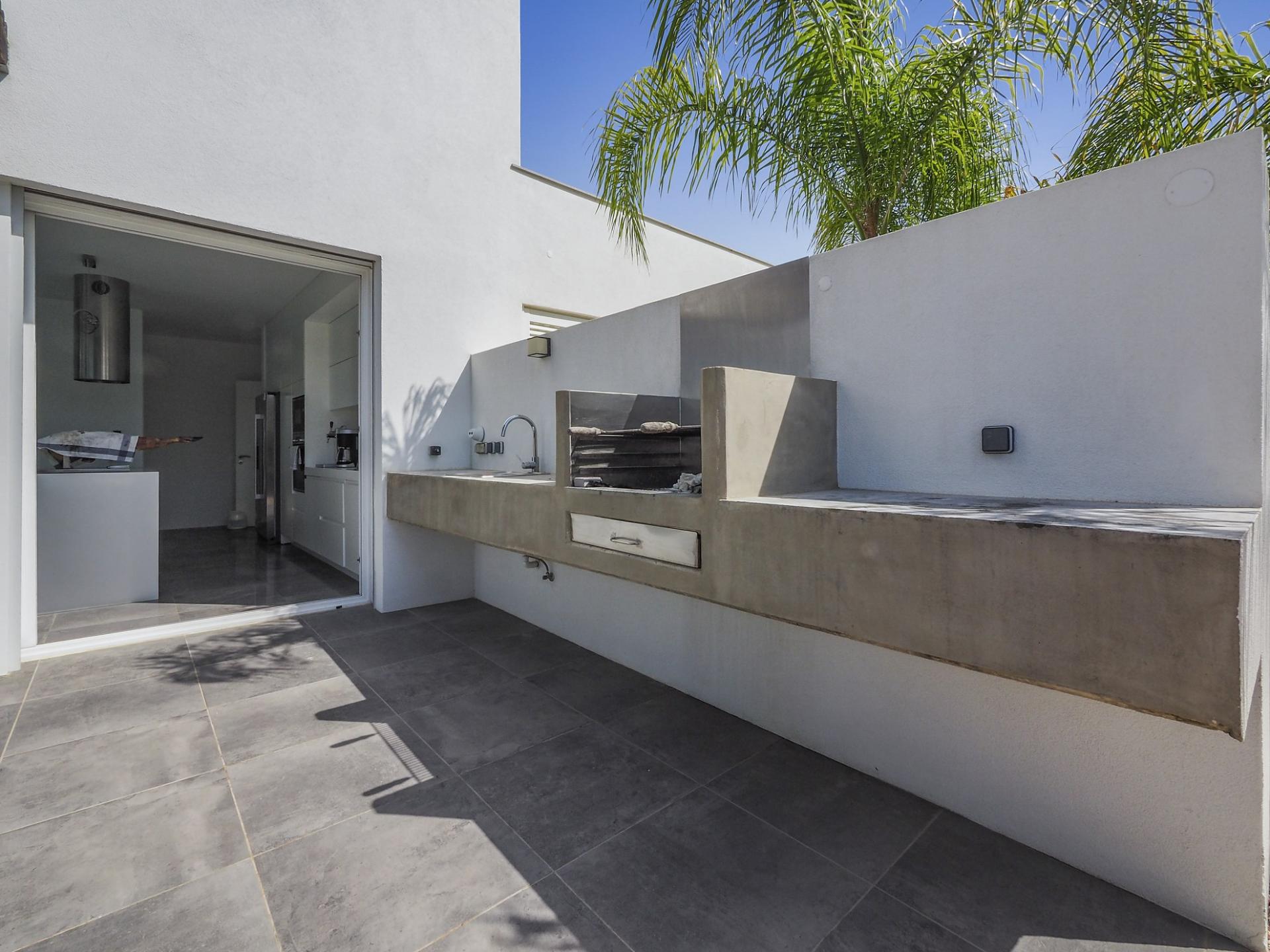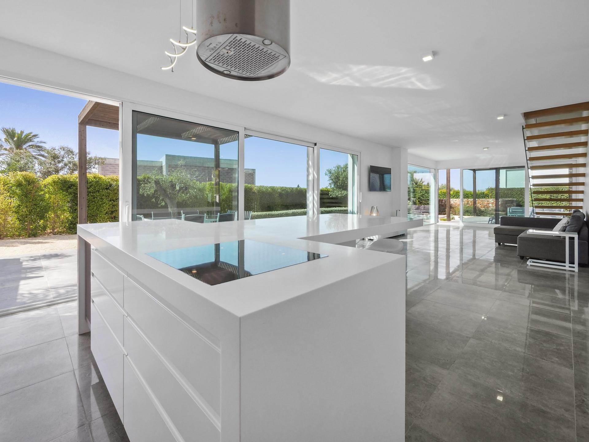 The villa comprises three bedrooms ensuite and one guest toilet. The open-plan living flows seamlessly into a fully equipped kitchen, ideal for both everyday living and entertaining. Additional spaces include a laundry room, a garage for one car, and a carport.