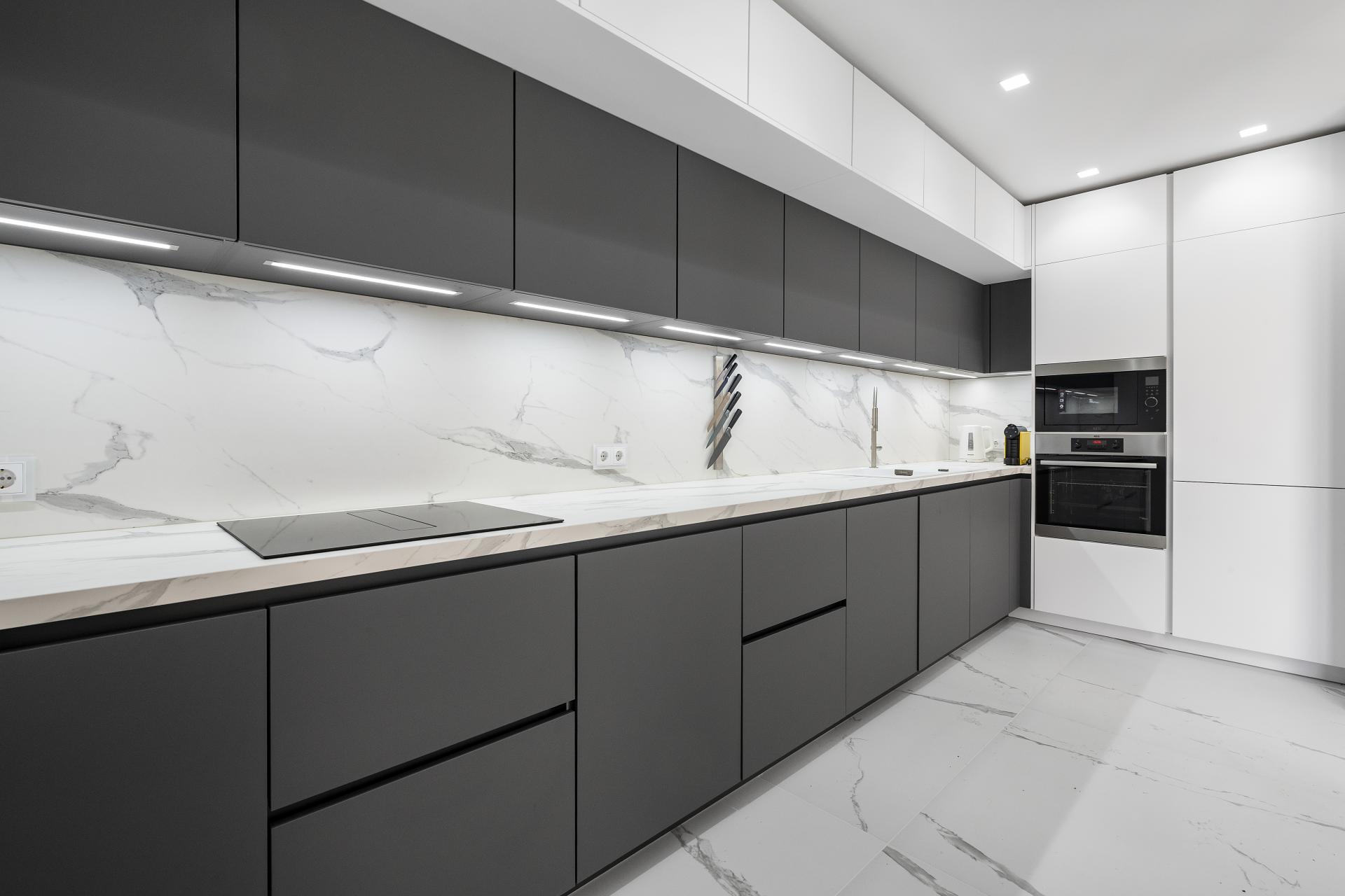 Inside, the villa spans 195 m² of bright, open-plan space. The main living and dining area flows effortlessly into a fully equipped kitchen with clean modern lines and quality finishes. Natural light fills every room, while warm wooden floors in the bedrooms and marble-finished bathrooms add timeless sophistication. All three bedrooms feature en-suite bathrooms and direct access to the garden, ensuring comfort and privacy throughout.