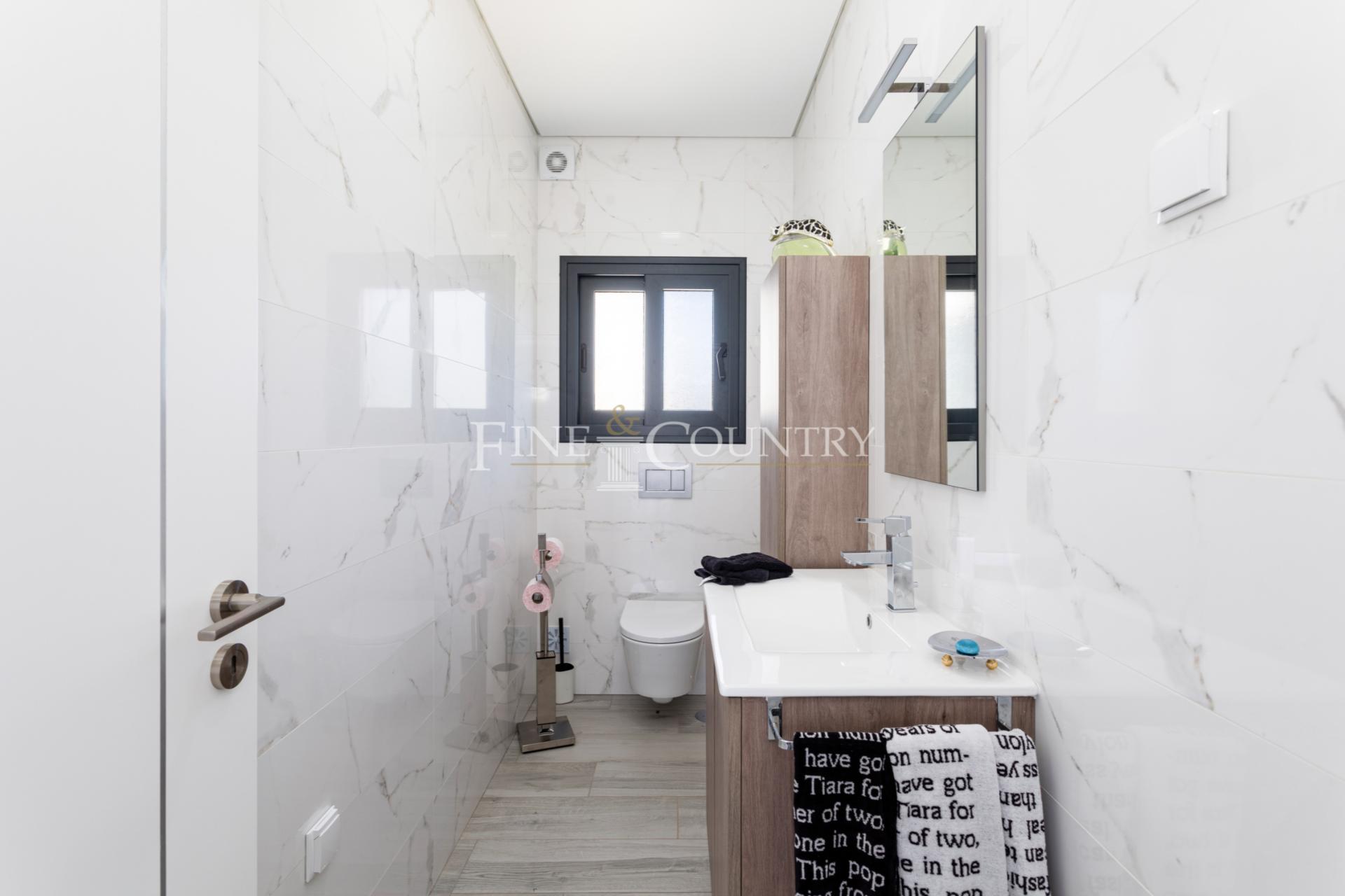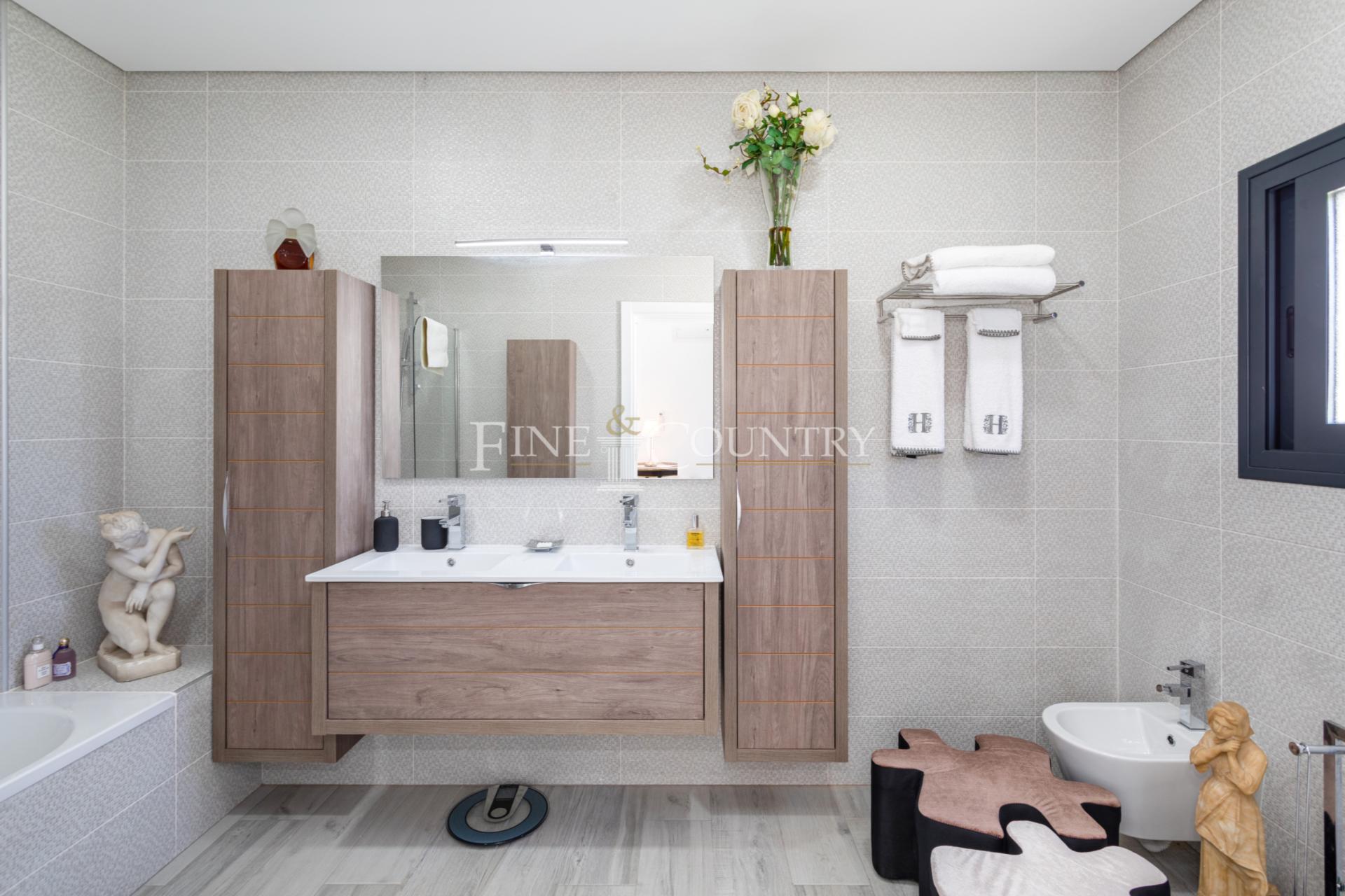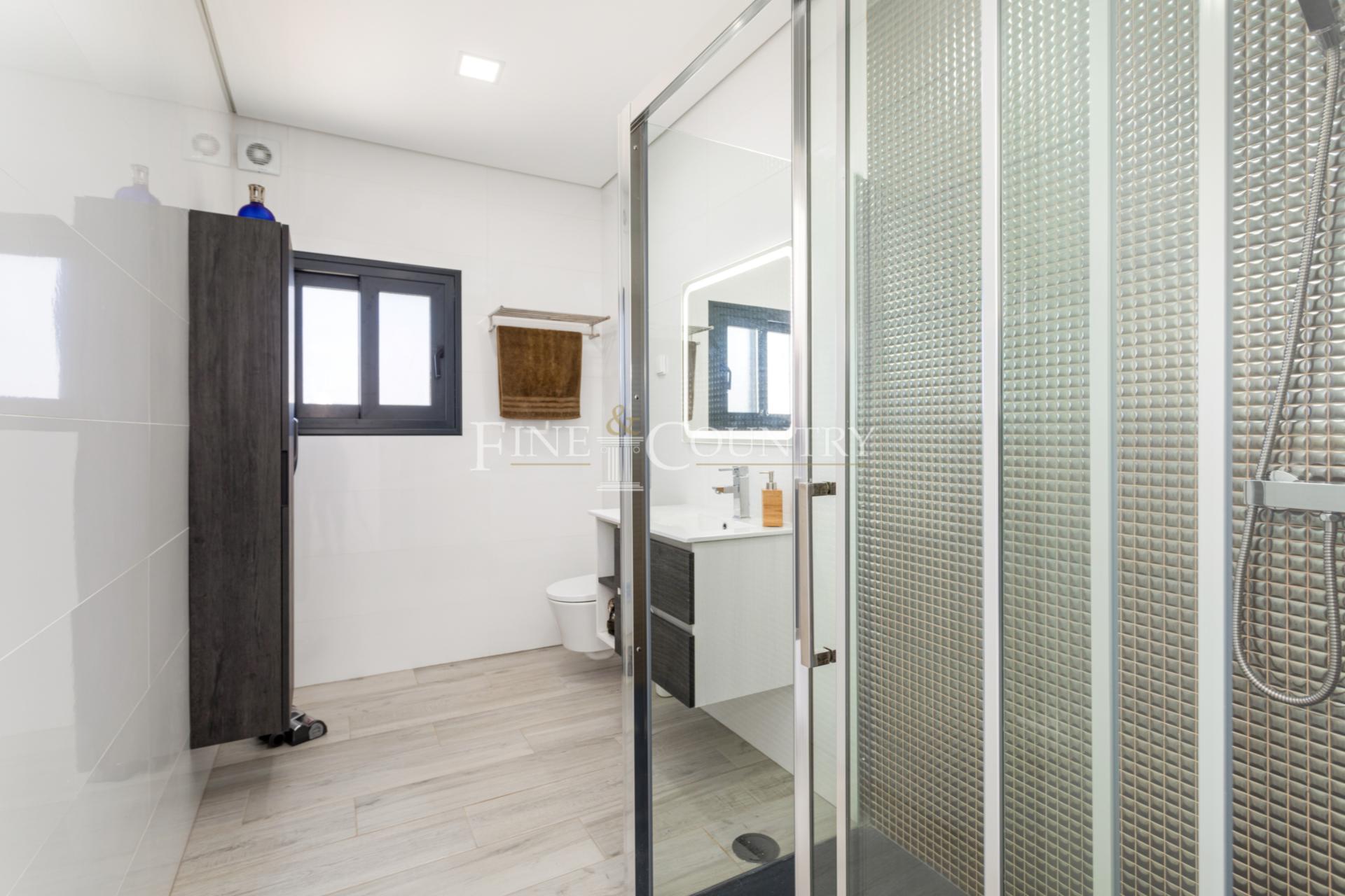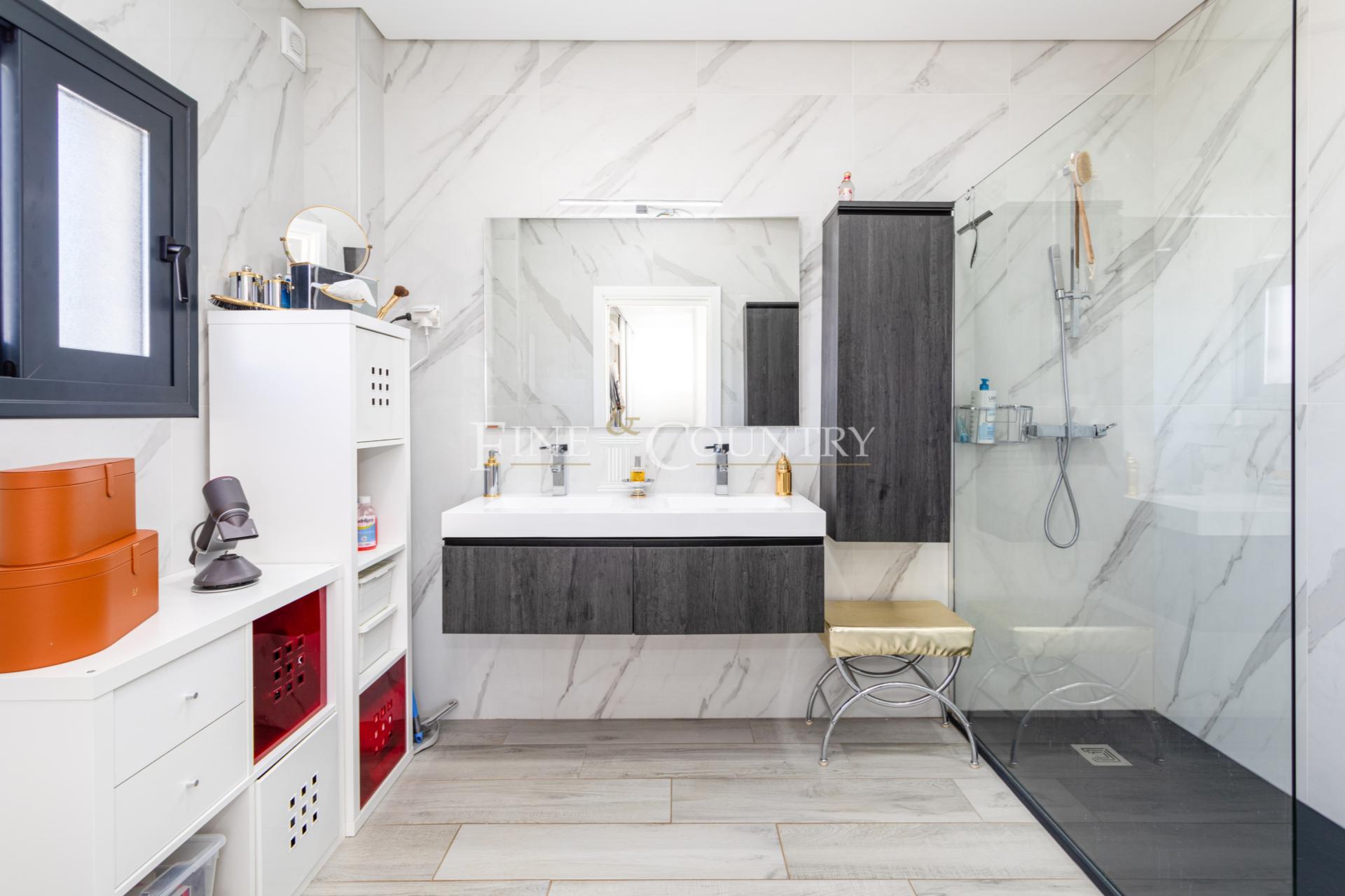Upstairs, a hall allows you to access the 2 en-suites, the main one has a more spacious bathroom and a dressing room. The access to the outdoor terraces is easy and offers you the possibility of relaxation, sport, yoga, or reading while enjoying the pretty countryside or the sea views.