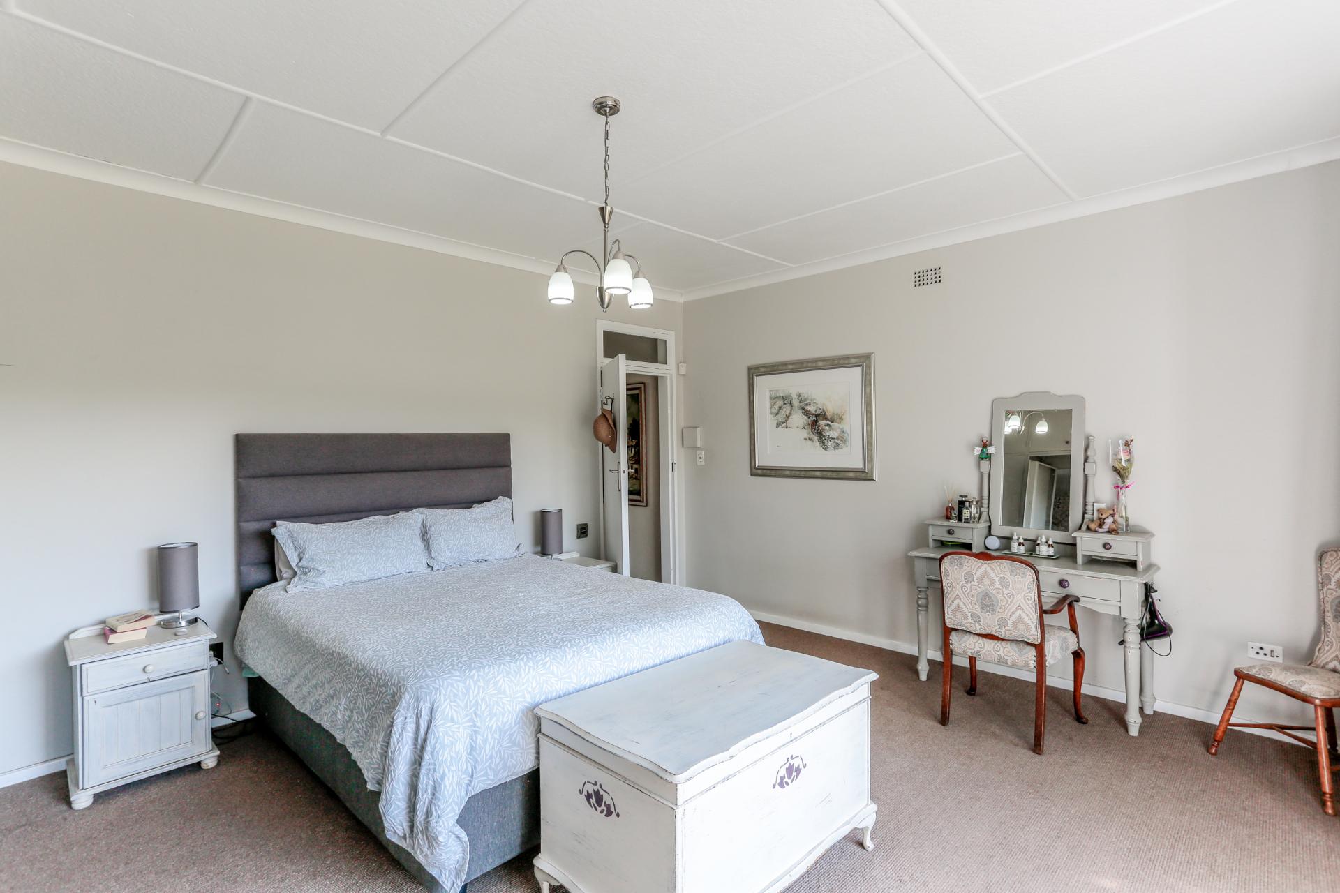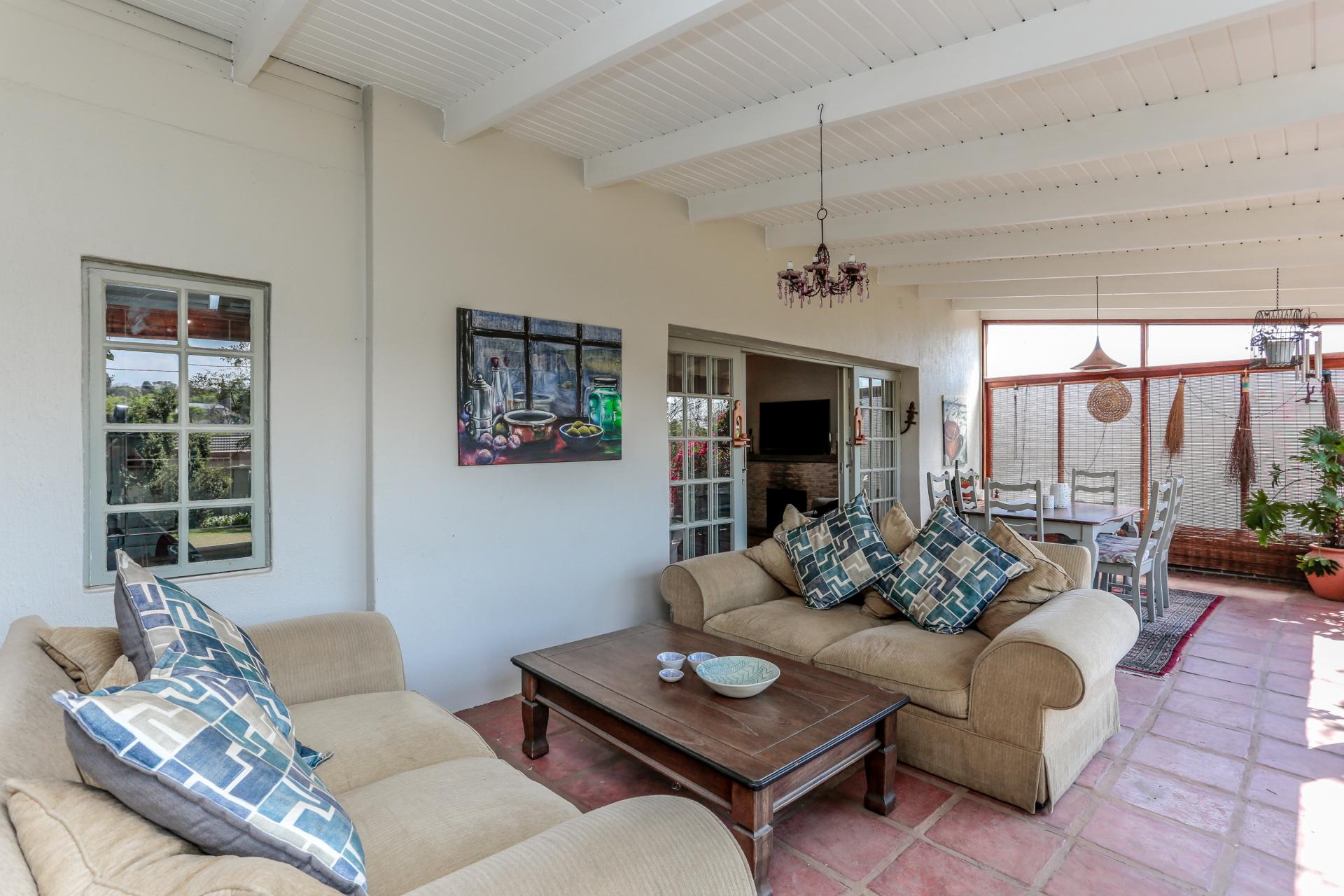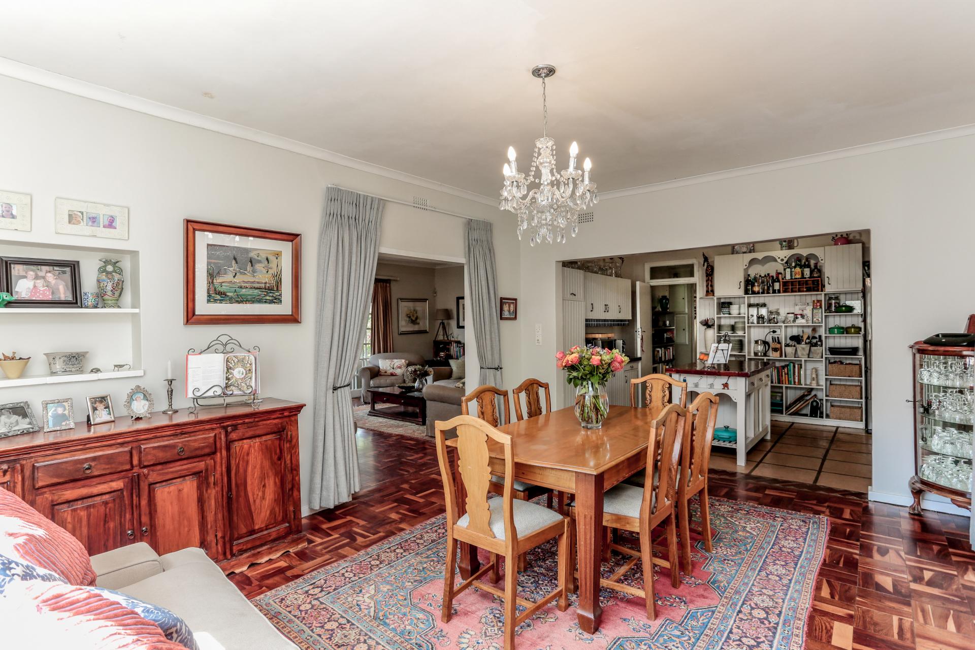 As you enter, you are greeted by a delightful patio that overlooks a sprawling green garden adorned with majestic Jacaranda trees. From here, you can take in the panoramic views of the tranquil suburb of Craighall Park. The spacious lounge, with its parquet floors, is anchored by a large wood-burning fireplace, creating a cosy focal point. French doors open onto the patio, seamlessly blending indoor and outdoor living spaces. Flowing from the lounge is the dining room, providing an ideal space for family gatherings and entertaining. French doors lead to a charming private courtyard garden, perfect for intimate al fresco dinners. The country-style kitchen boasts a large gas stove, a central island, and a separate scullery. White wooden cabinetry and wooden countertops add to the warm, rustic charm.