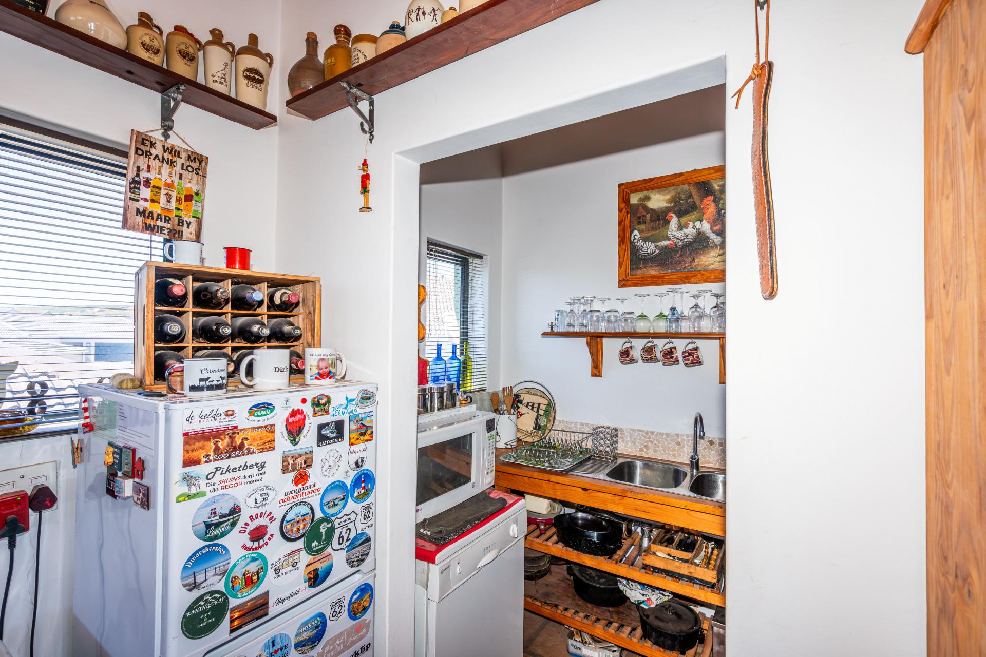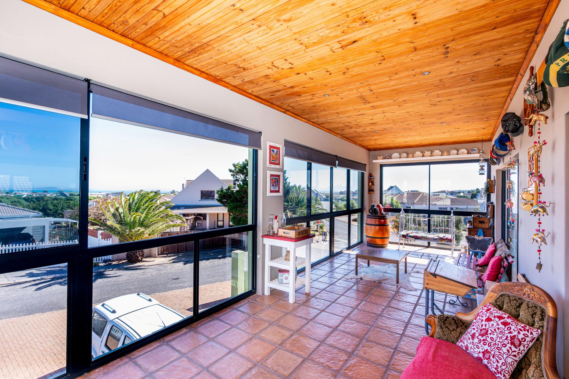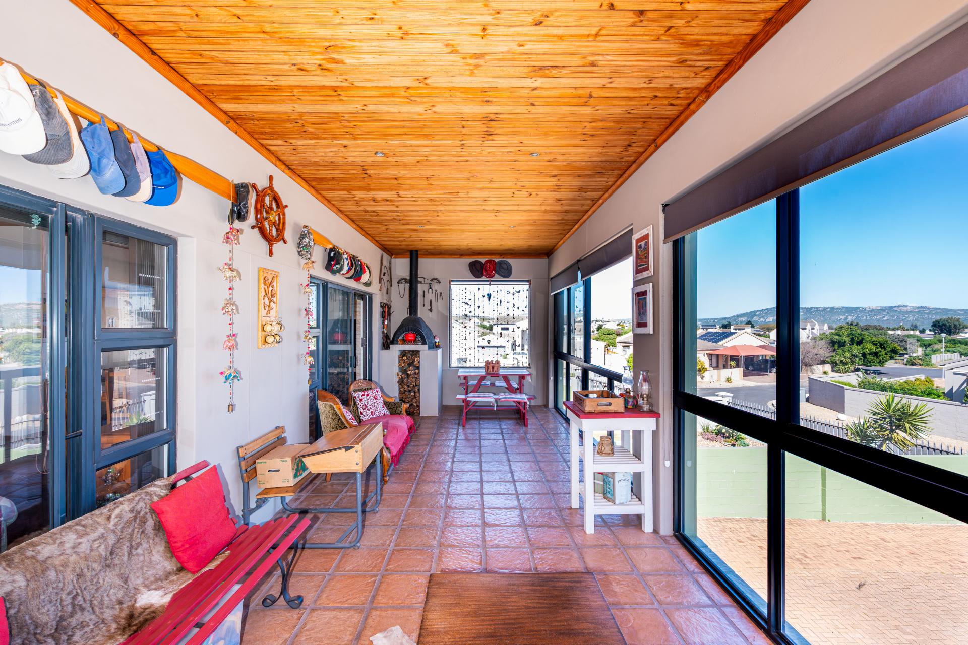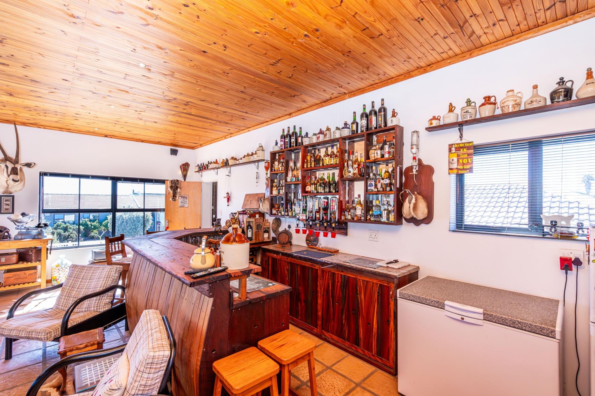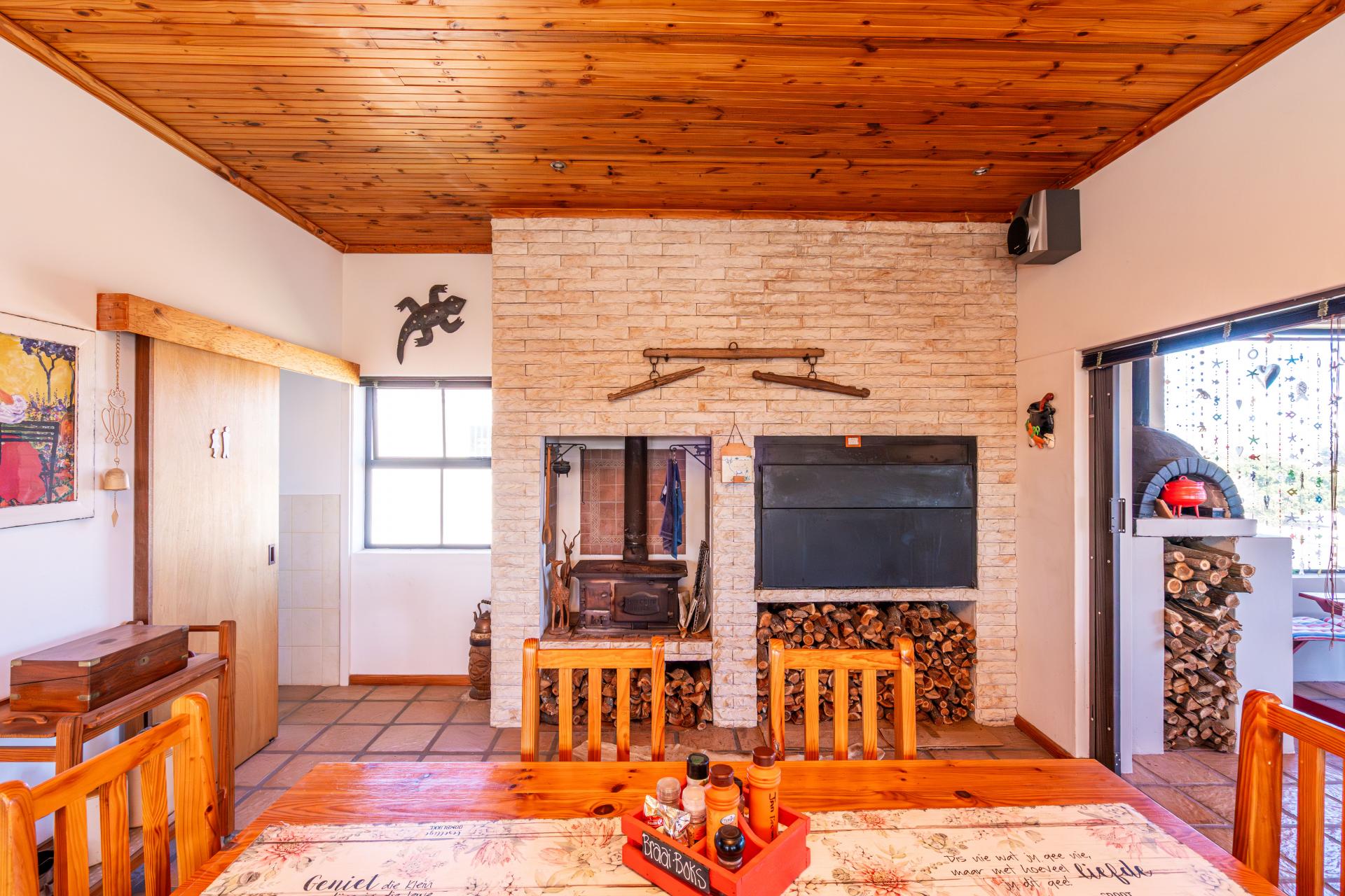 A staircase leads to the upper level, where a spacious entertainment area showcases beautiful views of the Langebaan Lagoon. Complete with a built-in bar, kitchenette, built-in braai, Dover stove, and a guest bathroom, this area is designed for hosting. Sliding doors extend the space to an enclosed balcony with a built-in pizza oven – perfect for year-round gatherings.