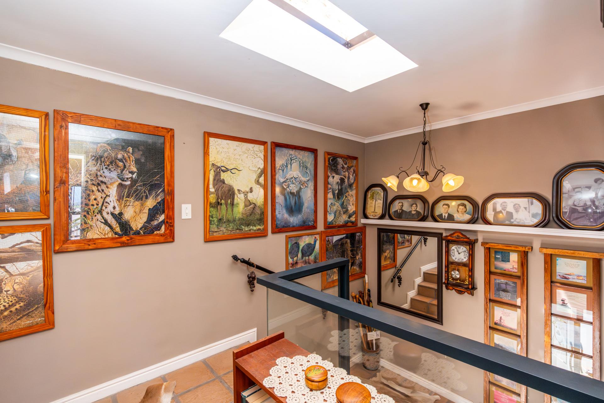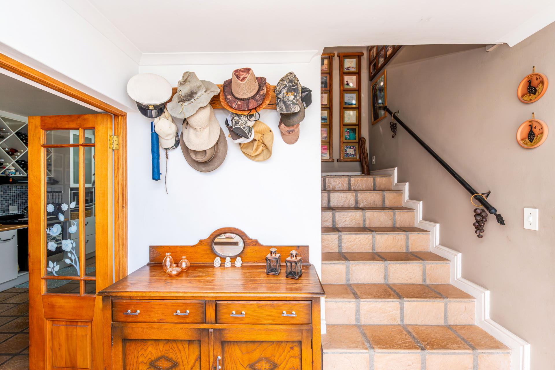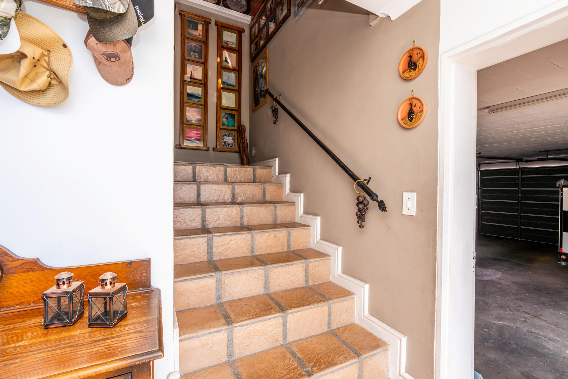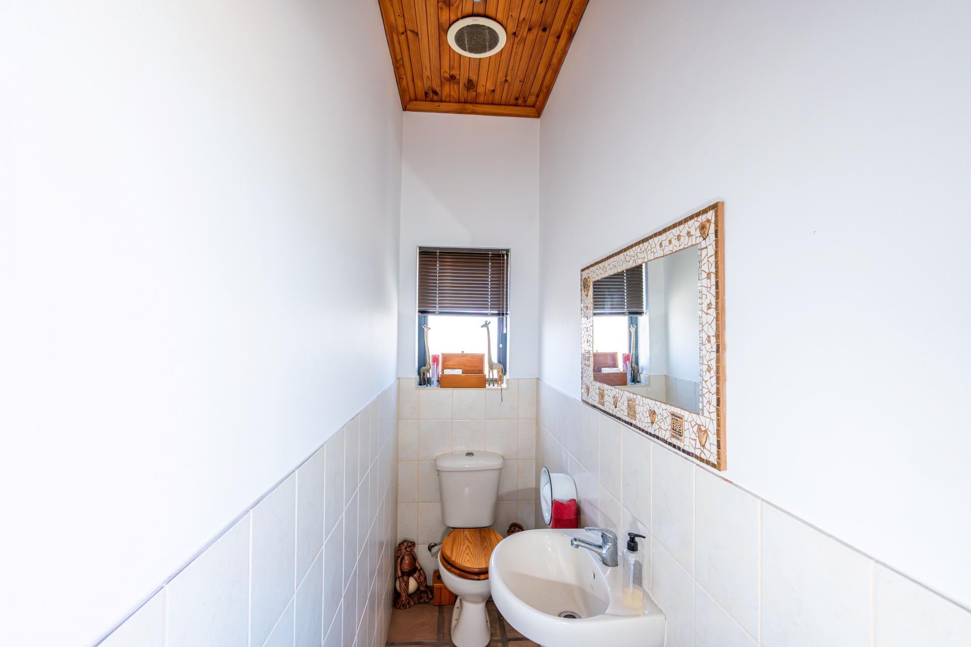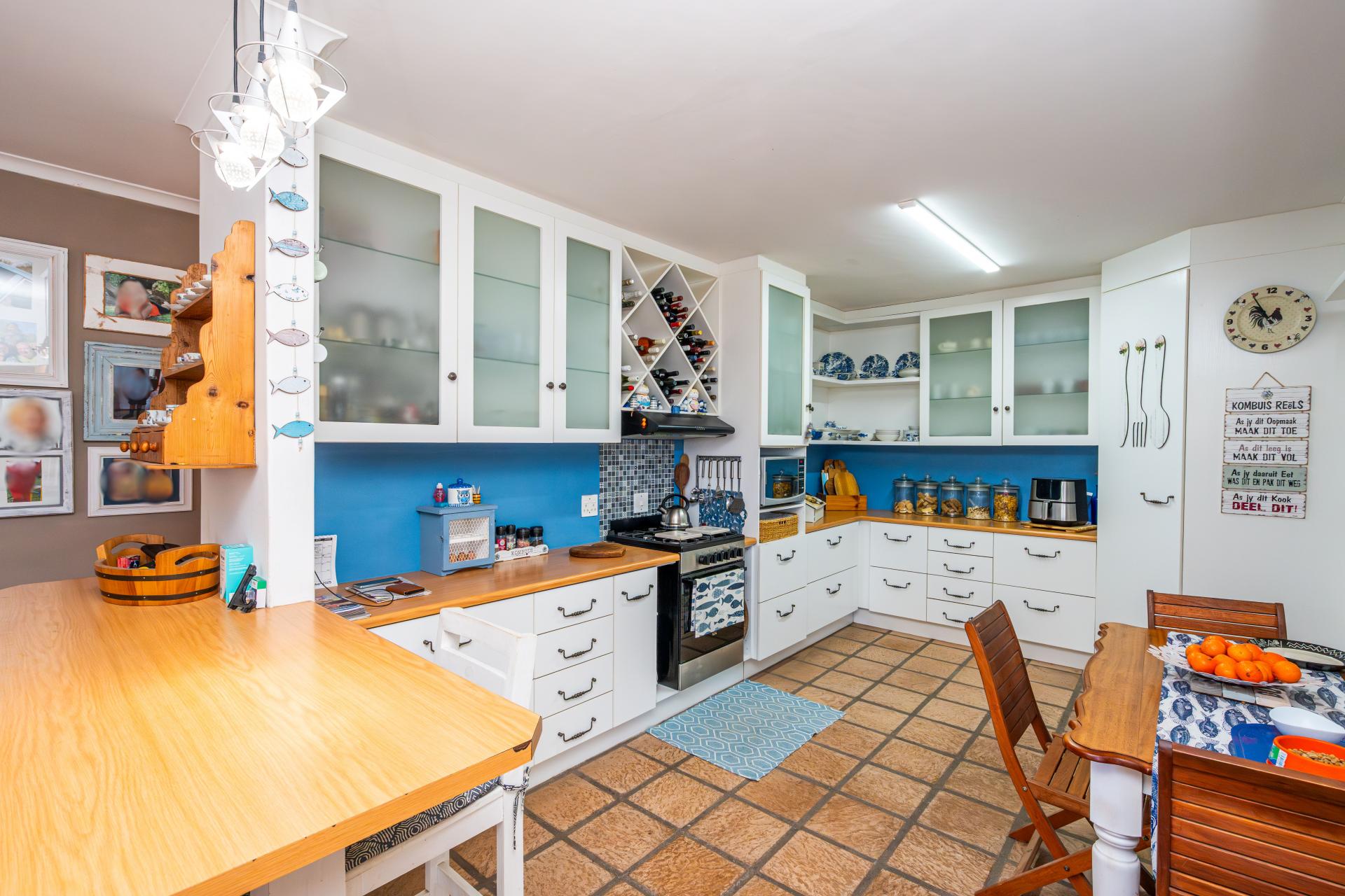 A staircase leads to the upper level, where a spacious entertainment area showcases beautiful views of the Langebaan Lagoon. Complete with a built-in bar, kitchenette, built-in braai, Dover stove, and a guest bathroom, this area is designed for hosting. Sliding doors extend the space to an enclosed balcony with a built-in pizza oven – perfect for year-round gatherings.