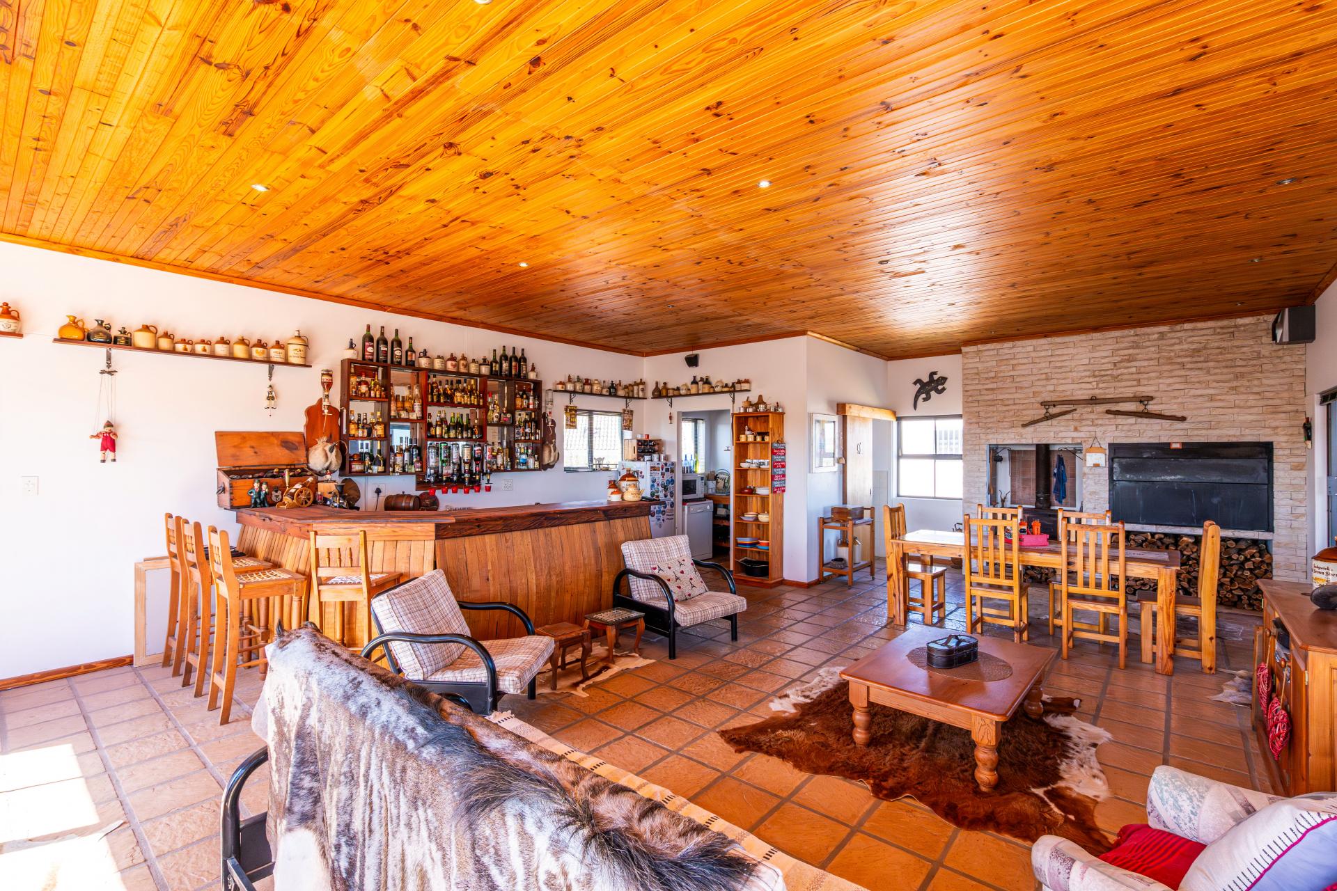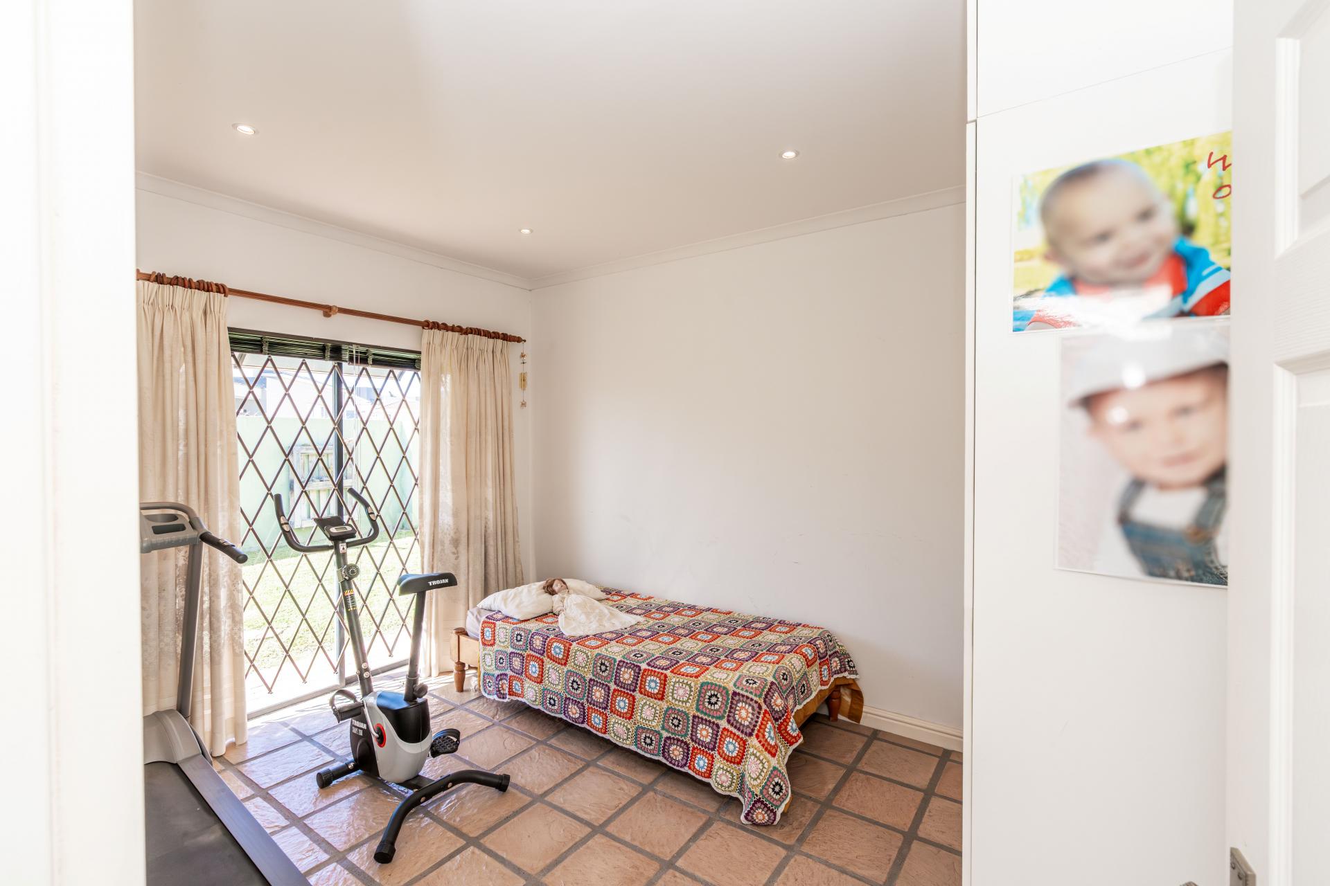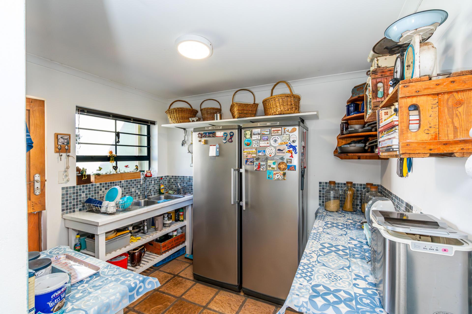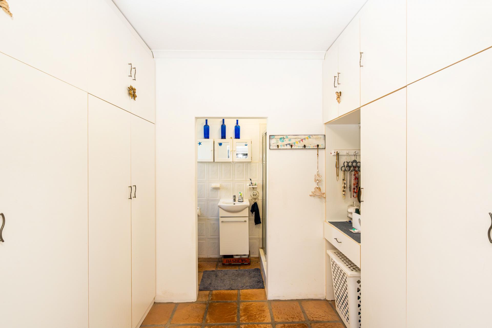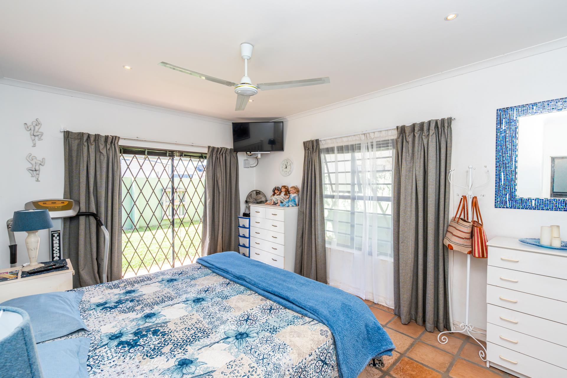 A staircase leads to the upper level, where a spacious entertainment area showcases beautiful views of the Langebaan Lagoon. Complete with a built-in bar, kitchenette, built-in braai, Dover stove, and a guest bathroom, this area is designed for hosting. Sliding doors extend the space to an enclosed balcony with a built-in pizza oven – perfect for year-round gatherings.