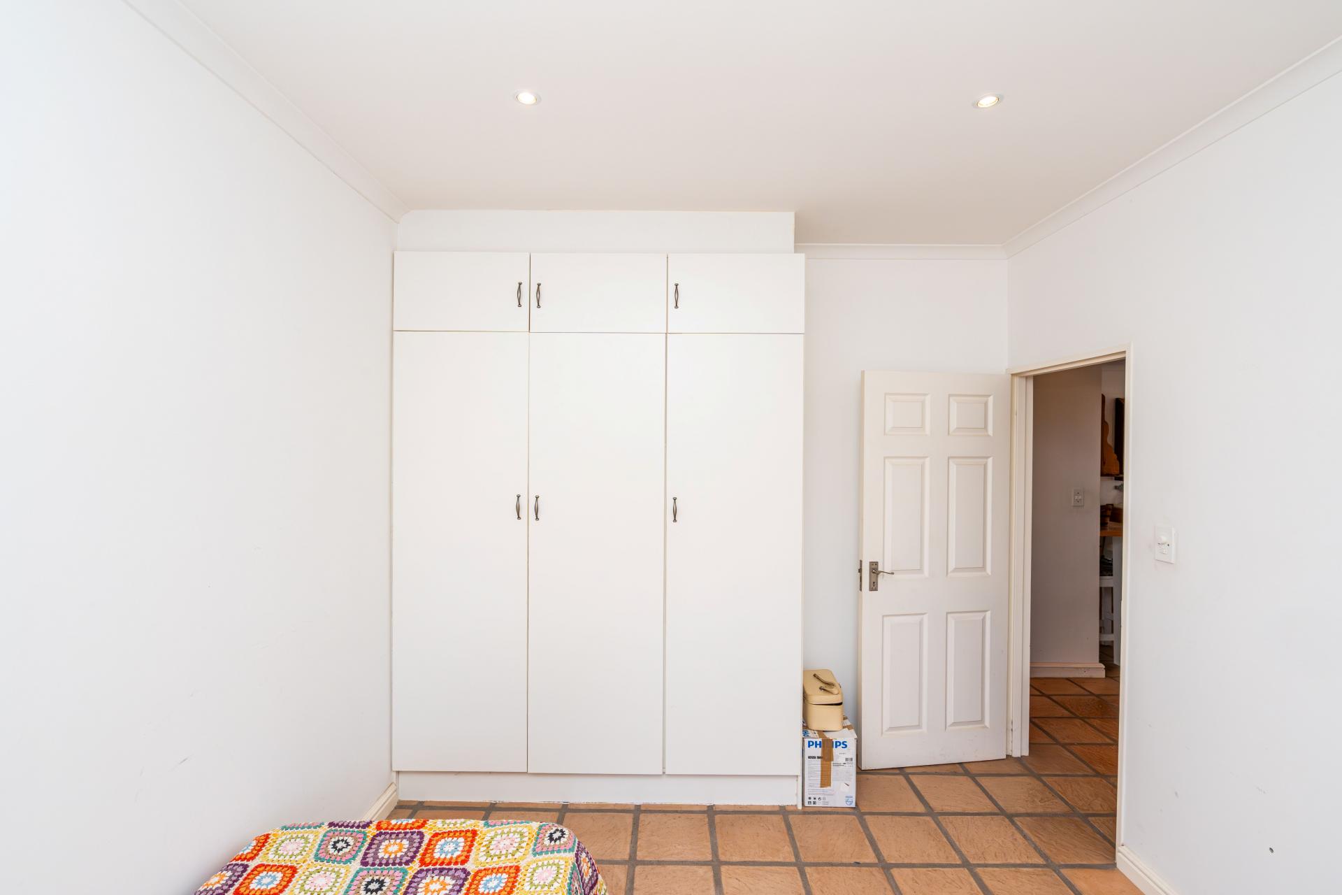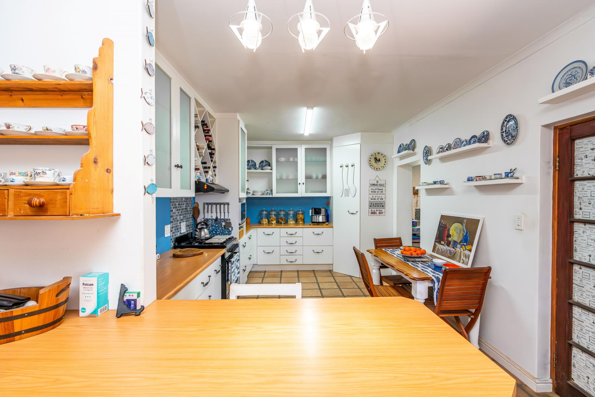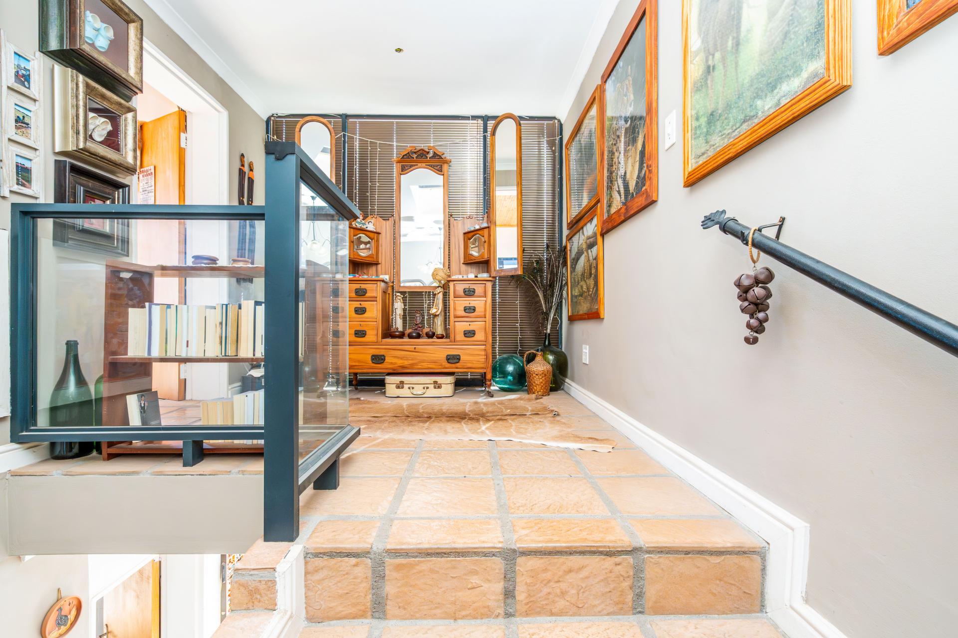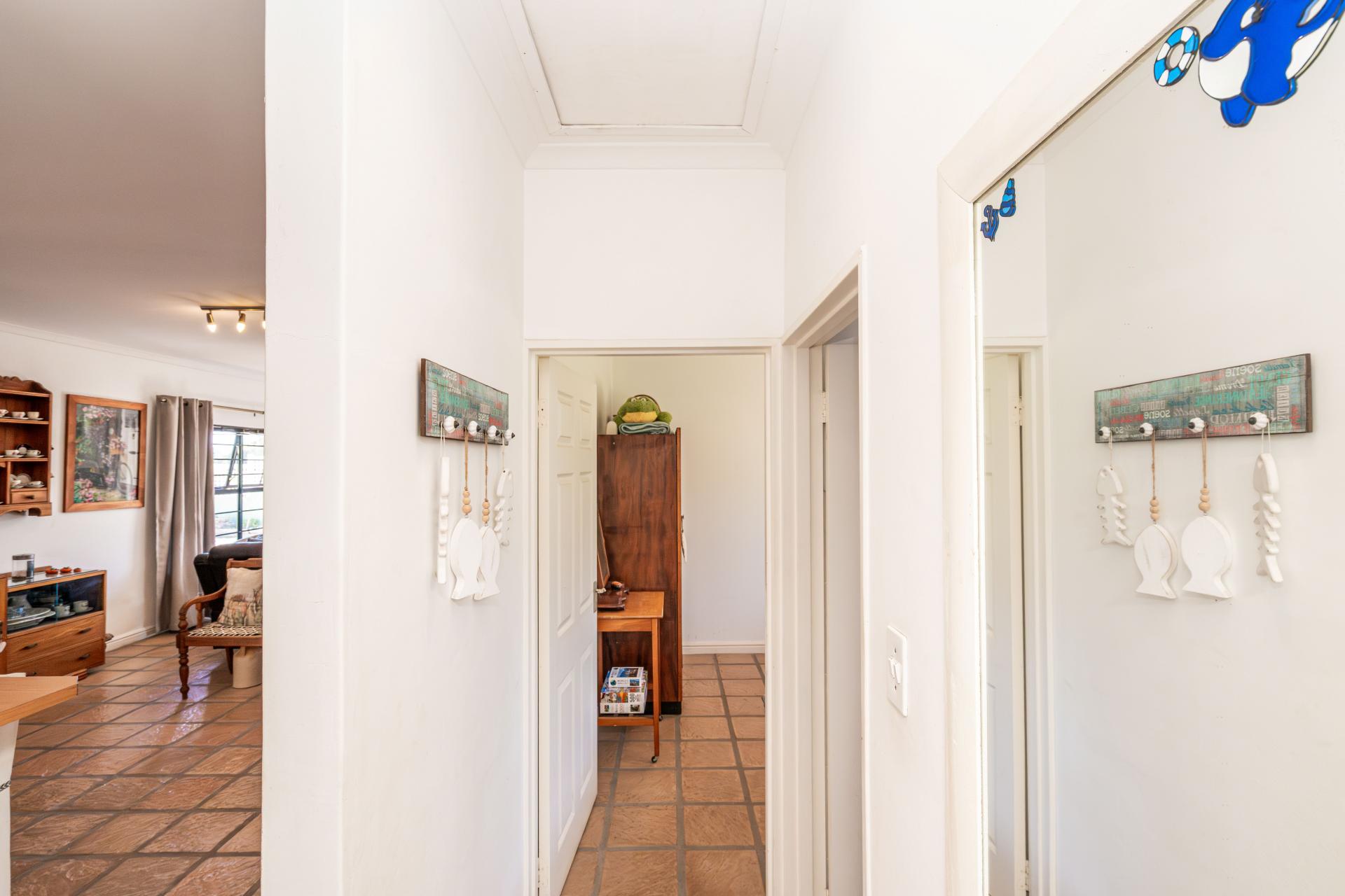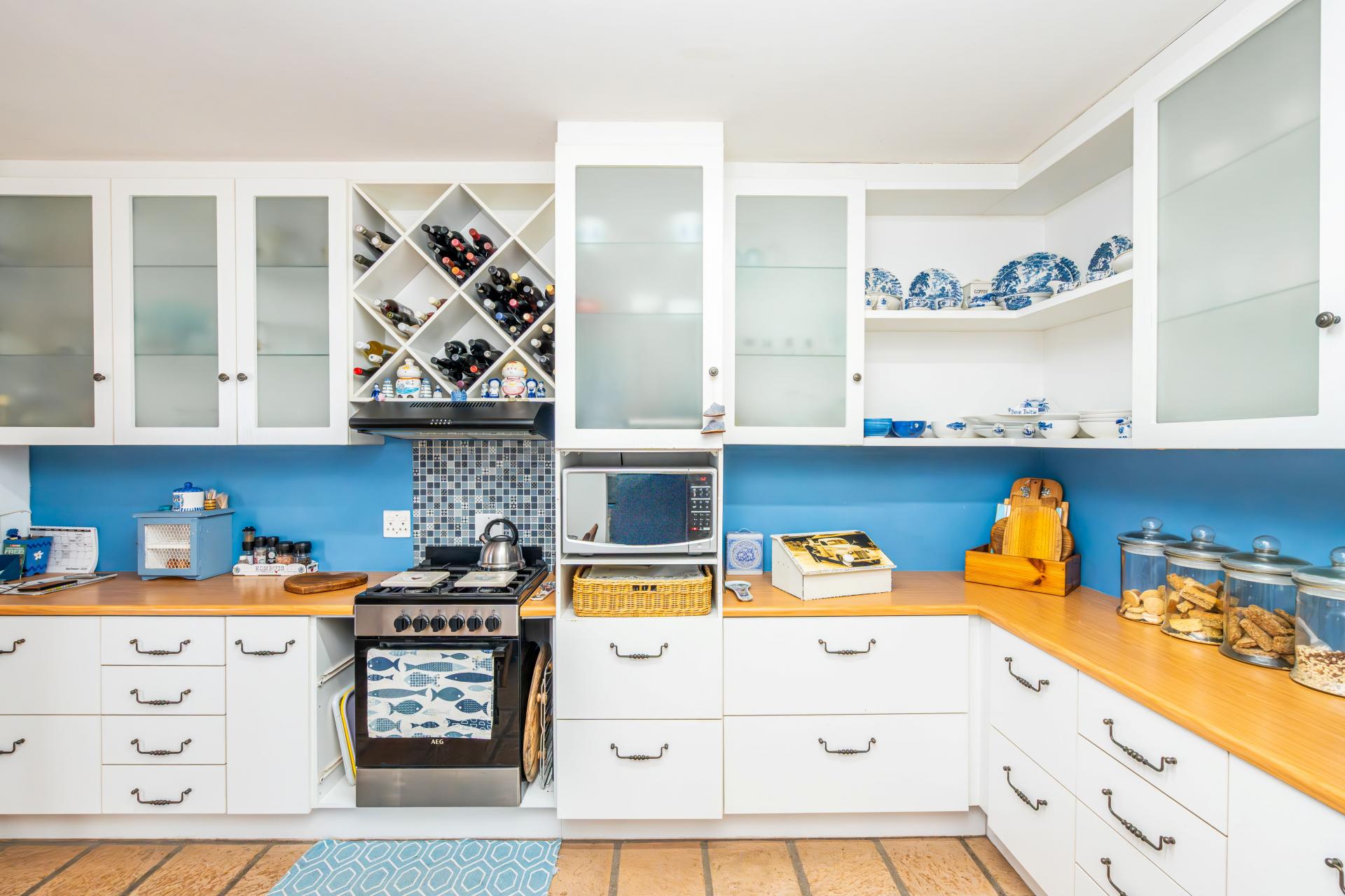 A staircase leads to the upper level, where a spacious entertainment area showcases beautiful views of the Langebaan Lagoon. Complete with a built-in bar, kitchenette, built-in braai, Dover stove, and a guest bathroom, this area is designed for hosting. Sliding doors extend the space to an enclosed balcony with a built-in pizza oven – perfect for year-round gatherings.