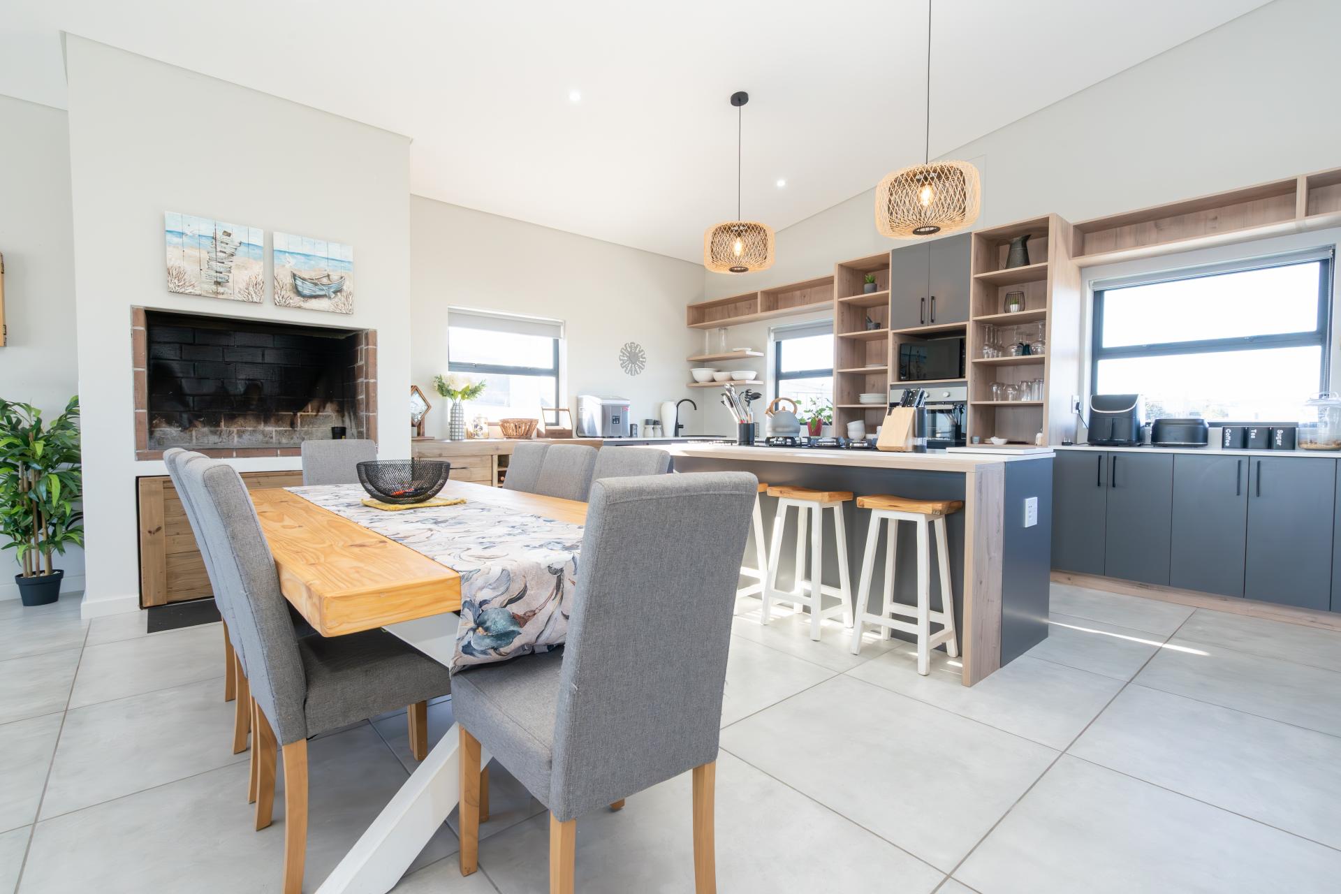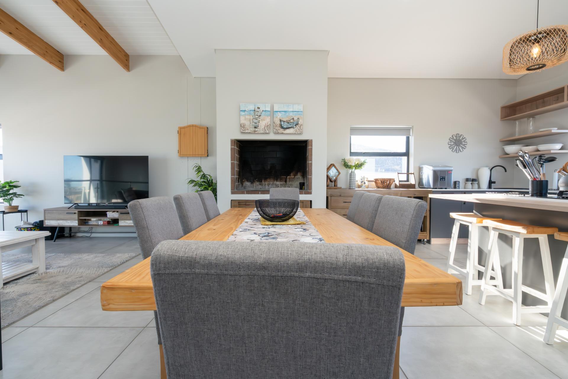 Open-plan layout includes a dining area, second lounge, and built-in fireplace — perfect for family gatherings or hosting guests.