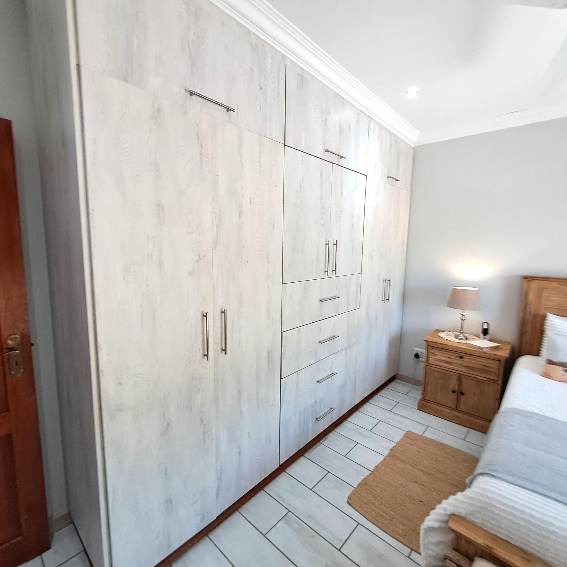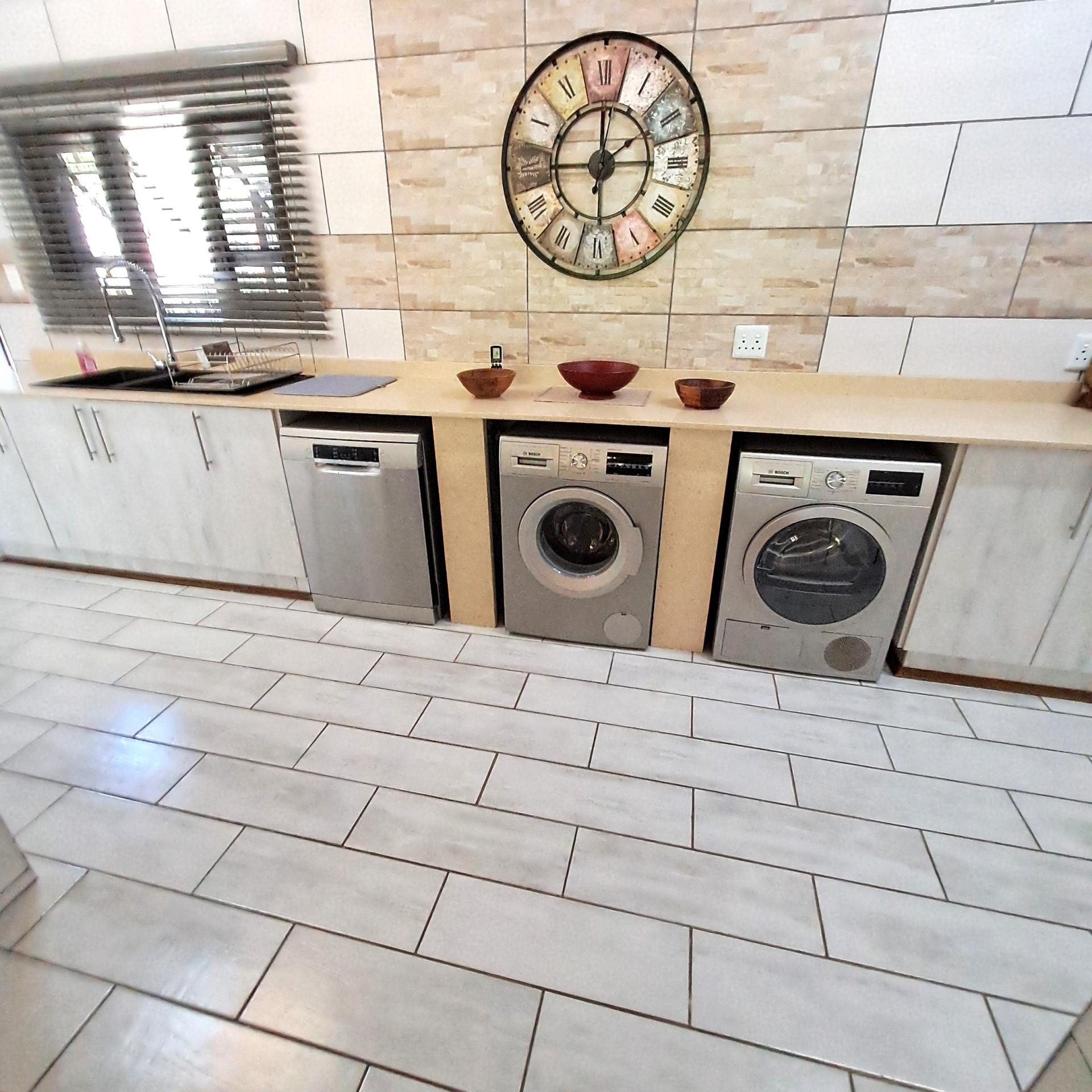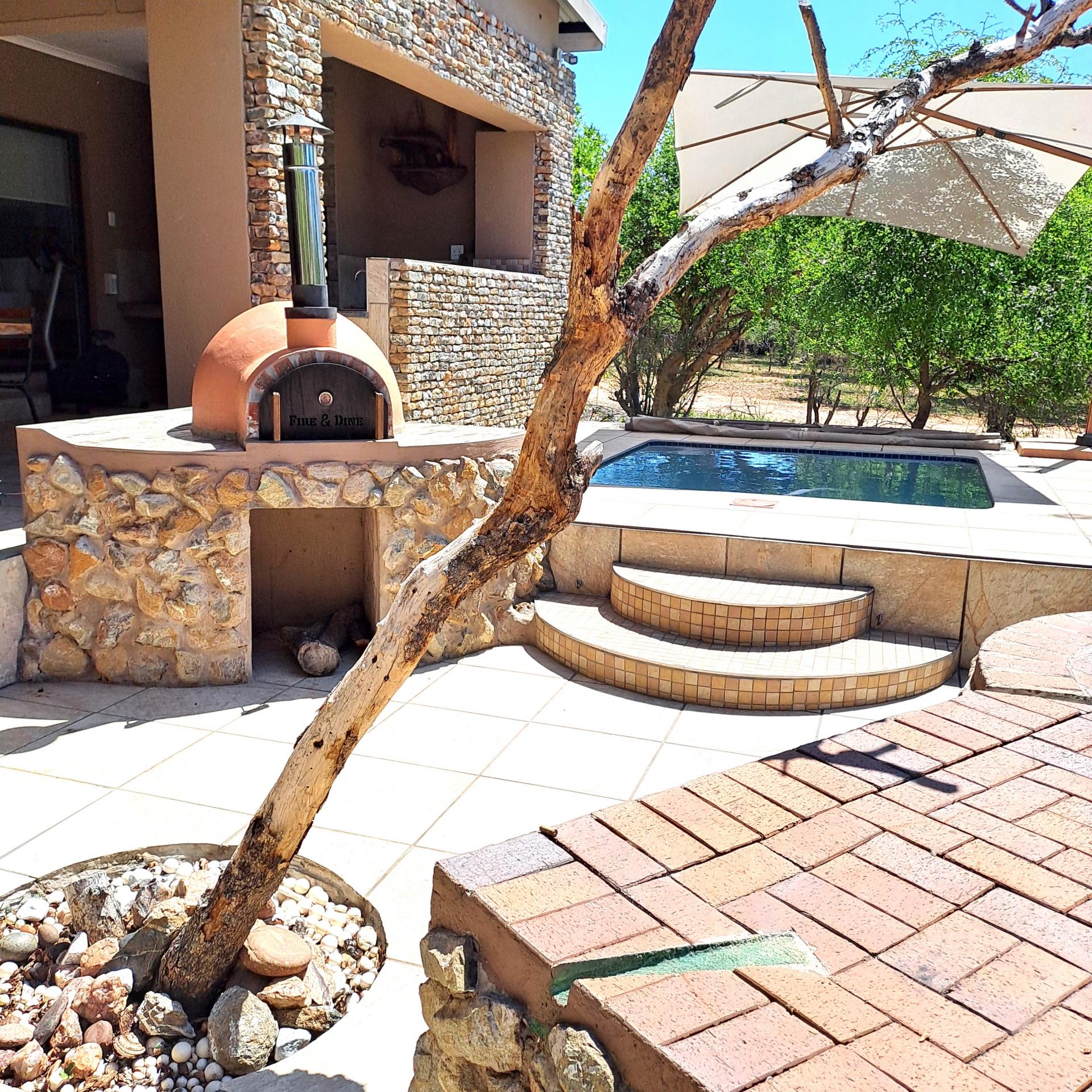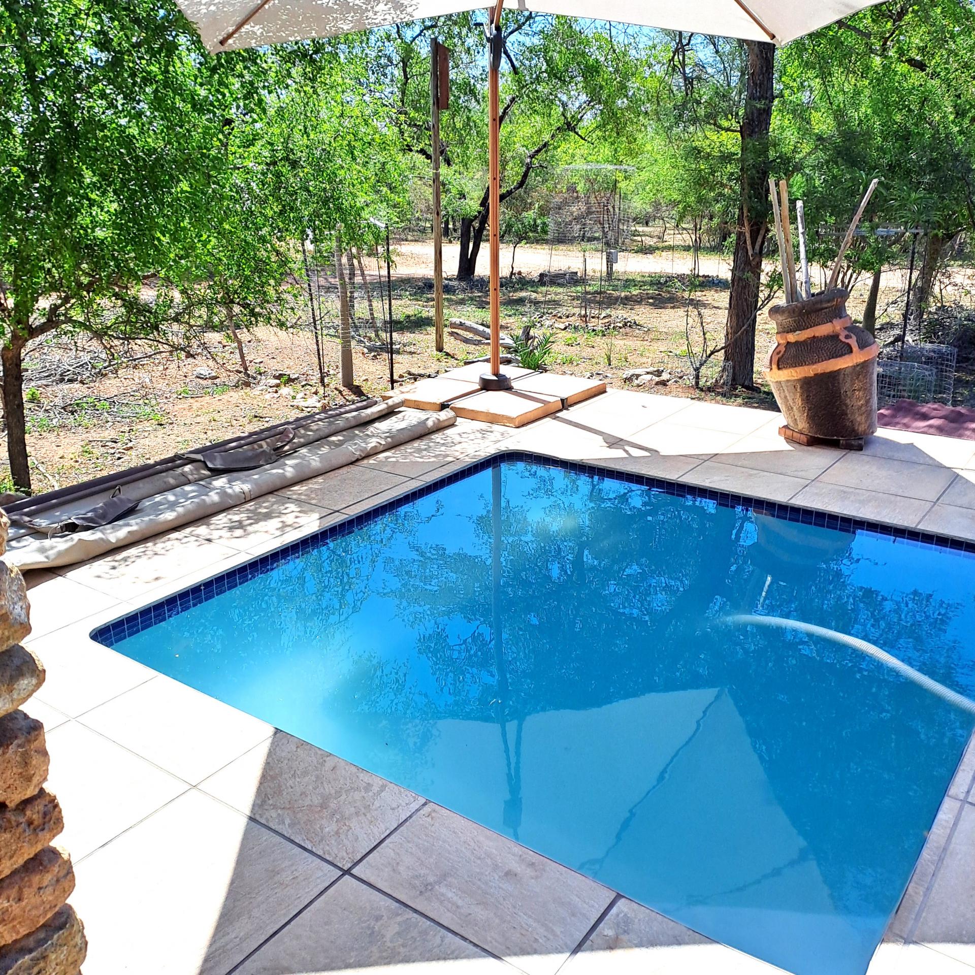 This 3-bedroom house with en-suite bathrooms and a study room is designed for comfort and thoughtfully planned with everything needed for a durable interior finish. All rooms feature beautiful built-in cupboards. The entire house is also equipped with air conditioning and fans. Large aluminium folding glass doors greet you at the entrance and all windows and doors have aluminium mesh for mosquito protection and security. The separate kitchen, which includes space for a washing machine and dishwasher is equipped with plenty of built-in cupboards. There is a double 90 square meter garage and a carport, as well as an 8.5 KVA solar system with an inverter and 12 panels on the roof The property also has cameras around the house and a complete security system. The courtyard is paved with paving bricks, featuring an outdoor shower and a wash basis. A borehole with a 5L tank and 3x 1L tanks are available for indoor and outdoor use when needed.. Enjoy a cooling splash pool, a pizza oven and built-in seating to entertain guests with delicious pizzas and drinks for a great gathering. On a spacious covered veranda, there is a build-in braai and a wash basin.. This home is situated on a 2624 square meter plot, where wild animals roam freely, adding to the peaceful atmosphere of the house in the bush. An adjacent plot next to the house is also available for purchase. This gem of a home is definitely a must-see, and you will not be disappointed