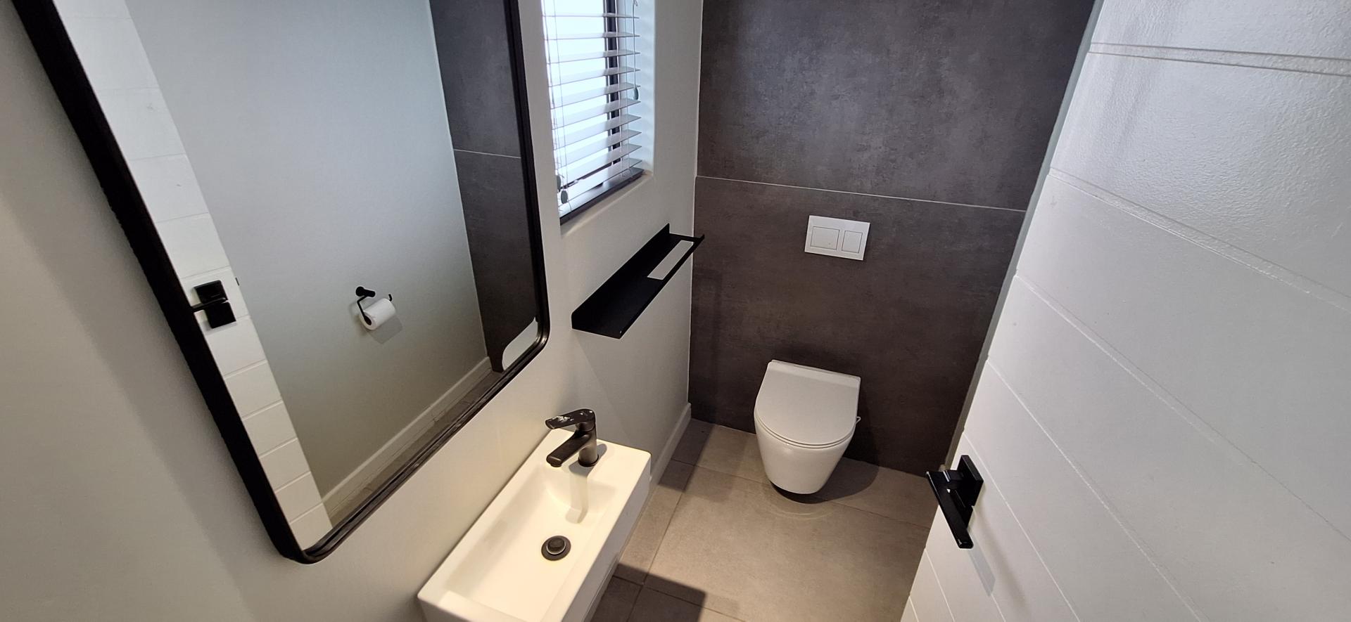 A guest bathroom is conveniently located near the stylish, wood-clad staircase leading to the upper level. Upstairs, a short passage with a built-in linen cupboard connects the bedrooms.