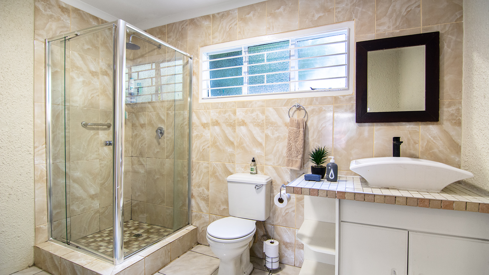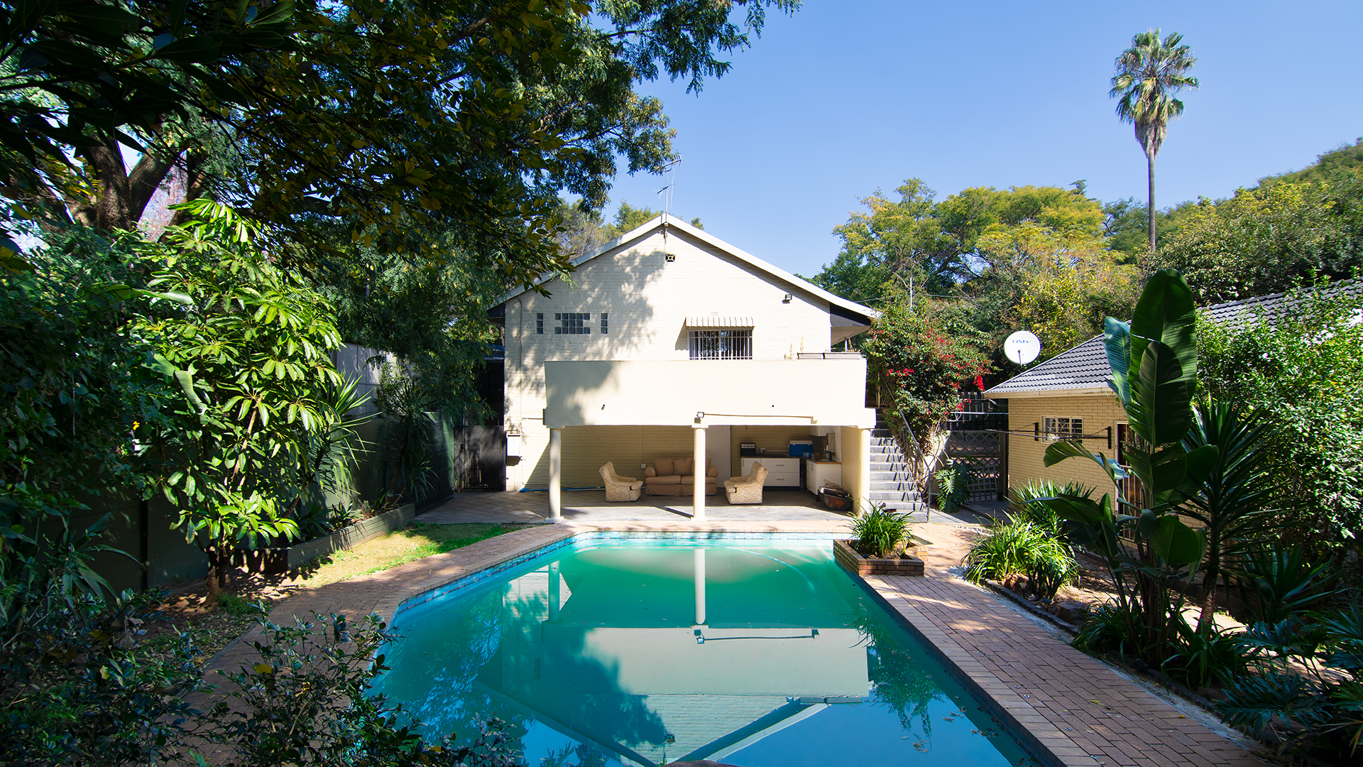 Three generously sized bedrooms are thoughtfully positioned away from the main living areas, ensuring peace and privacy. The main bedroom has a large, full ensuite bathroom and opens onto a spacious patio overlooking the pool and garden — your own tranquil retreat.