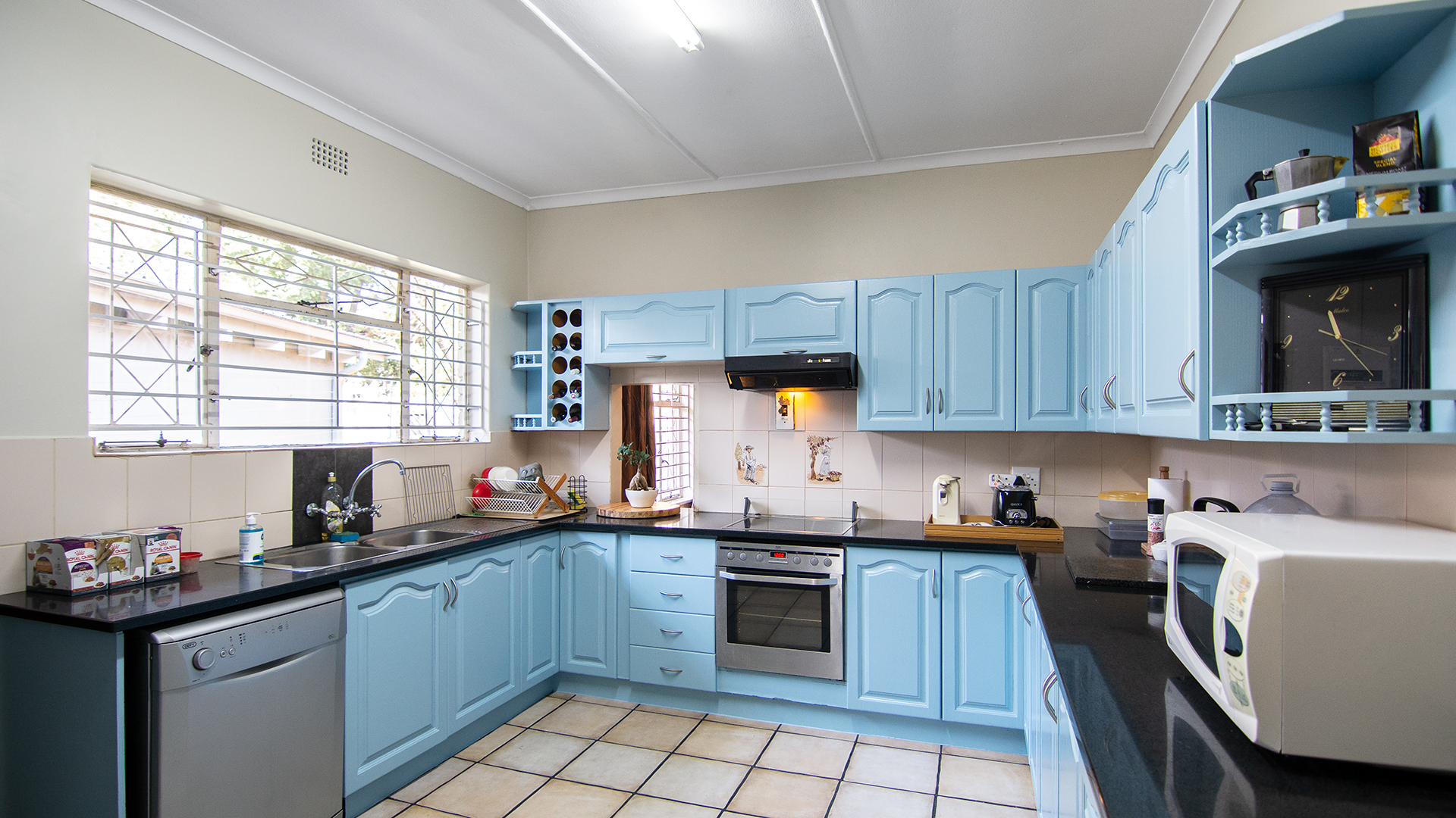 The spacious kitchen is filled with natural light and ample cupboard space. There’s also potential to reconfigure the layout into a modern open-plan design that seamlessly connects with the living area.