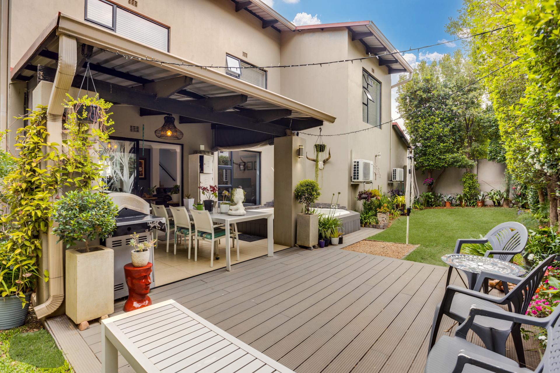 Situated on a corner stand, this home provides an added sense of privacy, enhanced by a generous garden space. The open-plan layout downstairs includes a comfortable living room with air-conditioning, seamlessly connecting to a charming patio. This outdoor oasis features roll-up awnings for protection from the wind and is complete with a functioning Jacuzzi, perfect for relaxation. The adjoining deck and stunning L-shaped garden make it an ideal setting for entertaining or unwinding after a long day.